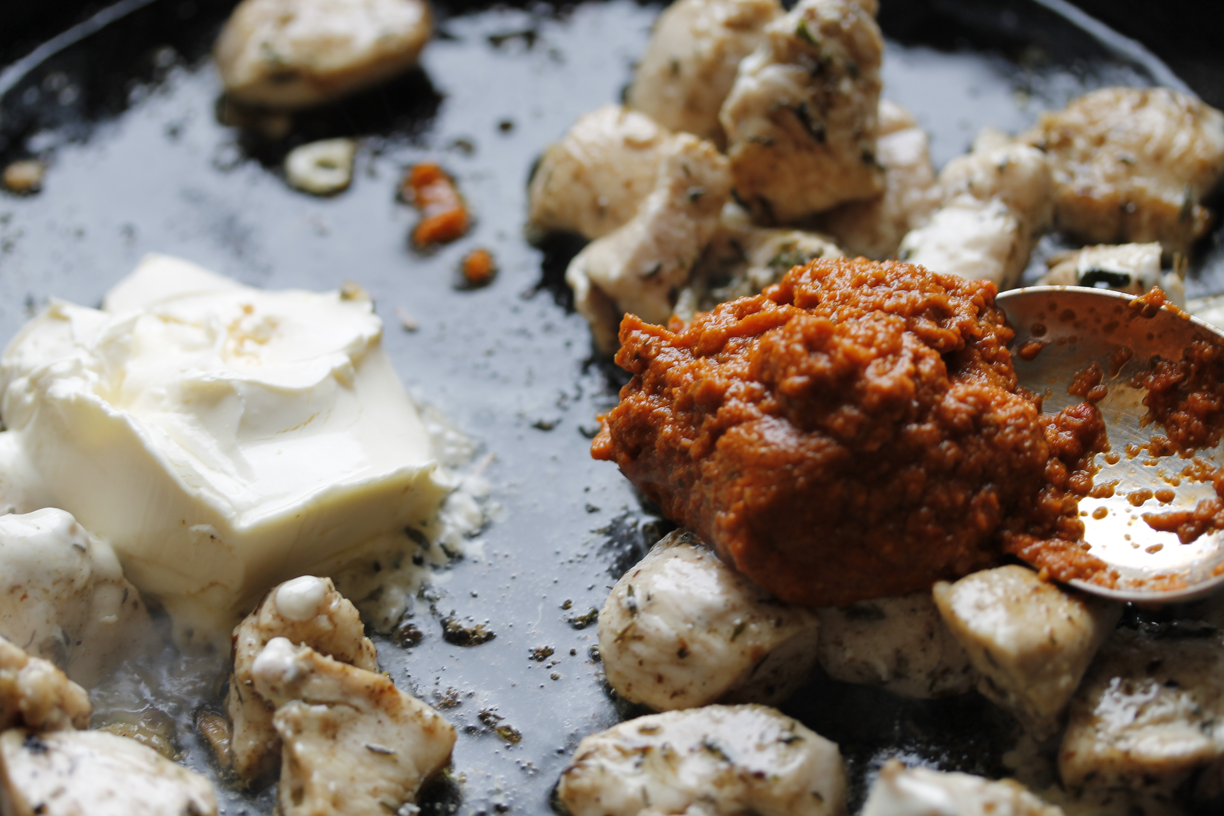 Ég bætti 100 g af rjómaosti og vel kúfaðri matskeið af mauki úr sólþurrkuðum tómötum (eða mætti líka vera rautt pestó) á pönnuna.