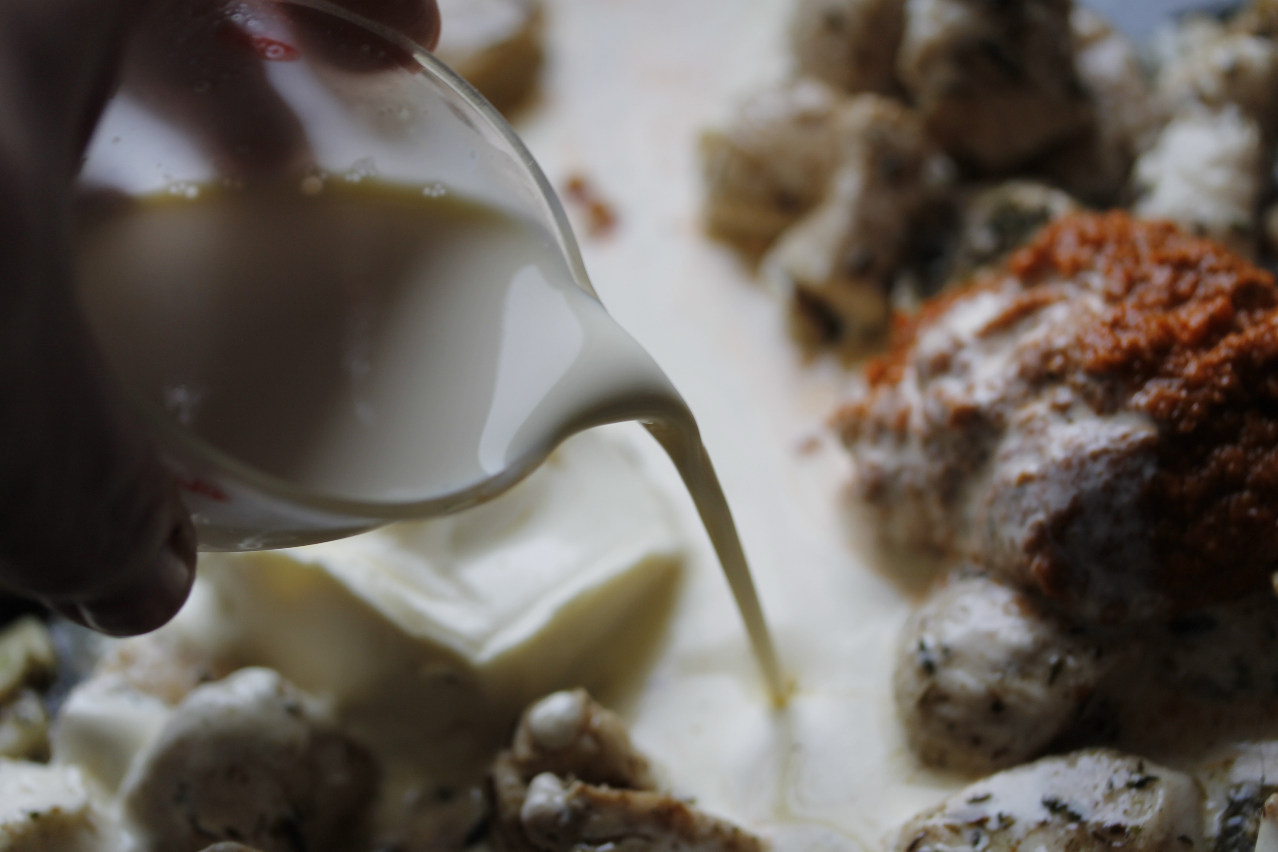 Svo hellti ég 125 ml af rjóma á pönnuna, hrærði og lét malla þar til komin var slétt sósa.