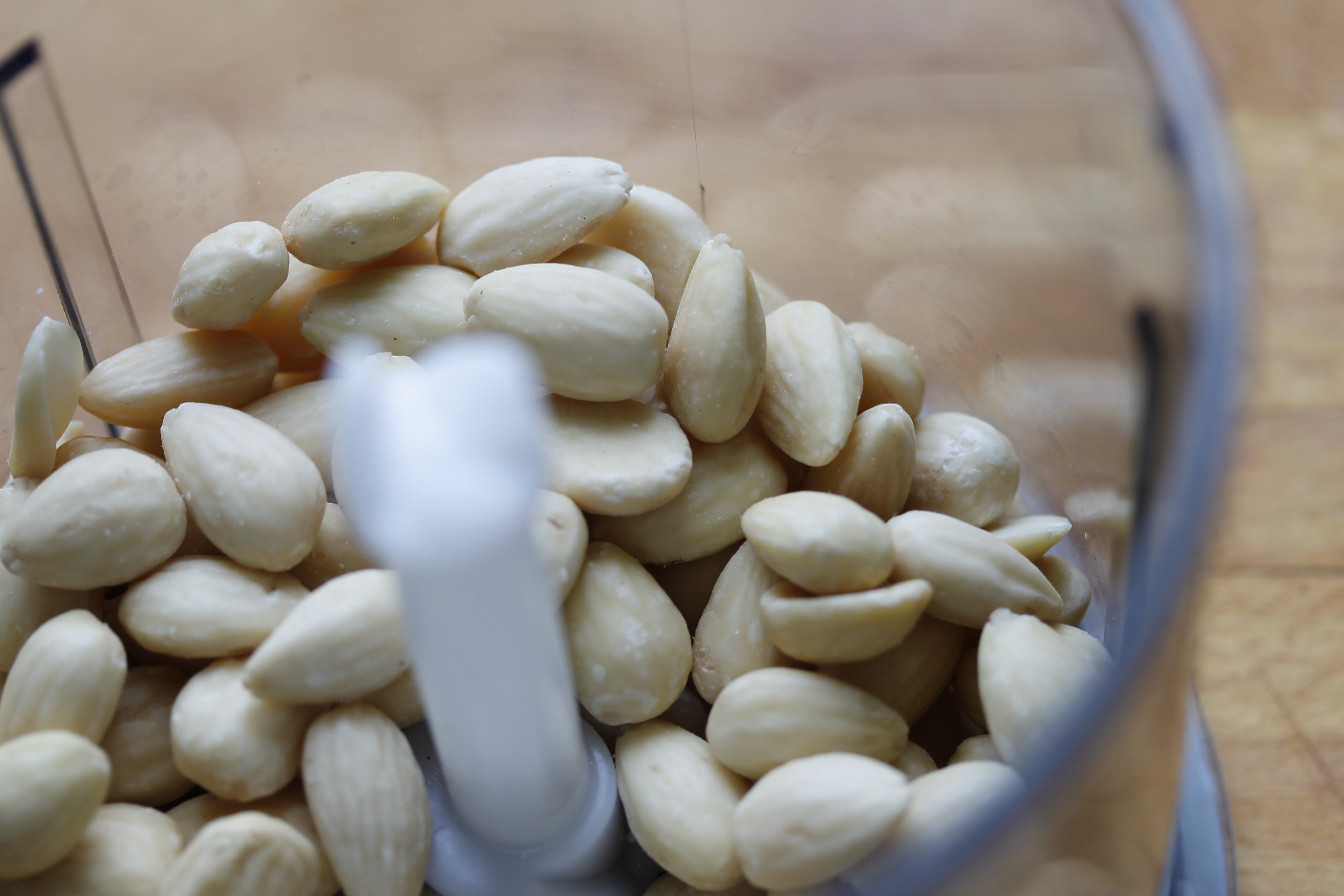 Ég byrjaði á að hita ofninn í 170°C og smyrja lausbotna form – ekki mjög stórt og klippa út kringlótta bökunarpappírsörk og setja á botninn á því. Svo vigtaði ég 150 g af heilum, afhýddum möndlum (þær mættu reyndar alveg vera með hýði) og malaði þær fínt.