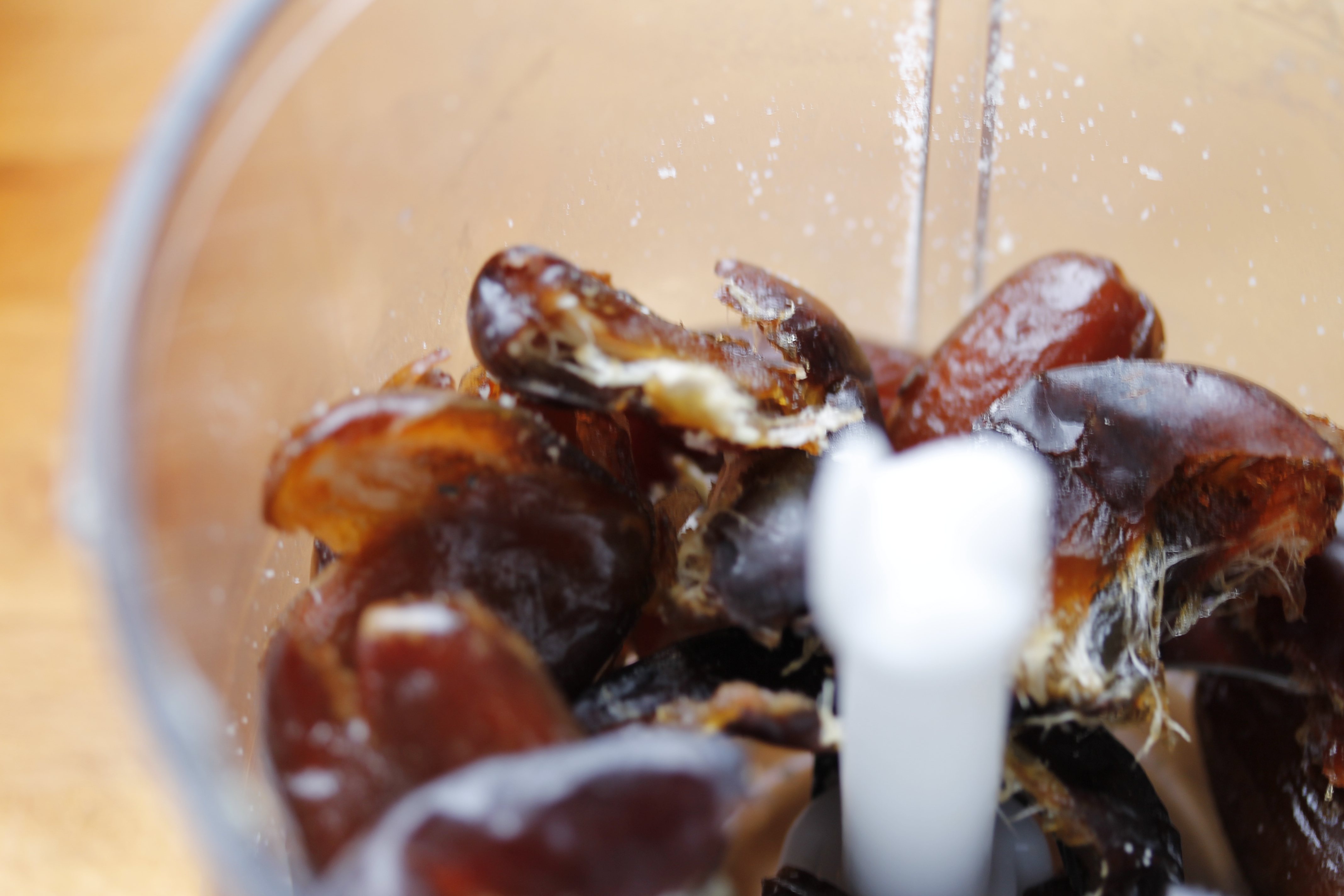Svo steinhreinsaði ég 200 g af mjúkum döðlum (alltsvo ég vigtaði þær eftir að ég hafði fjarlægt steinana) og maukaði þær með 50 g af linu smjöri (mætti líka nota 3 msk af bragðmildri olíu).