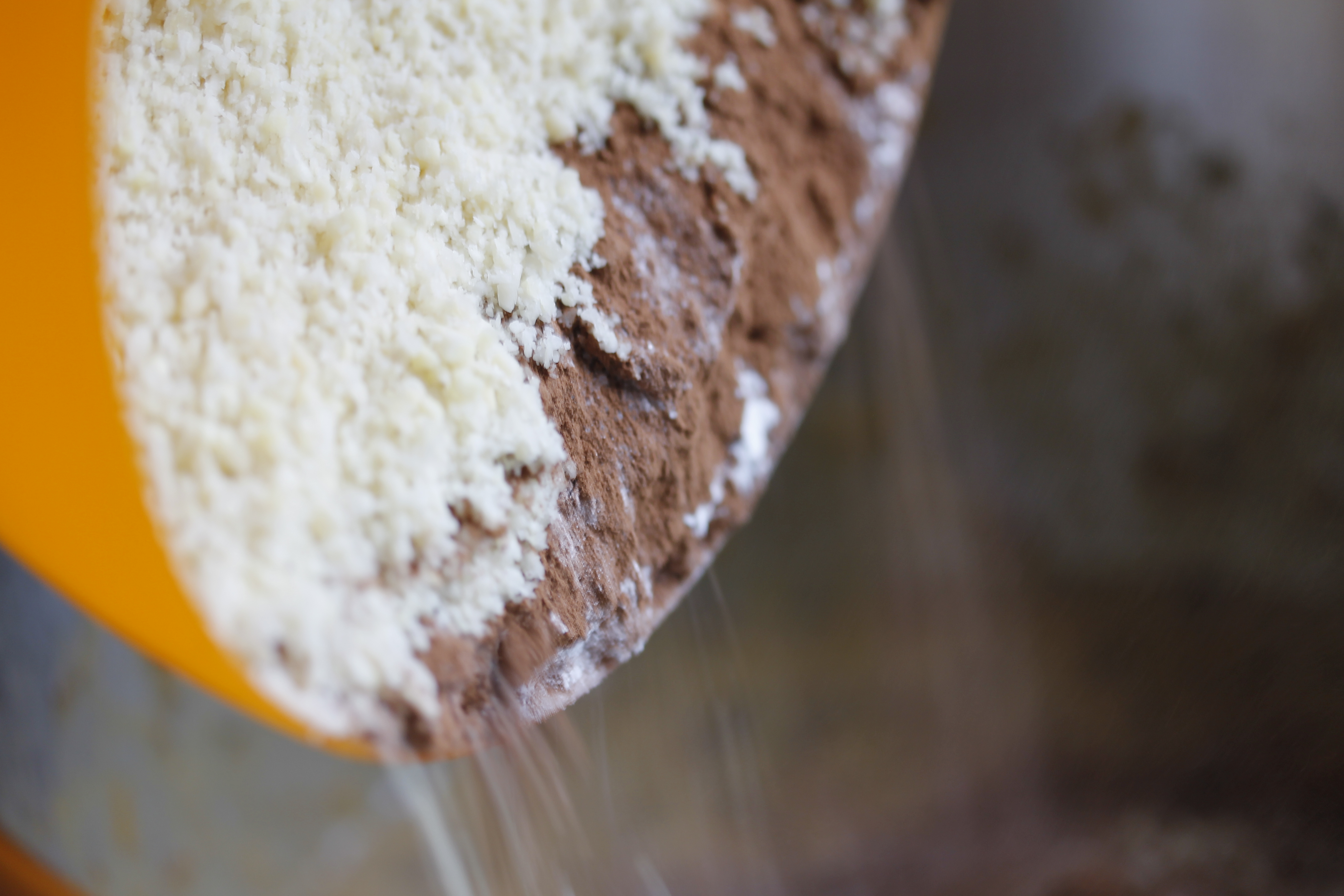Svo setti ég möluðu möndlurnar út í, ásamt 40 g af kakódufti, 1 tsk af lyftidufti og 1/4 tsk af salti, og hrærði þessu saman við döðlurnar og eggin.