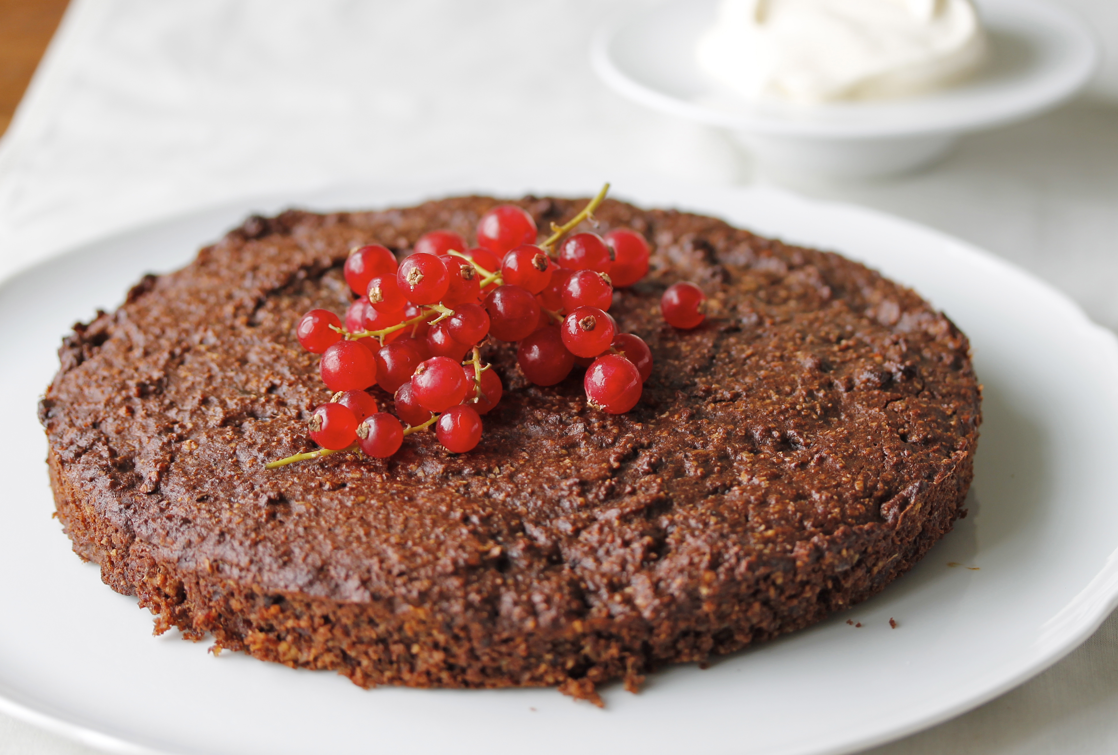 Ég átti rifsber og skreytti kökuna með þeim. En það má alveg eins nota jarðarber, eða sósu – sæta eða ósæta eftir óskum – úr frosnum berjum.