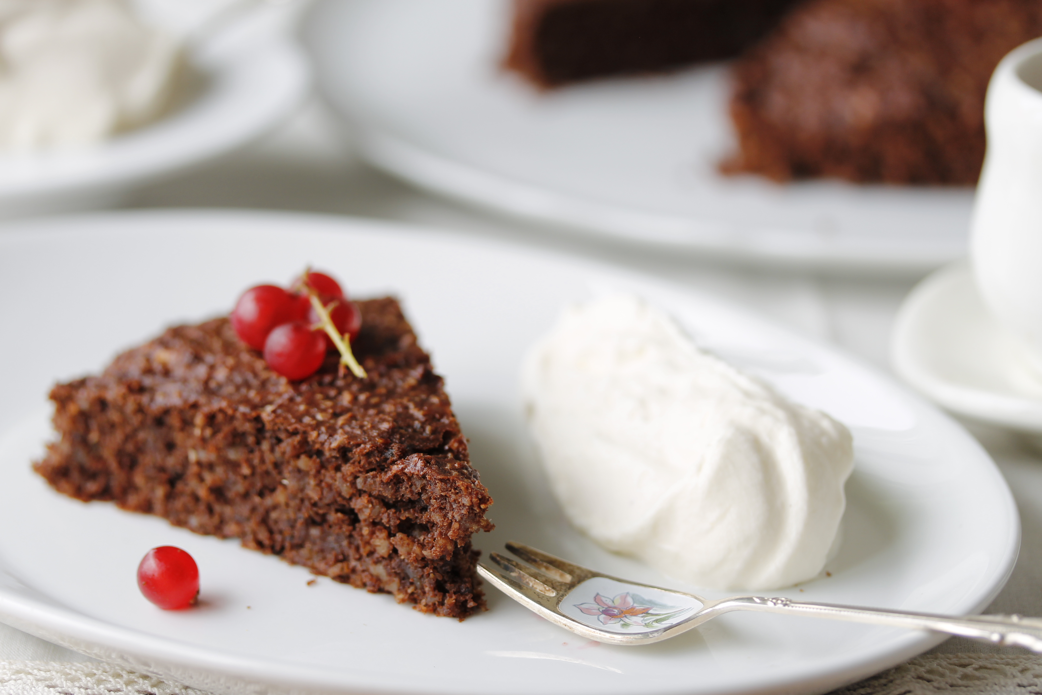 Ferlega fín kaka, mjög góð með rjóma 🙂 Ég setti svolítið hveiti og kókos á móti möndlunum og notaði limebörk og vanillu sem bragðefni. Svo fengu nokkrar apríkósur að fljóta með döðlunum. Börnin voru sátt með þessa súkkulaðiköku, fannst hún engu síðri en hinar sætu sætu.