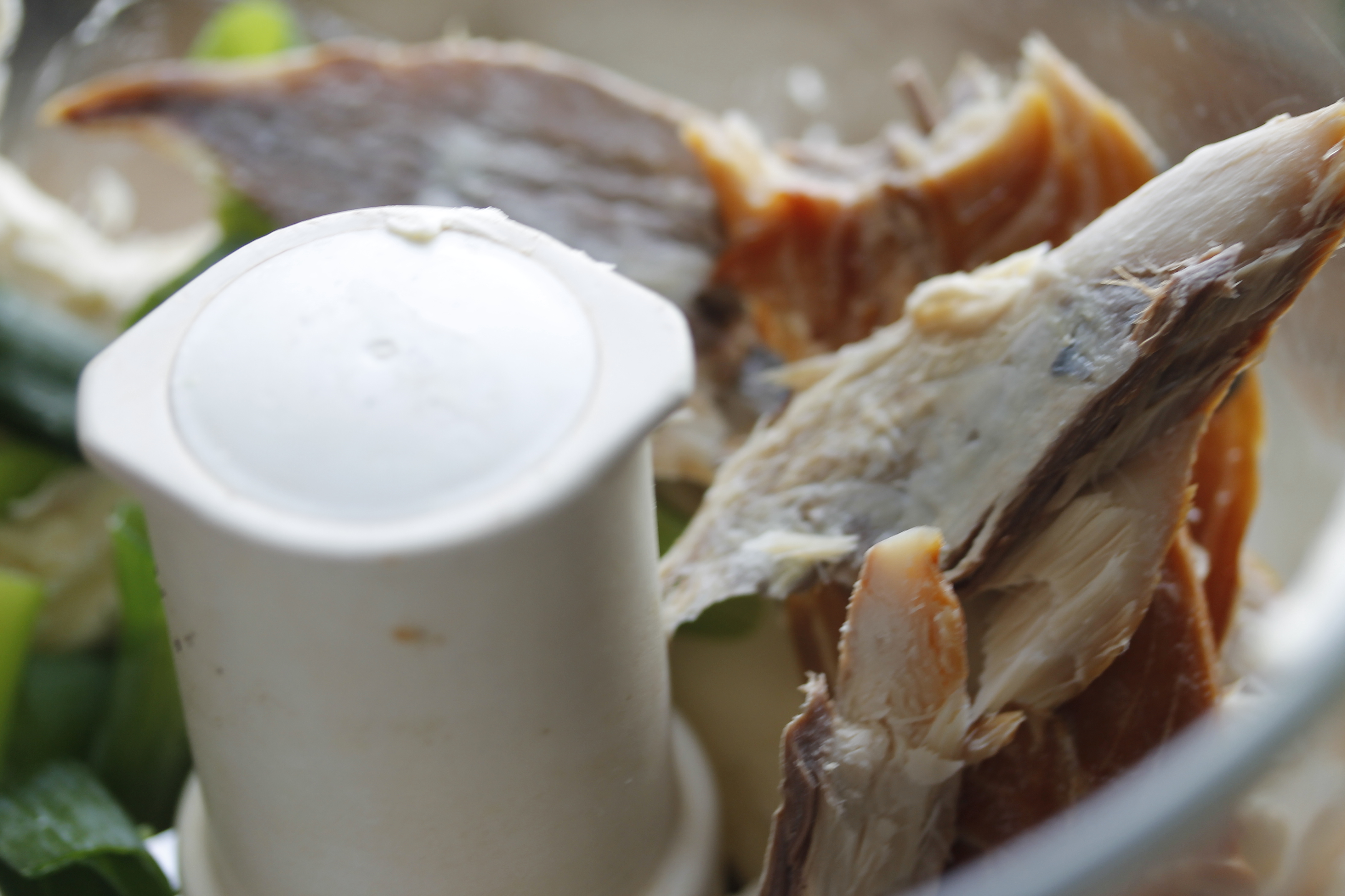 Ég byrjaði á því að plokka roðið af makrílnum og setja hann í matvinnsluvél ásamt svona 150 g af rjómaosti og þremur vorlaukum, söxuðum. Lét vélina ganga þar til allt var maukað vel saman.