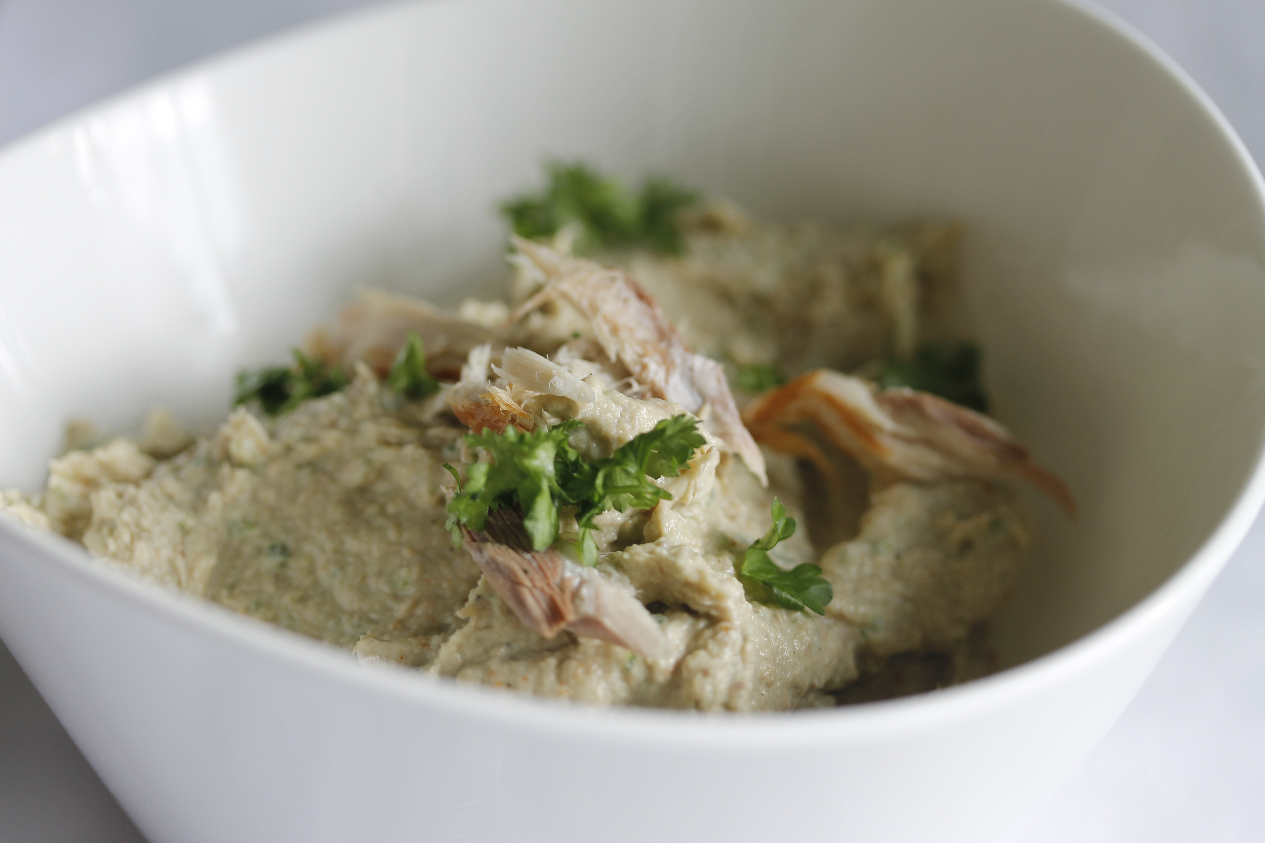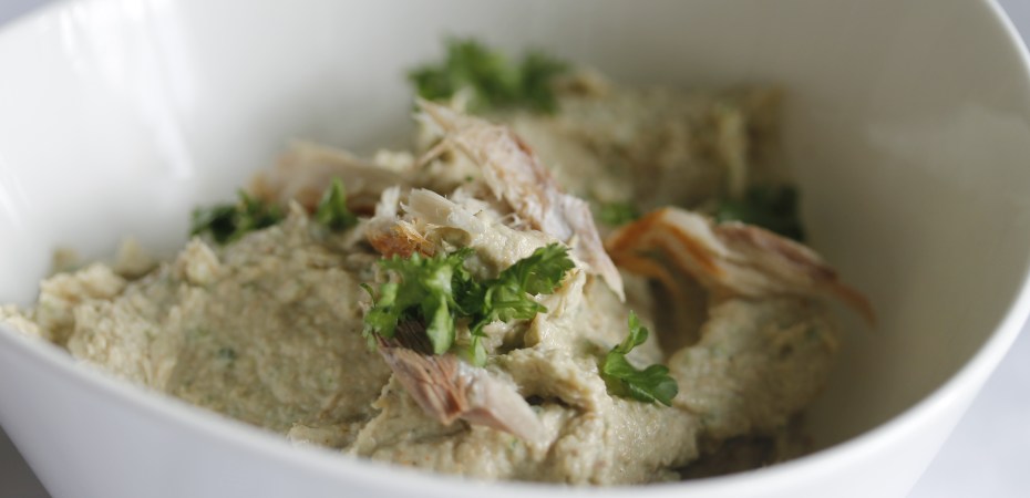 Og þá er þetta nú bara komið. Ég setti maukið í skál, plokkaði nokkrar flögur af makríl sem höfðu orðið eftir á roðinu af og setti þær ofan á til skrauts og svo átti ég smávegis steinselju. En hvorttveggja er bara skraut og engin þörf á því.
