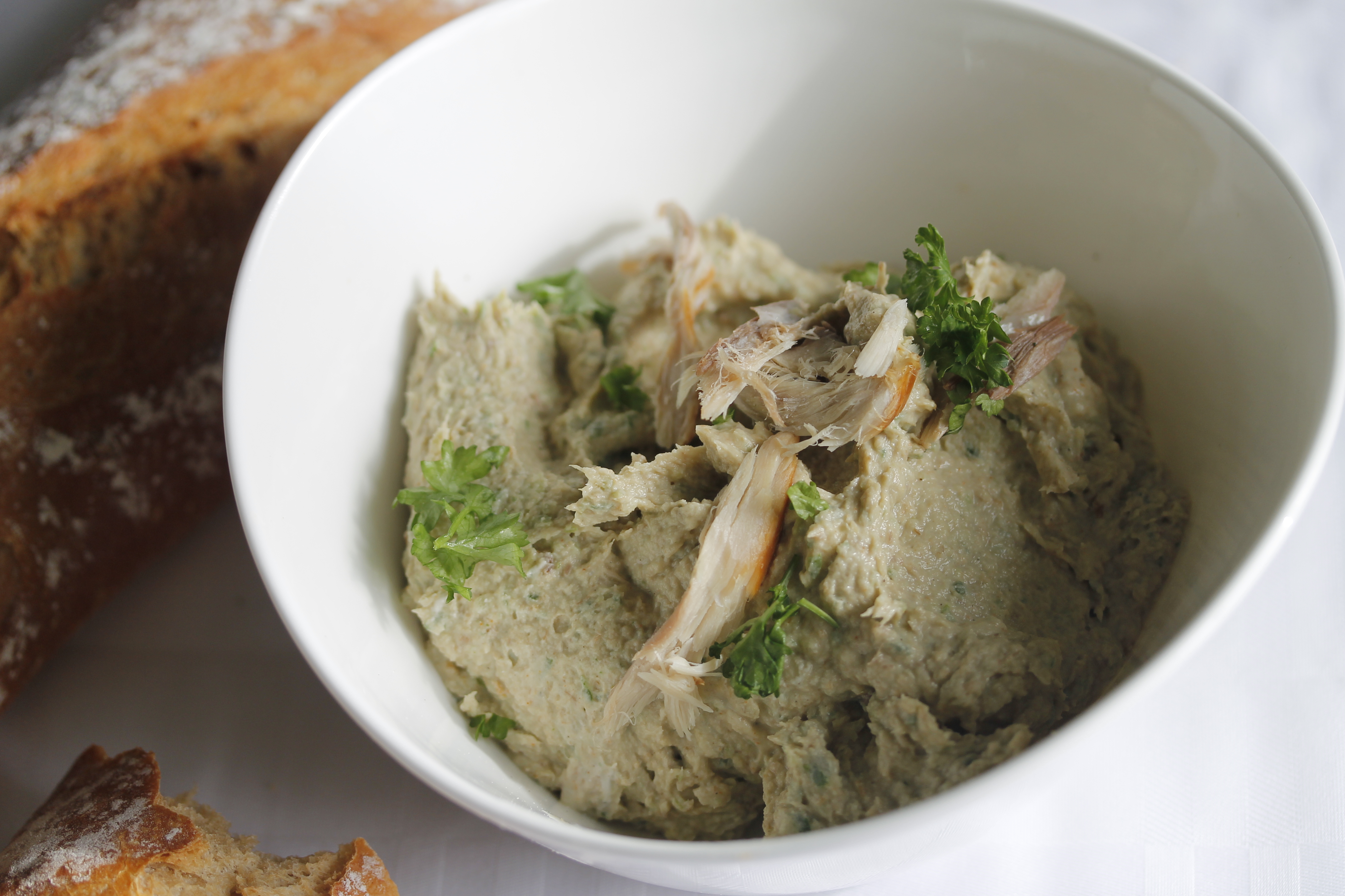 Uppskriftin er mjög einföld og það tekur innan við fimm mínútur að gera þetta. Makríllinn sem ég átti var heitreyktur handfæraveiddur makríll frá Hornafirði, tvö lítil flök – vigtaði þau reyndar ekki en það er heldur ekki svo nauið. Einhversstaðar á bilinu 100-150 g, kannski.