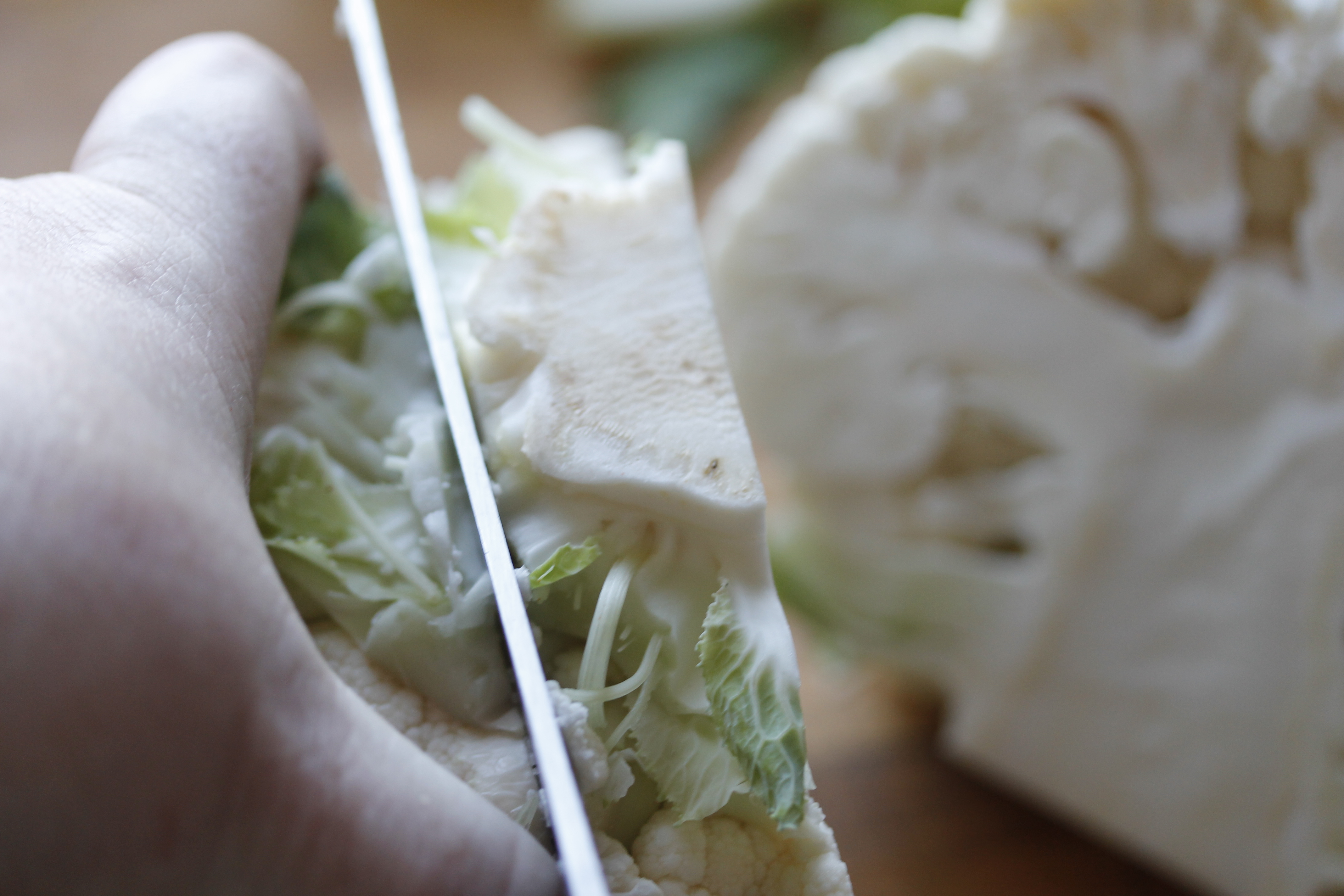 Ég kveikti á ofninum og stillti hann á 180°C. Svo tók ég blómkálshausinn og skar hann í sundur í miðju, í gegnum stilkinn, og skar svo eina sneið, 2½-3 cm þykka, af hvorum helmingi.