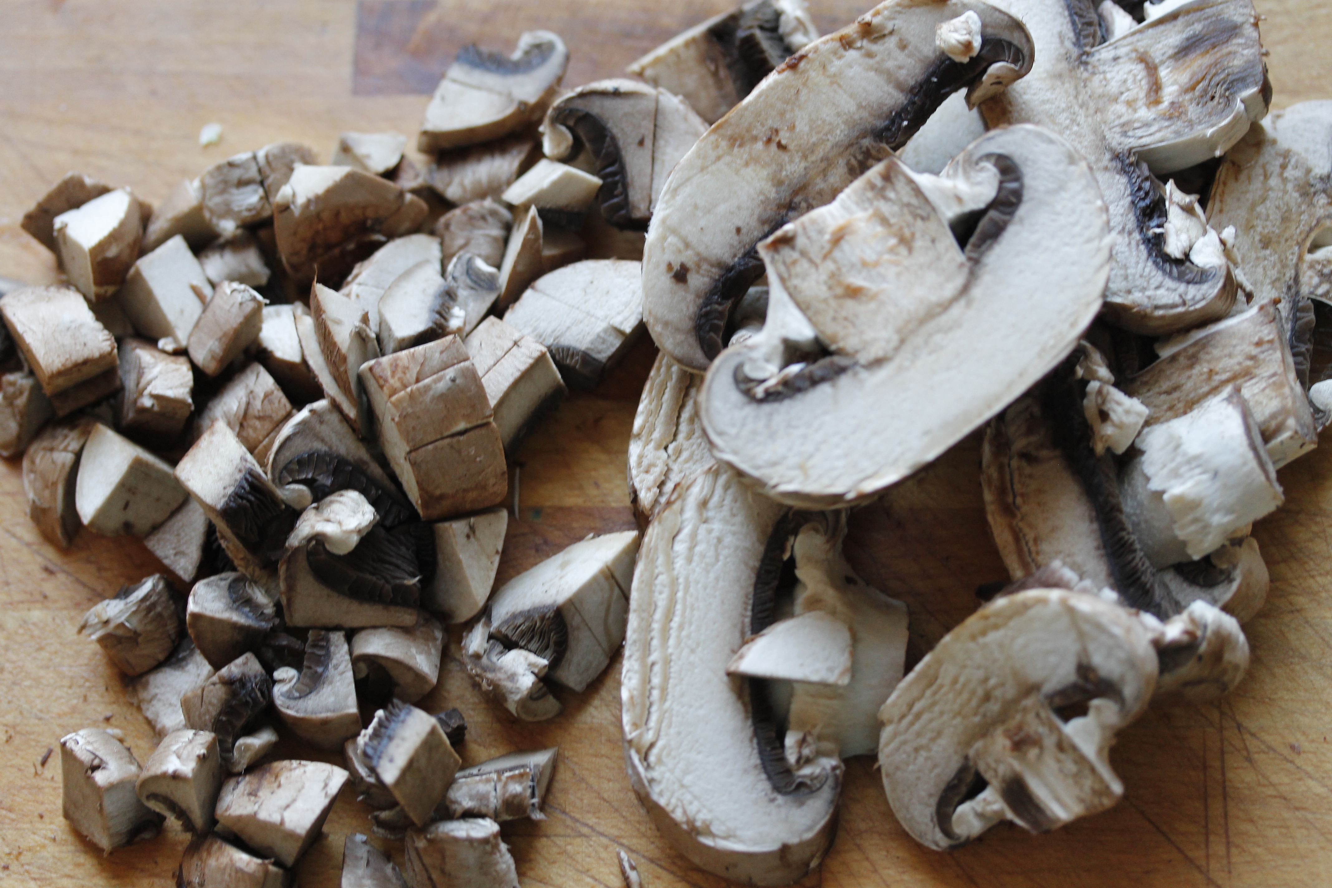 Skerðu sveppina í sneiðar, tók frá miðjusneiðarnar (þær sem voru með stilk) en skar afganginn í bita.