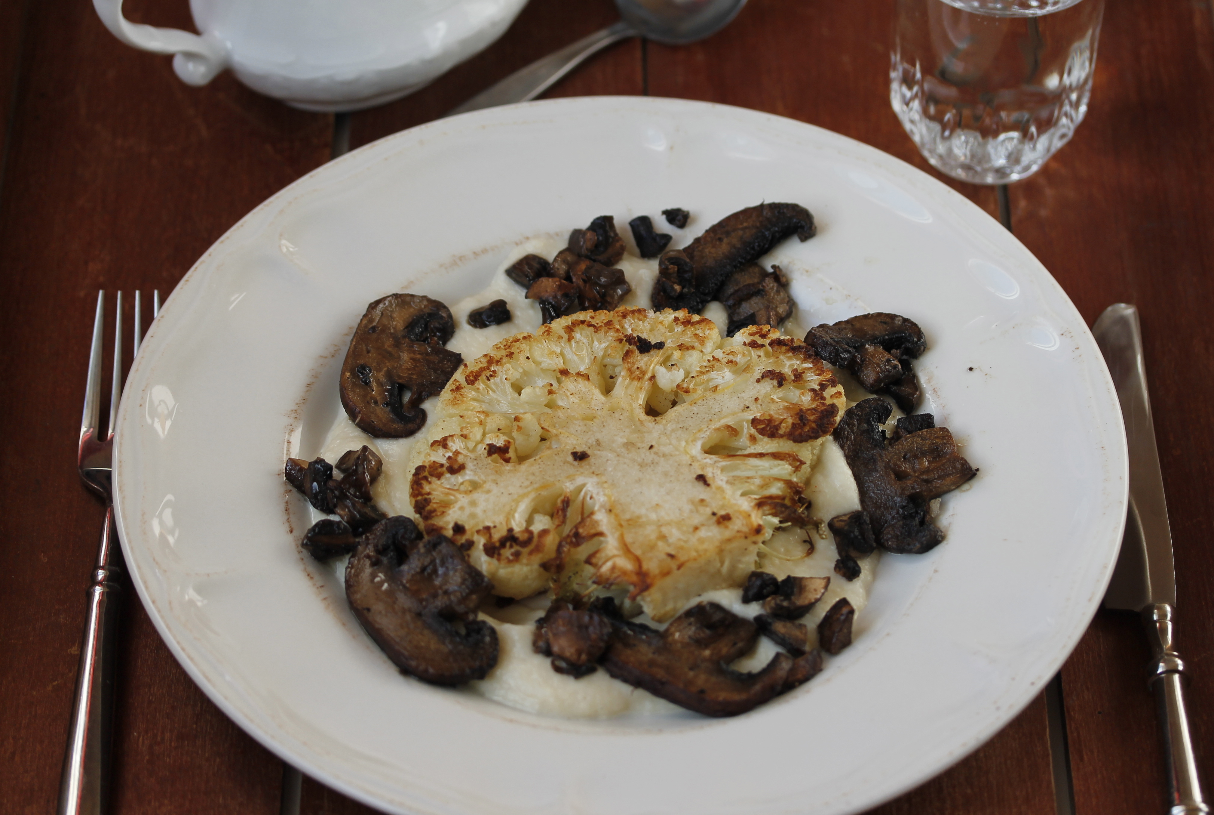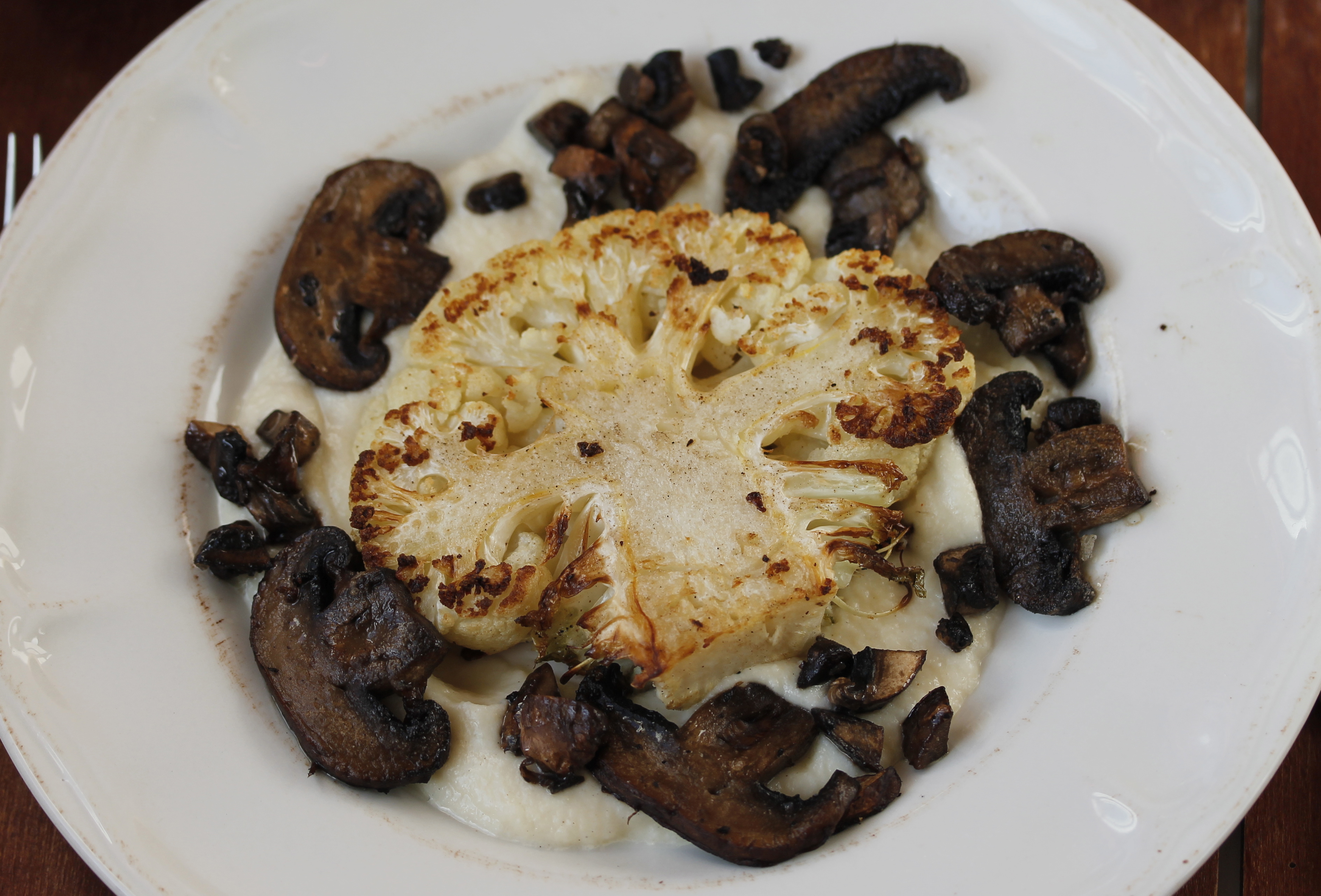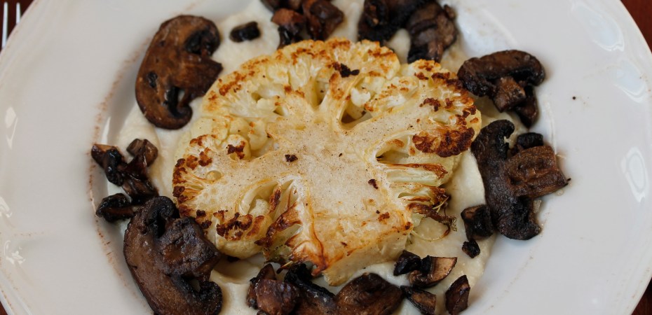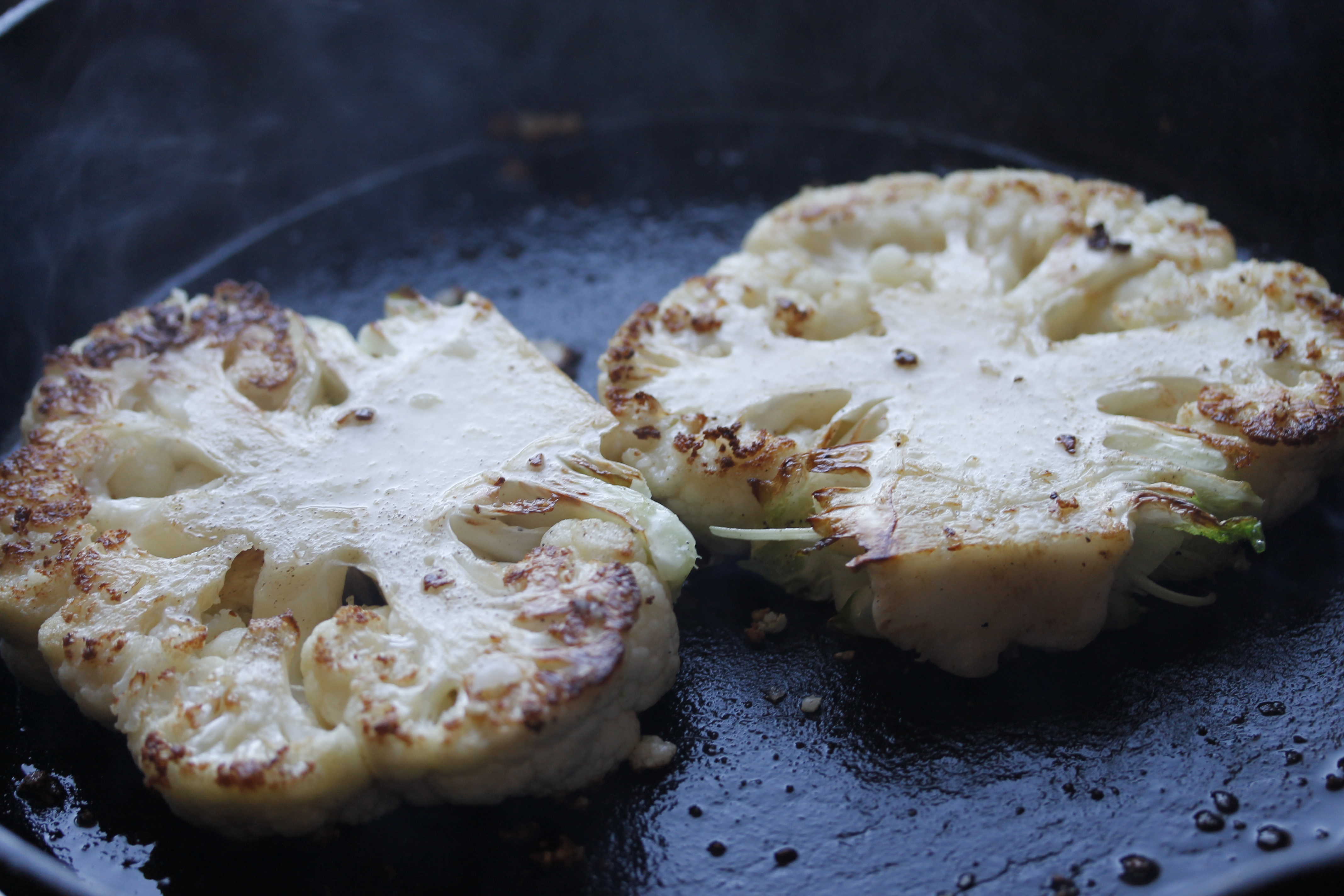 Þessi aðferð við að matreiða blómkál er býsna vinsæl núna, enda sérlega hentug, það þarf ekkert að skipta blómkálinu í kvisti eða neitt slíkt. Ég las fjölda uppskrifta áður en ég setti þessa saman og í nánast öllum var þetta kallað blómkálssteik – eða cauliflower steak á ensku – svo að ég hélt því og kallaði þetta blómkálssteik (uppskriftin birtist í marsblaði MAN). Svo rakst ég bara núna áðan á nýja grein í Huffington Post  og þarna er varpað fram spurningunni: Af hverju köllum við þetta steik? Sem er réttmæt spurning svosem, og kannski er þetta vegna þess að við getum aldrei alveg v iðurkennt grænmetisrétti sem fullgilda, við erum hálfpartinn alltaf að gera eftirlíkingar af kjötréttinum (samanber hnetusteik, sem er ekki einu sinni steikt – blómkálið er þó steikt á pönnu og svo í ofni).