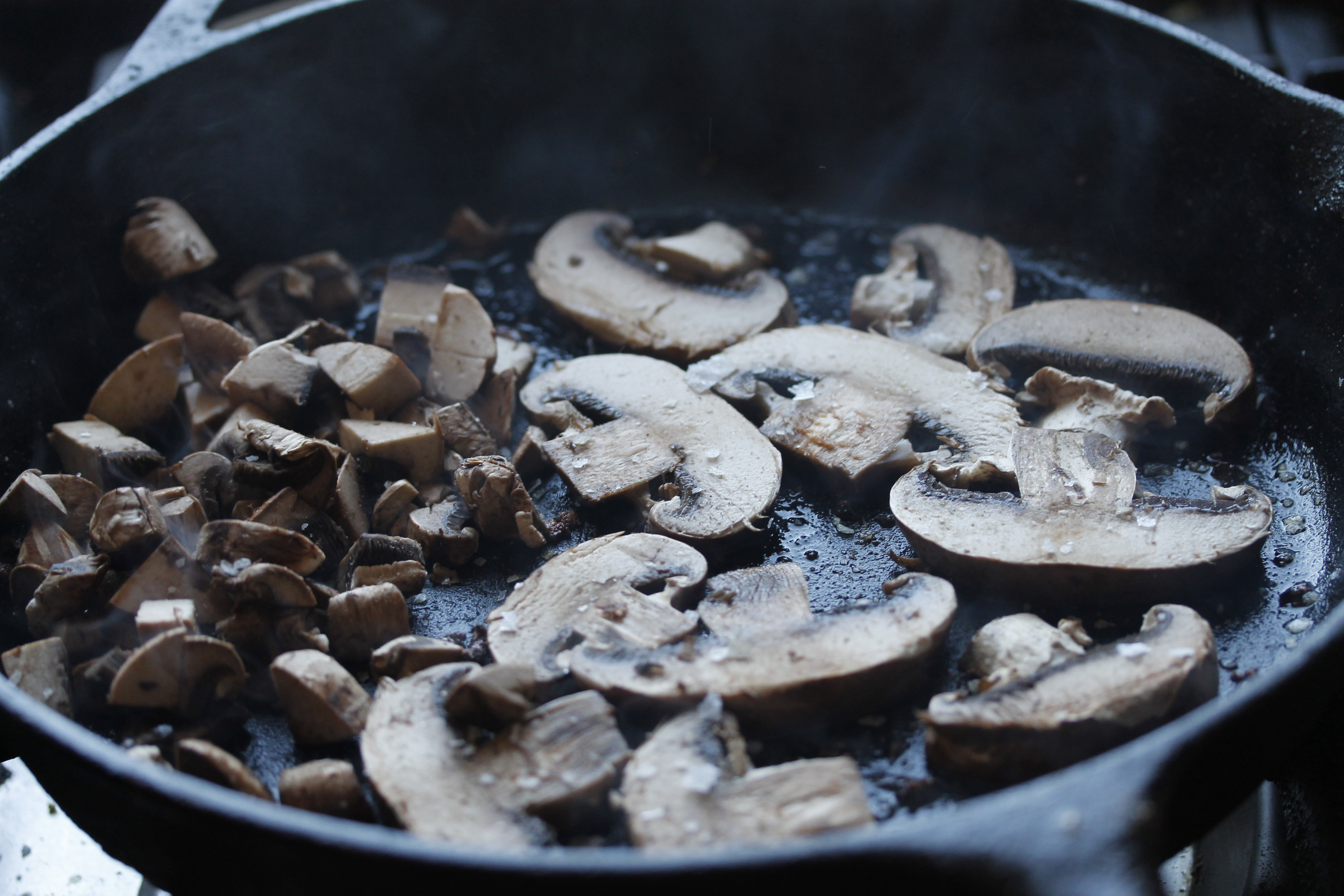 Ég setti svo afganginn af olíunni (1½ msk) á pönnuna og hitaðu hana. Raðaði svo sveppasneiðunum á pönnuna og setti sveppabitana hjá þeim. Kryddaði  með pipar og salti og steikti við meðalhita í nokkrar mínútur. Ég sneri sveppasneiðunum einu sinni en hrærði nokkrum sinnum í bitunum.