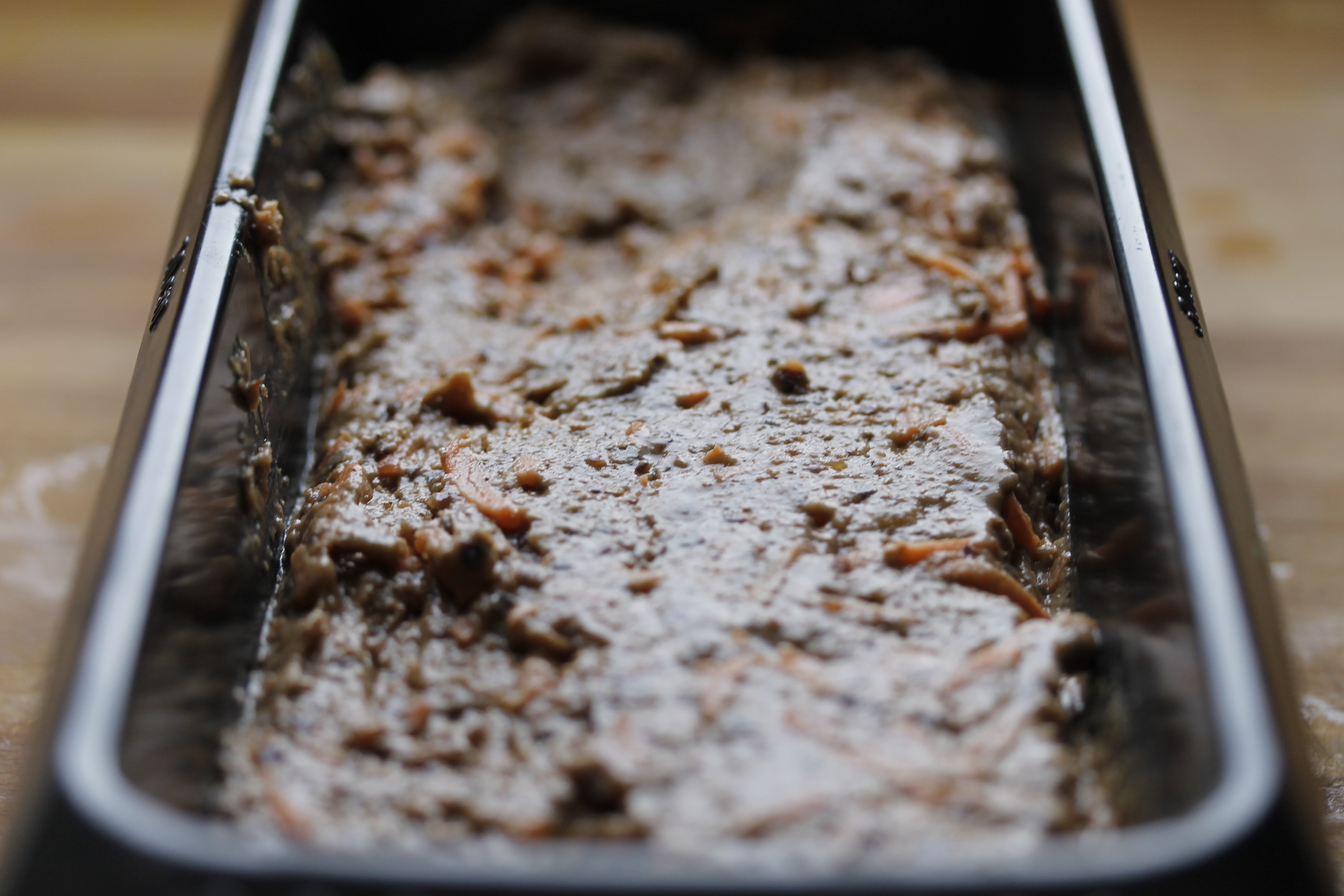 Ég setti svo deigið í meðalstórt jólakökumót og sléttaði yfirborðið. Ég smurði mótið ekki (það er húðað og á ekki að þurfa þótt þess þurfi víst stundum þegar eitthvað á að heita non-stick) en ég klippti til bökunarpappírsblað sem passaði á botninn og setti í mótið áður en ég hellti deiginu í það, finnst það alltaf vissara.