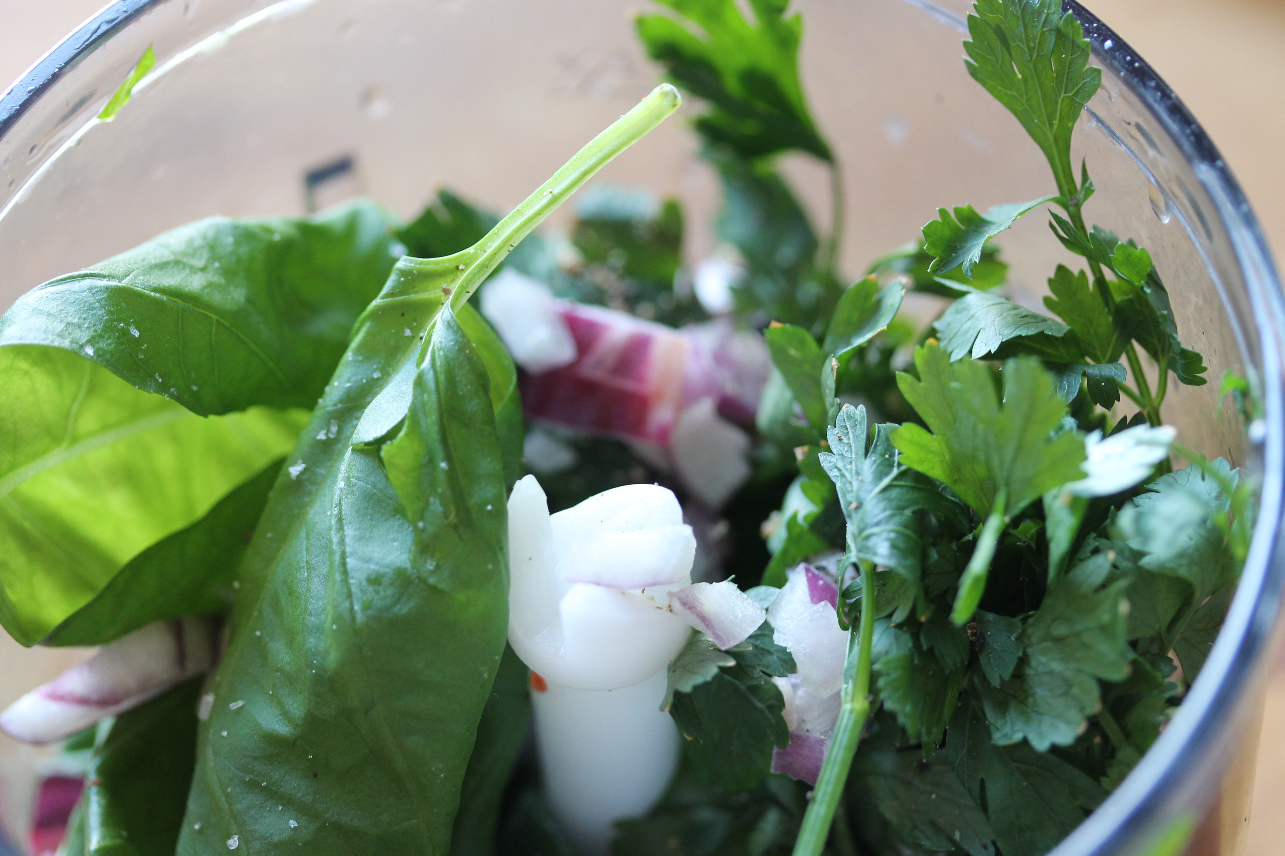 En ég átti dálítið af þessari sósu – þetta er einföld basilíku-steinseljusósa sem minnir á pestó en inniheldur þó hvorki hnetur né ost. Í henni er lófafylli (væn) af basilíku og önnur af steinselju, kannski ekki alveg eins væn, 2 hvítlauksgeirar, 1/4 rauðlaukur (eða vejulegur), 1/2 tsk rautt chilialdin, saxað smátt (má vera meira) – þetta er allt sett í matvinnsluvél eða blandara og saxað smátt, bragðbætt með 1 msk af sítrónusafa (eða eftir smekk), pipar og salti og svo er 100 ml af ólífuolíu þeytt saman við smátt og smátt.