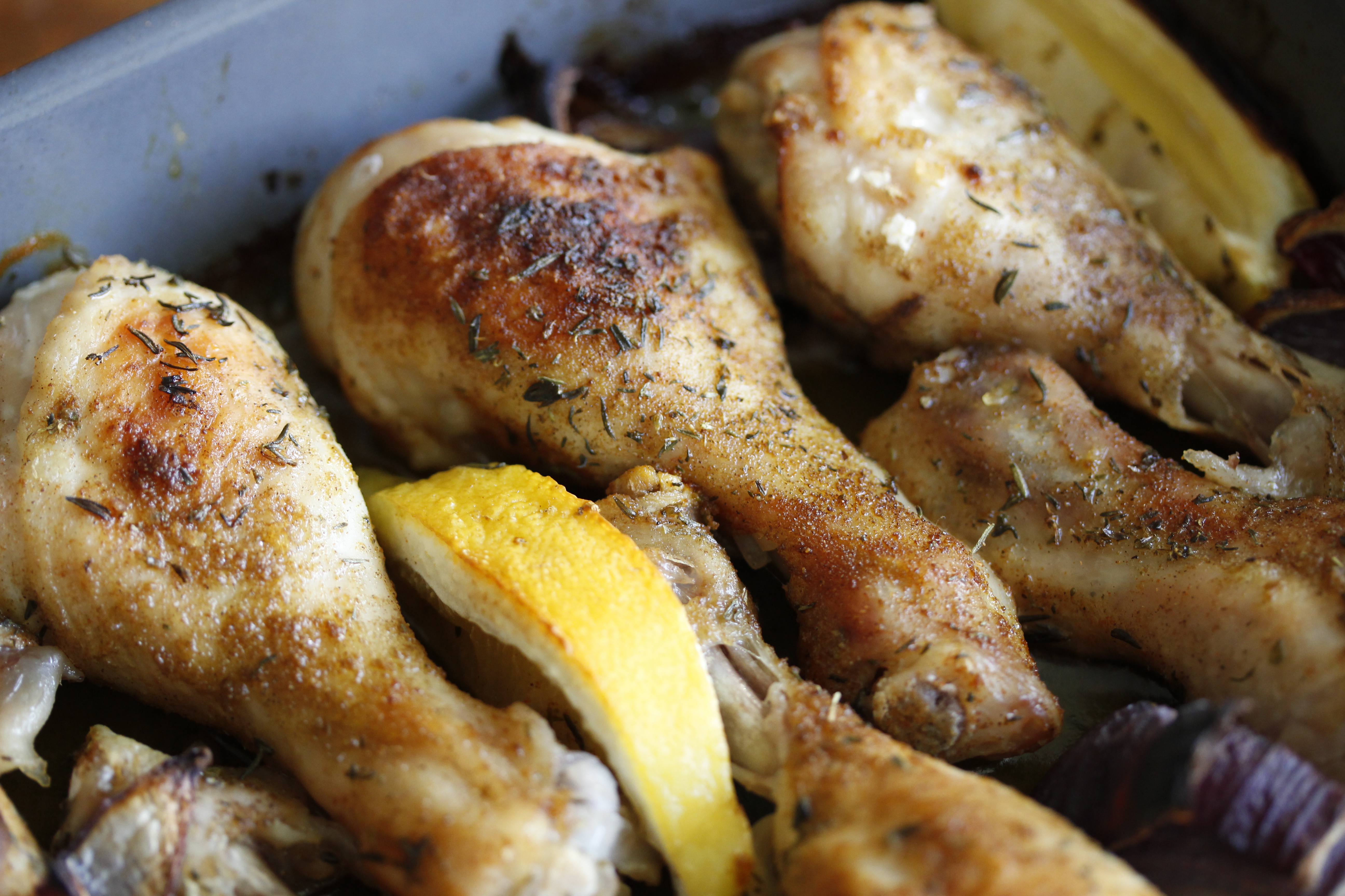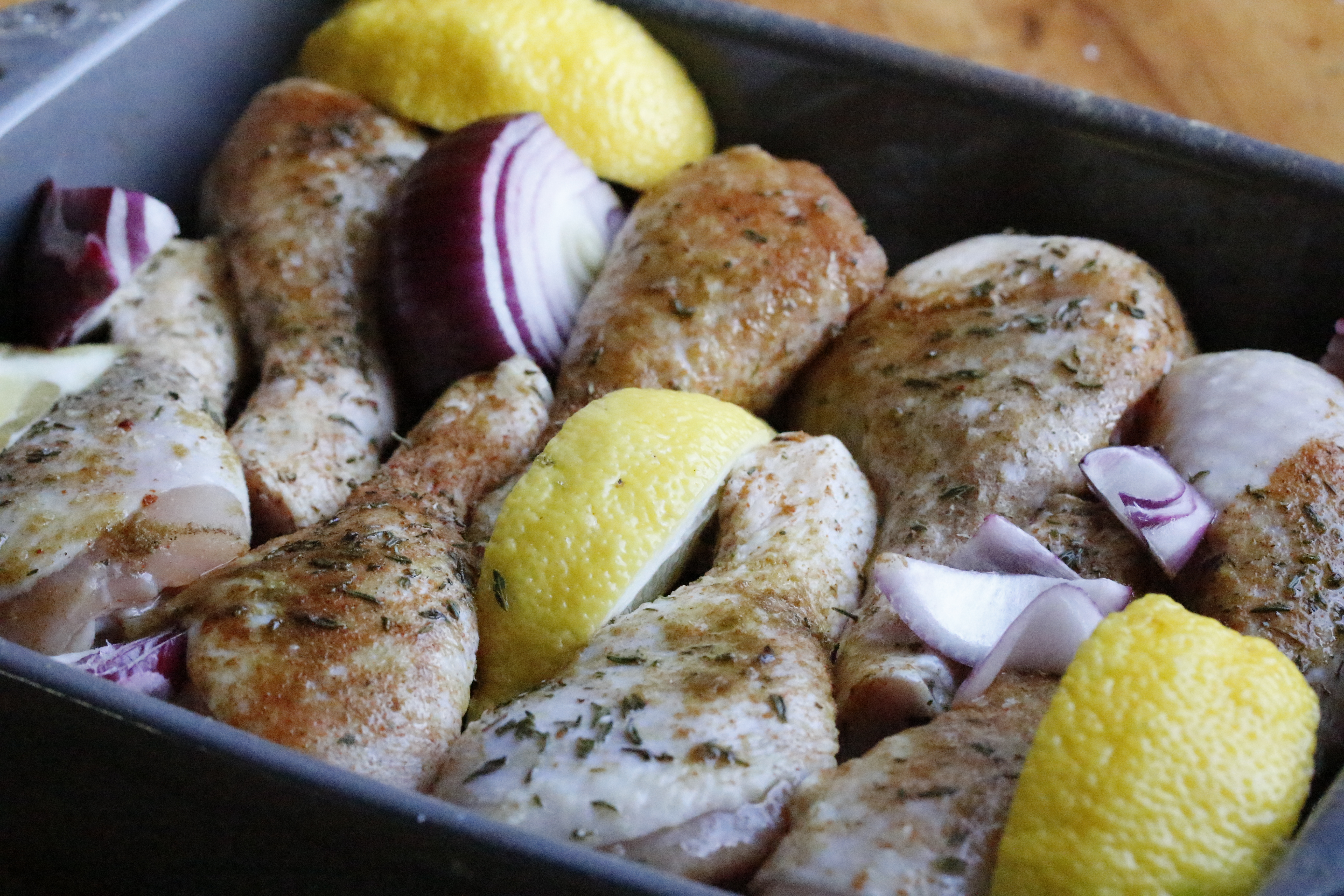 Svo skar ég ég eina sítrónu í báta, kreisti safann úr tveimur þeirra yfir kjúklingaleggina en stakk hinum á milli þeirra. Tók líka hálfan rauðlauk af því að ég átti hann, skar í bita og dreifði á milli, en það er hreint ekki nauðsynlegt.
