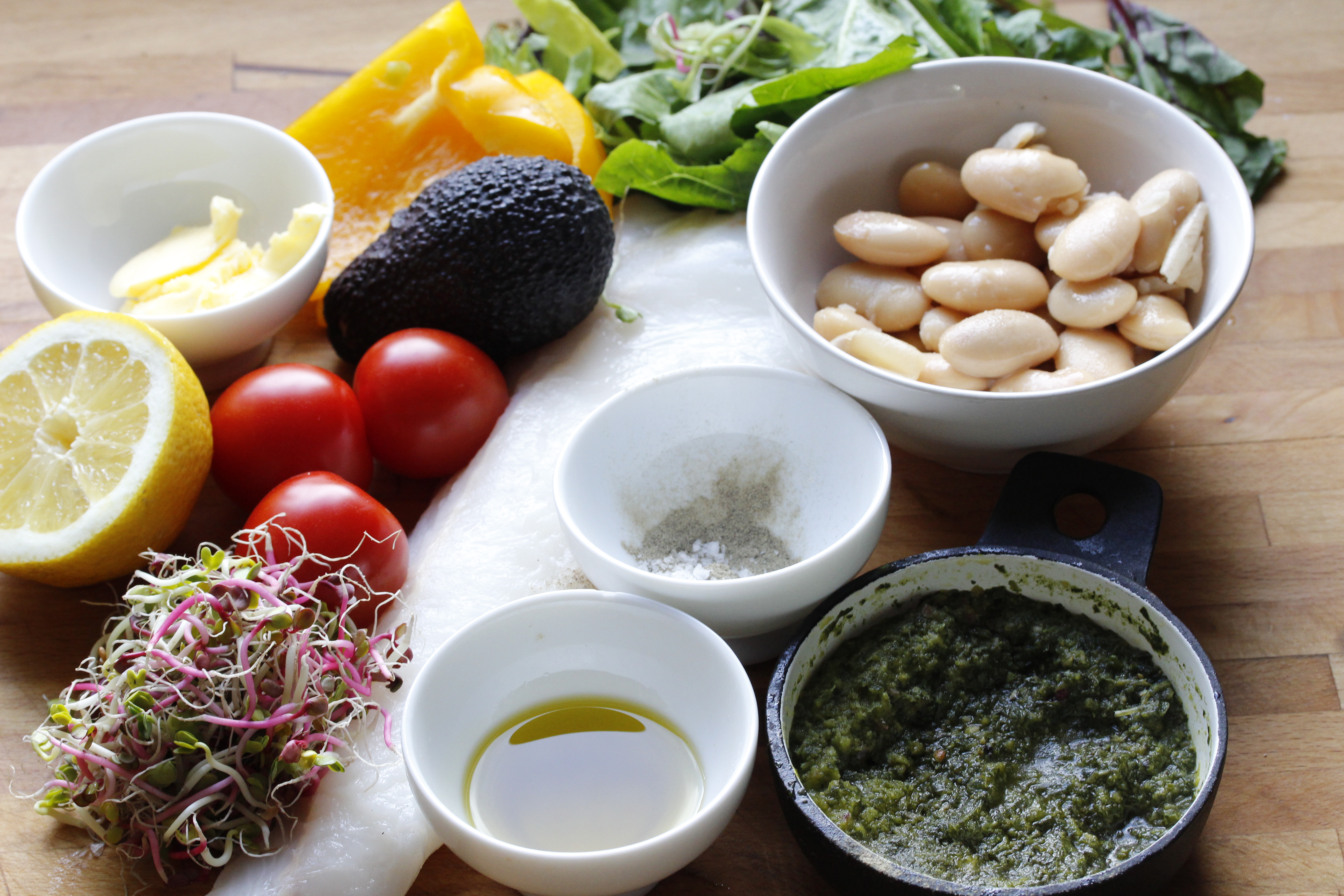 Og svo átti ég einhverja afganga sem ég þurfti að nota. Allt í anda nýtni og ,,hættum að henda“-stefnunnar sko. Þarna eru semsagt þessi 300 g af steinbít (nokkuð þykkt flak), hálf dós af smjörbaunum (sem má náttúrlega sleppa ef maður er í einhverju LKL-dæmi), kannski svona fjórar matskeiðar af basilíkusósu (það má nota pestó), hálf gul paprika, hálf sítróna, radísuspírur sem ég átti og voru að komast á tíma (má sleppa en þær eru flottar á diski, nei, ég keypti þær nú ekki hollustunnar vegna), þrír kokkteiltómatar (átti fjóra en einn hafði rúllað á bak við hrærivélina og ég fann hann ekki fyrr en ég var búin að elda), ein lítil lárpera, væn lófafylli af salatblöðum, ein matskeið af smjöri, ein matskeið af ólífuolíu, pipar og salt.