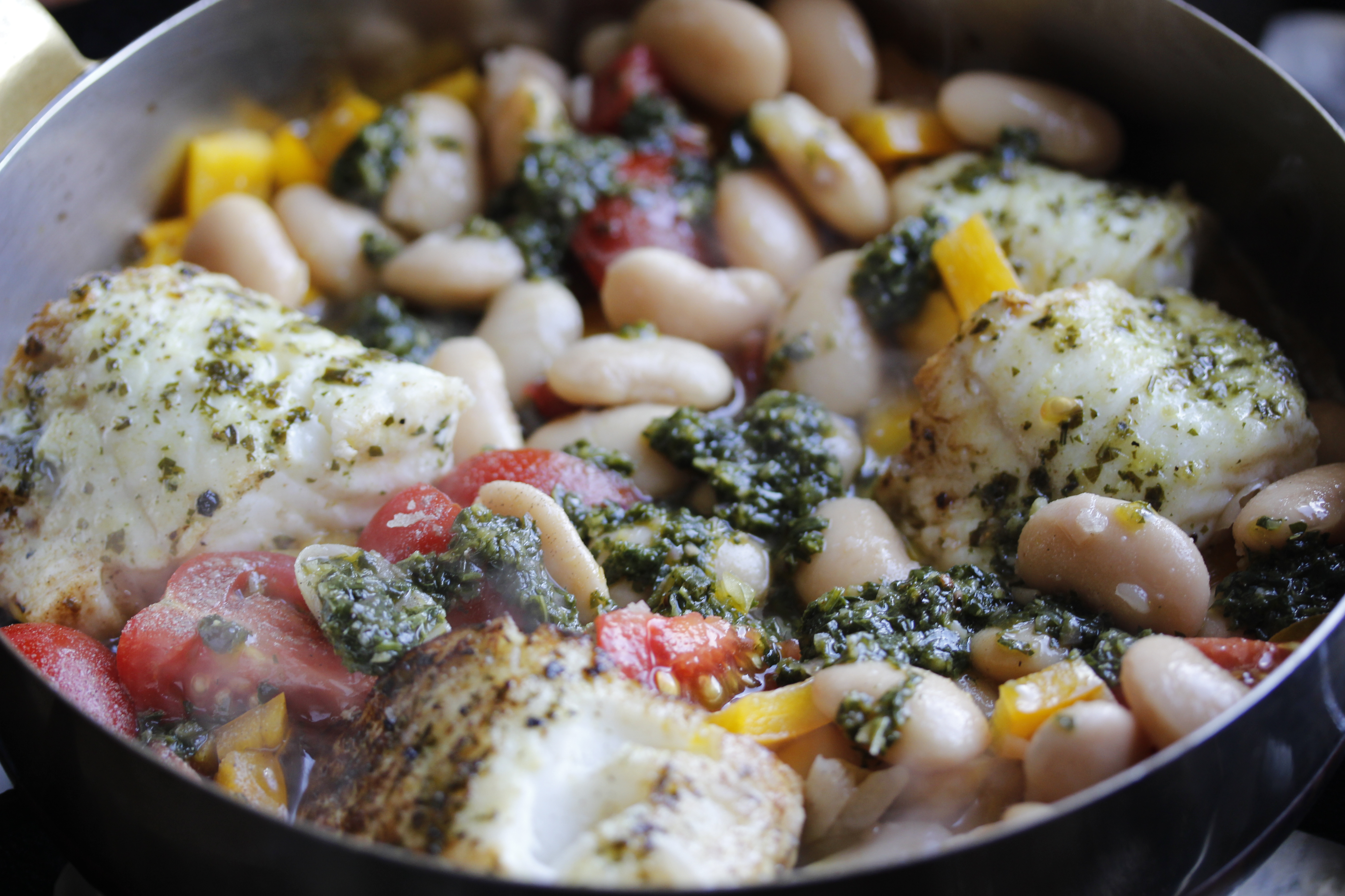 Svo dreifði ég papriku, tómötum og baunum á pönnuna á milli fiskbitanna og lét krauma áfram í 3-4 mínútur, eða þar til fiskurinn var rétt eldaður í gegn, grænmetið byrjað að mýkjast og baunirnar heitar. Eftir svona 2 mínútur dreypti ég afganginum af basilíkusósunni yfir og hrærði gætilega.