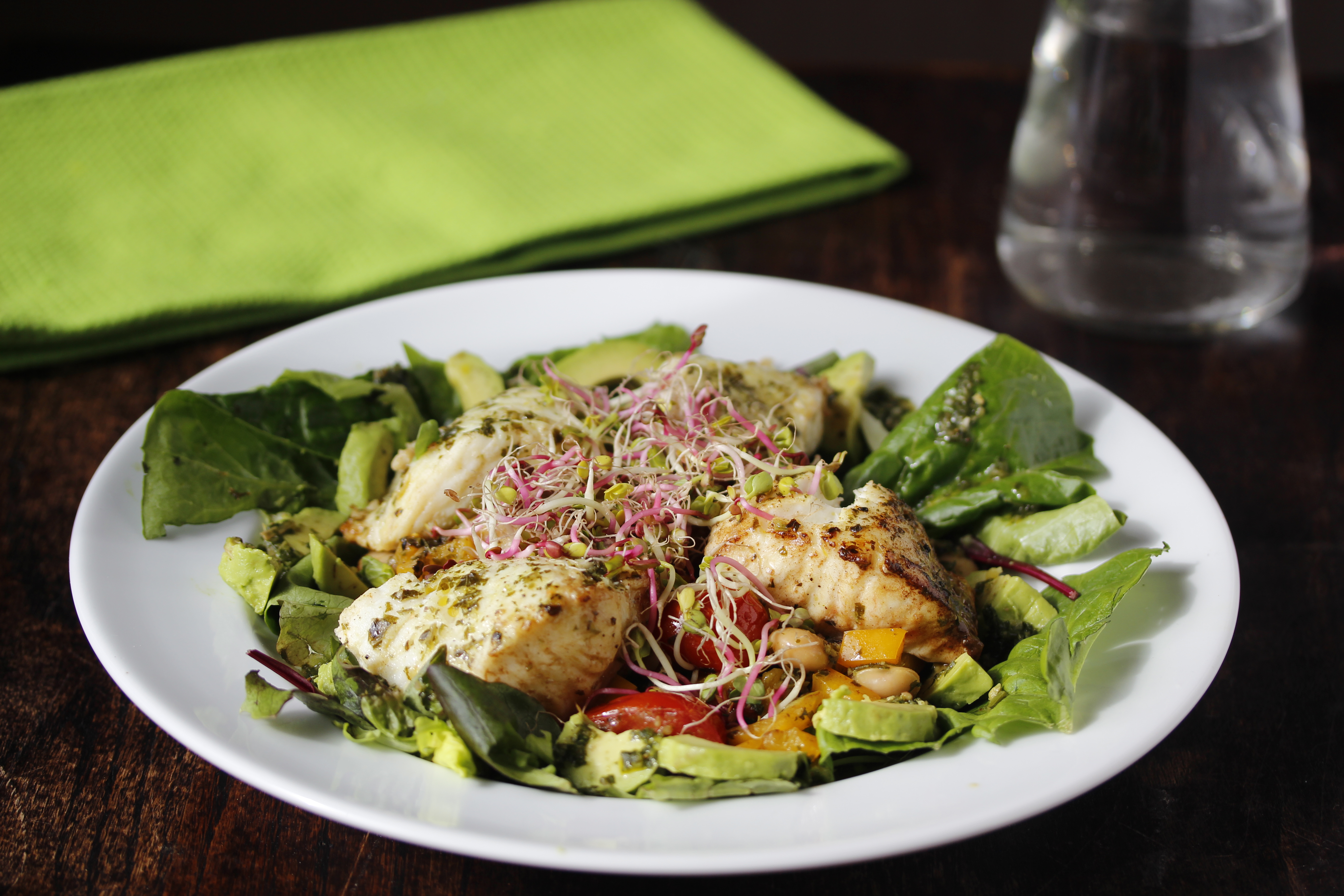 Svo tók ég fat, dreifði salatblöðunum í hring en hafði eyðu í miðjunni, flysjaði lárperuna, skar hana í bita og dreifði þeim yfir, hellti baununum, grænmetinu og sósunni í miðjuna, setti fiskbitana ofan á og kórónaði allt með radísuspírunum.
