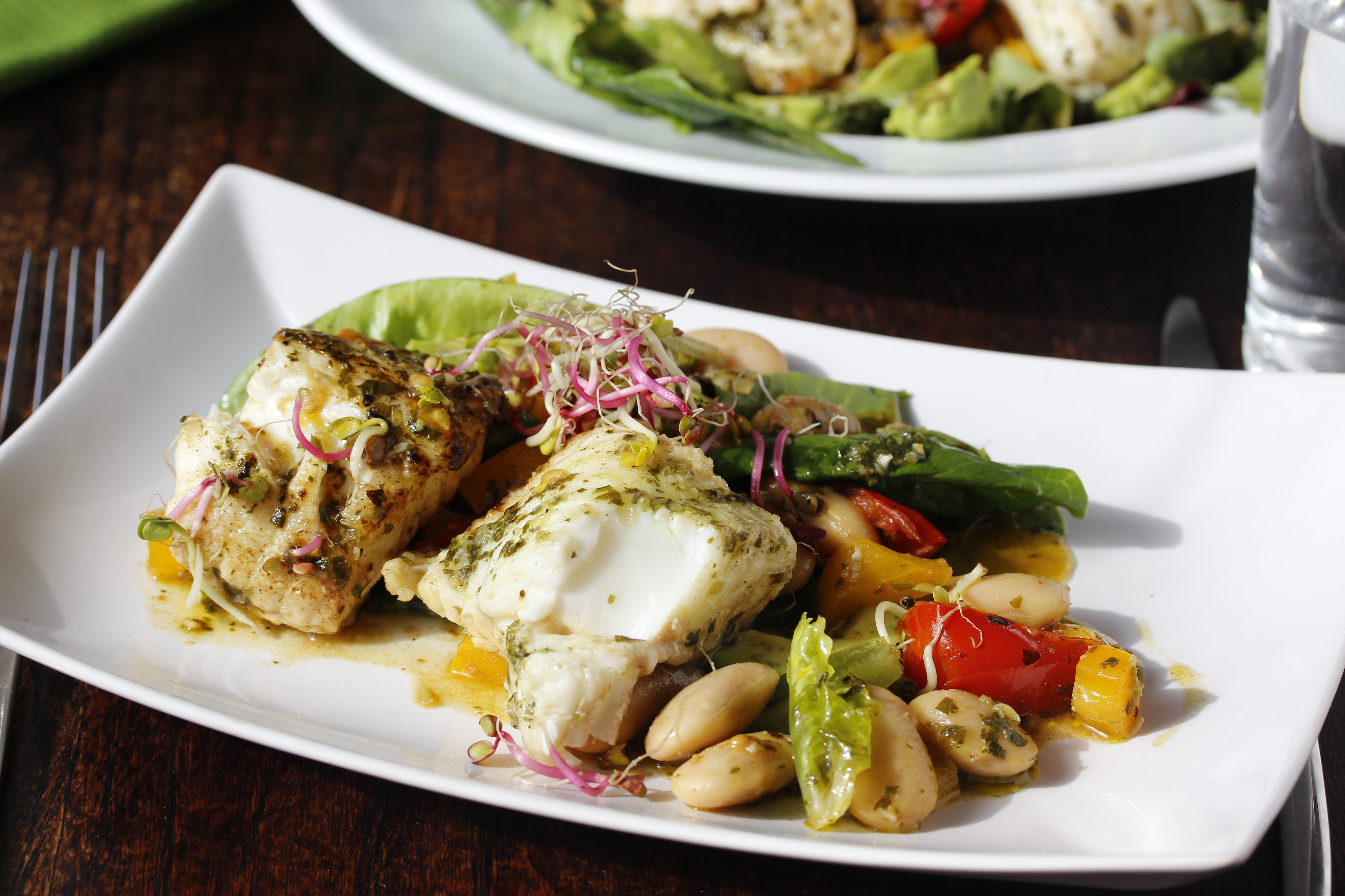 Basilíku-steinbítur með baunum og grænmeti