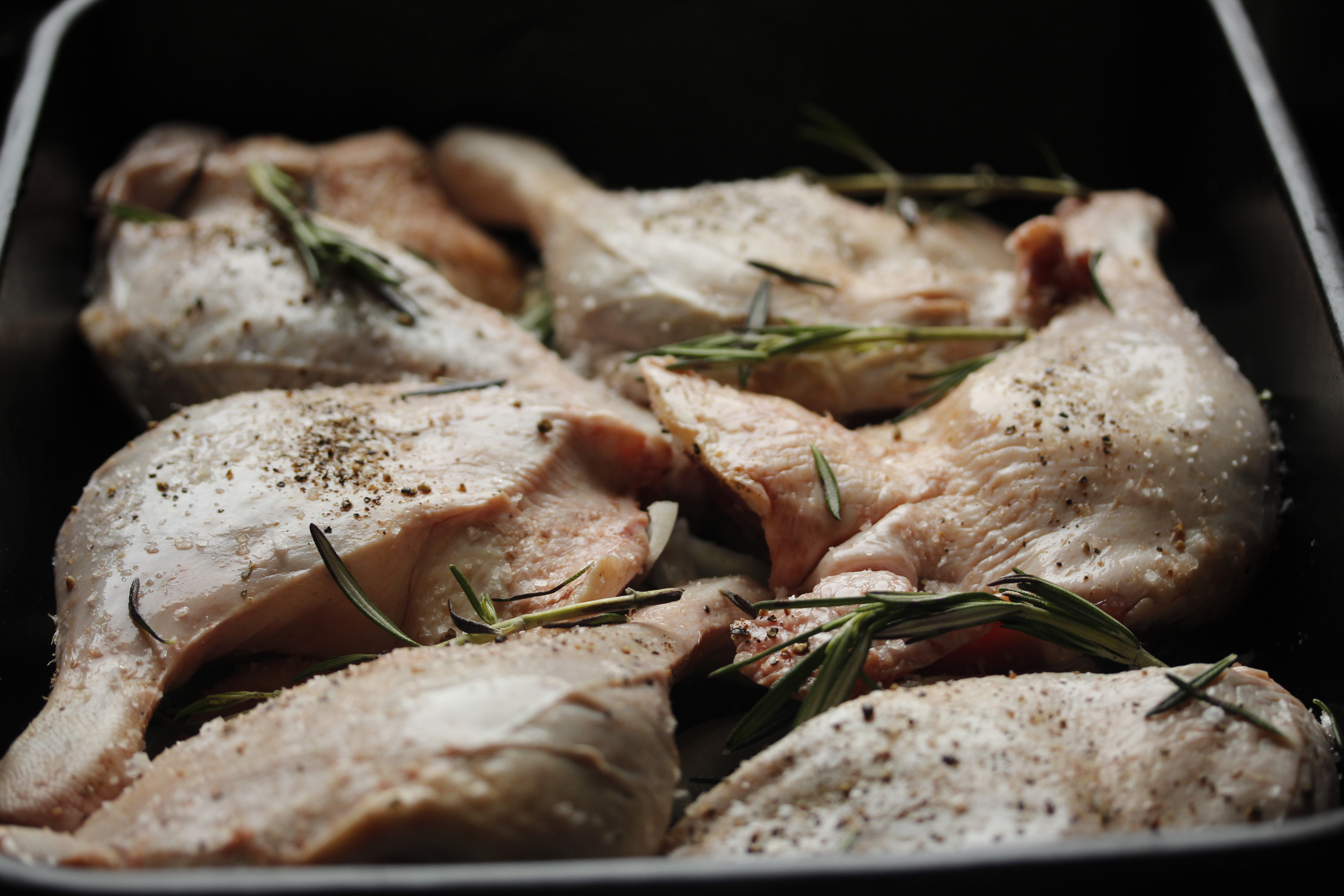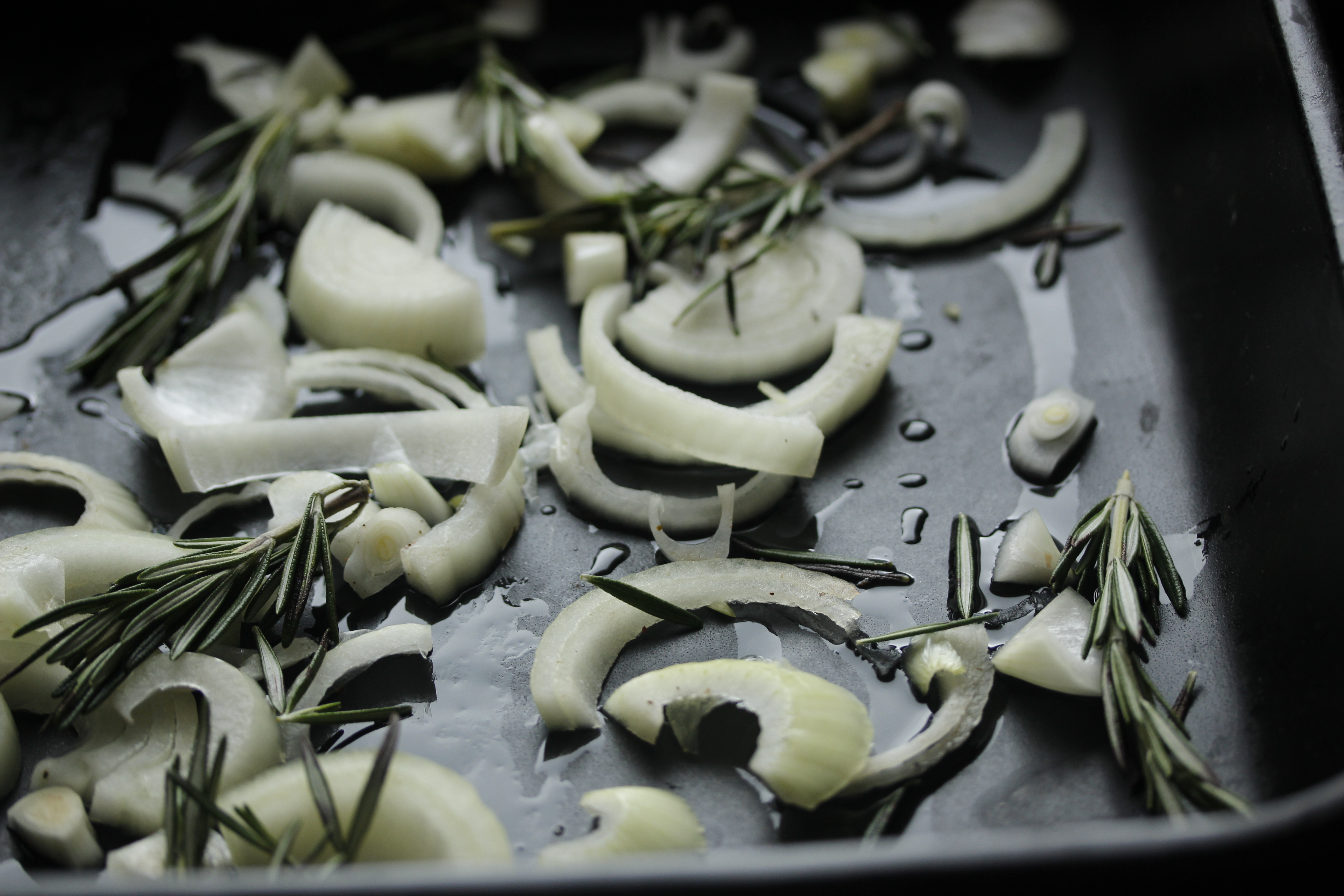 Ég byrjaði á að hita ofninn í 200°C. Svo kryddaði ég lærin vel með pipar og salti. Setti 2 tsk af olíu eða svo í botninn á frekar stóru eldföstu móti, skar niður einn lauk og nokkrar rósmaríngreinar og dreifði í mótið.