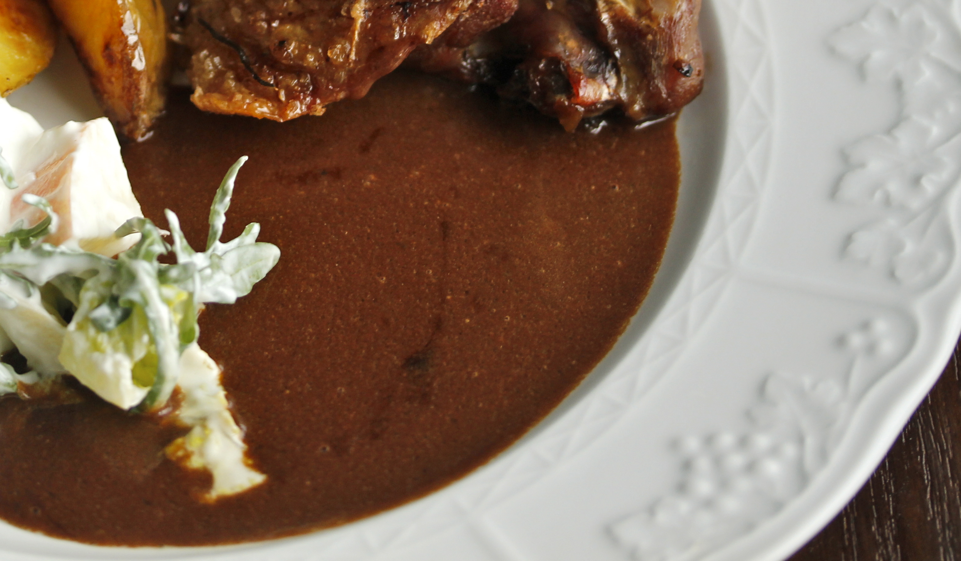Á meðan kartöflurnar voru í ofninum hafði ég gert sósuna: Ég hitaði 1 msk af olíu í potti, saxaði 1 lauk og lét hann krauma í nokkrar mínútur í potti ásamt svolitlu timjani og pipar. Svo bætti ég 3 msk af púrtvíni út í og lét sjóða töluvert niður. Bætti svo 400 ml af vatni og 1 msk af andakrafti út í og lét malla nokkra stund. Þegar andalærin voru tilbúin hellti ég soðinu úr fatinu í skál, fleytti mestalla fituna ofan af og hrærði hinu saman við sósuna. Síaði hana og setti aftur í pottinn, ásamt svoan 100 ml af rjóma, hitaði að suðu og lét malla smástund. Þykkti ögn með sósujafnarar og bætti við nokkrum dropum af sósulit. Og pipar og salti ef þarf (en bæði andakrafturinn og soðið eru salt svo þess ætti varla að þurfa). Og svo er ekkert verra að setja aðeins meira púrtvín …