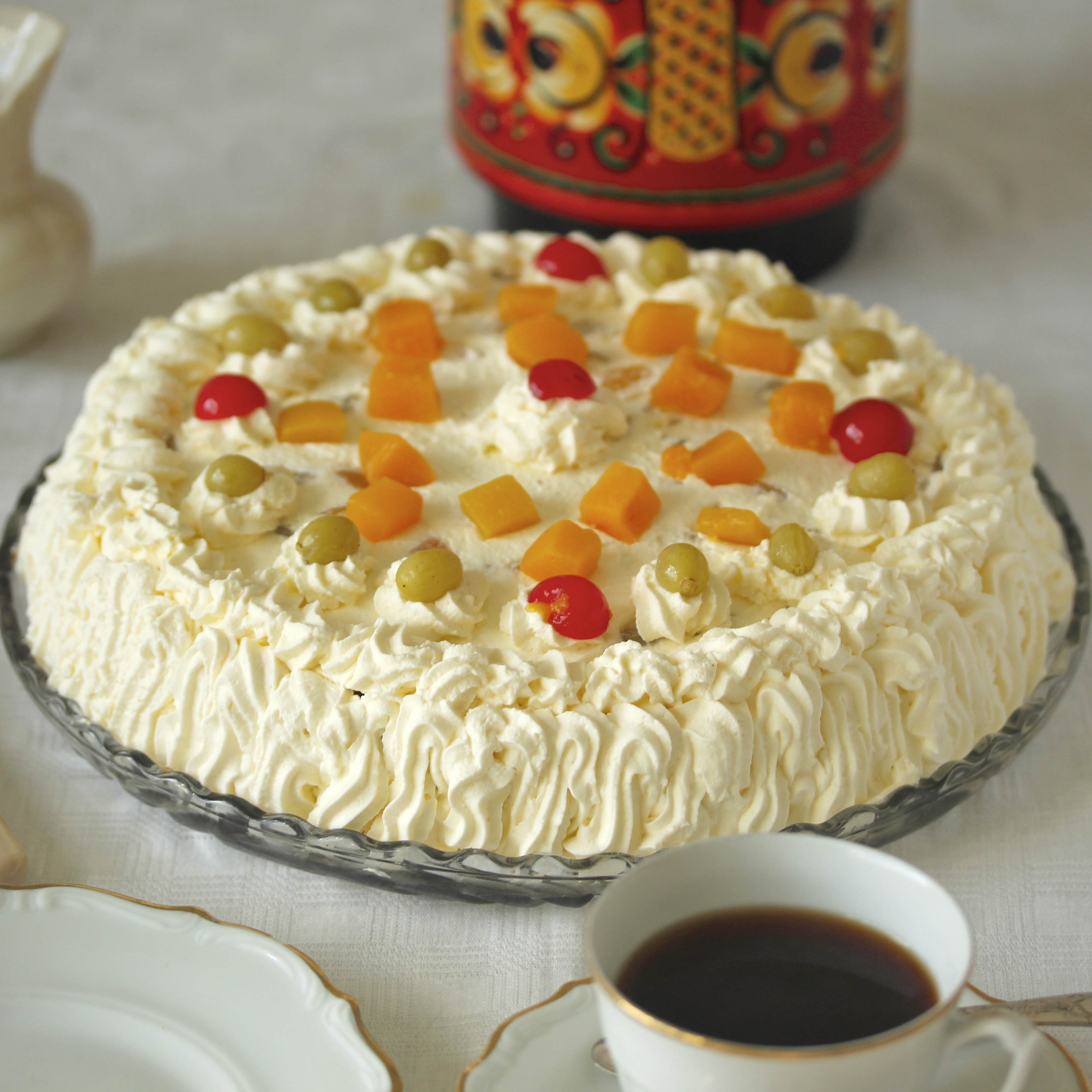 Og á tyllidögum var gjarna borin fram rjómaterta með kokkteilávöxtum með kaffinu. Og það var nú viðeigandi, fannst mér, því að þennan dag voru einmitt eitt hundrað ár frá því að niðursoðnir kokkteilávextir voru fyrst kynntir á Íslandi í blaðaauglýsingu.