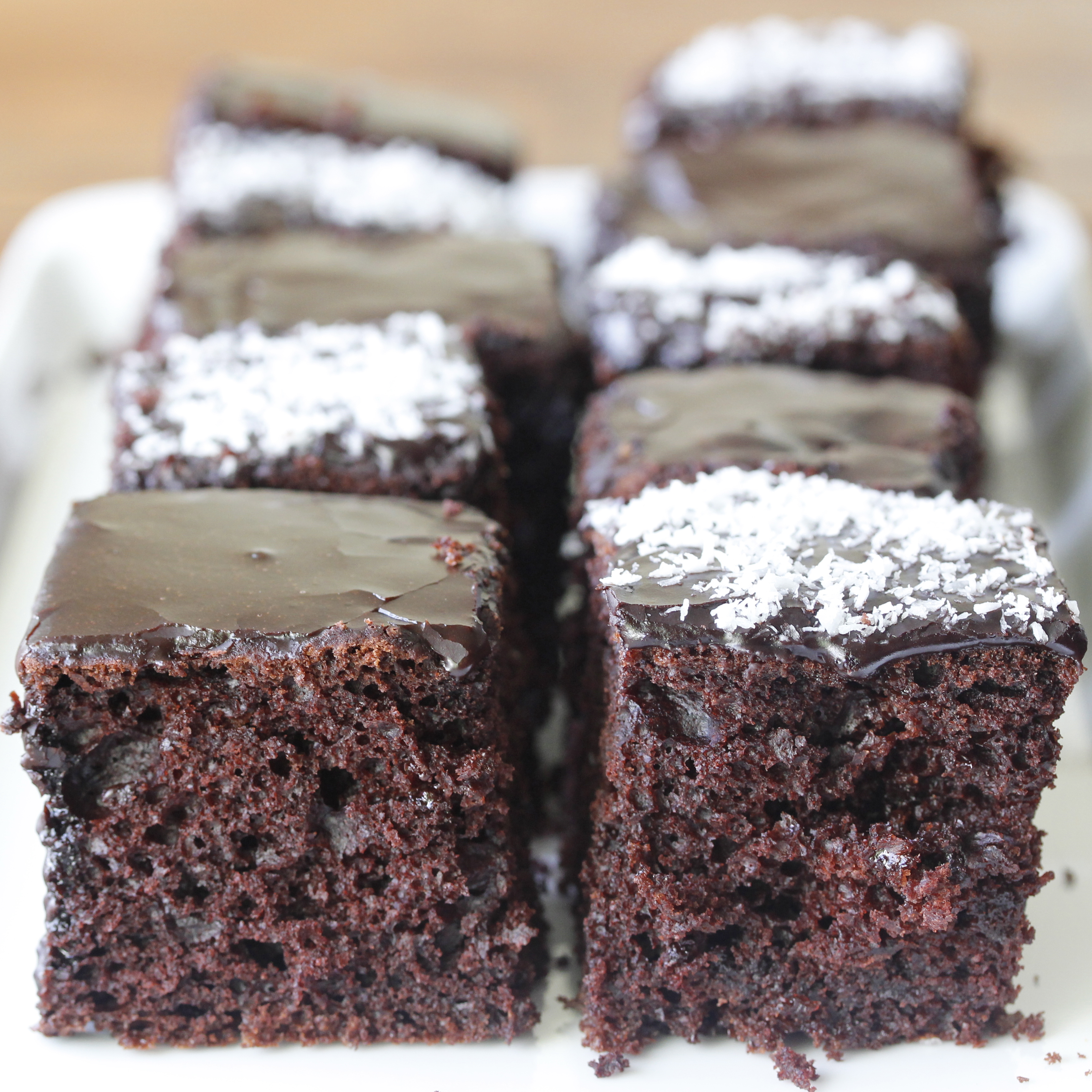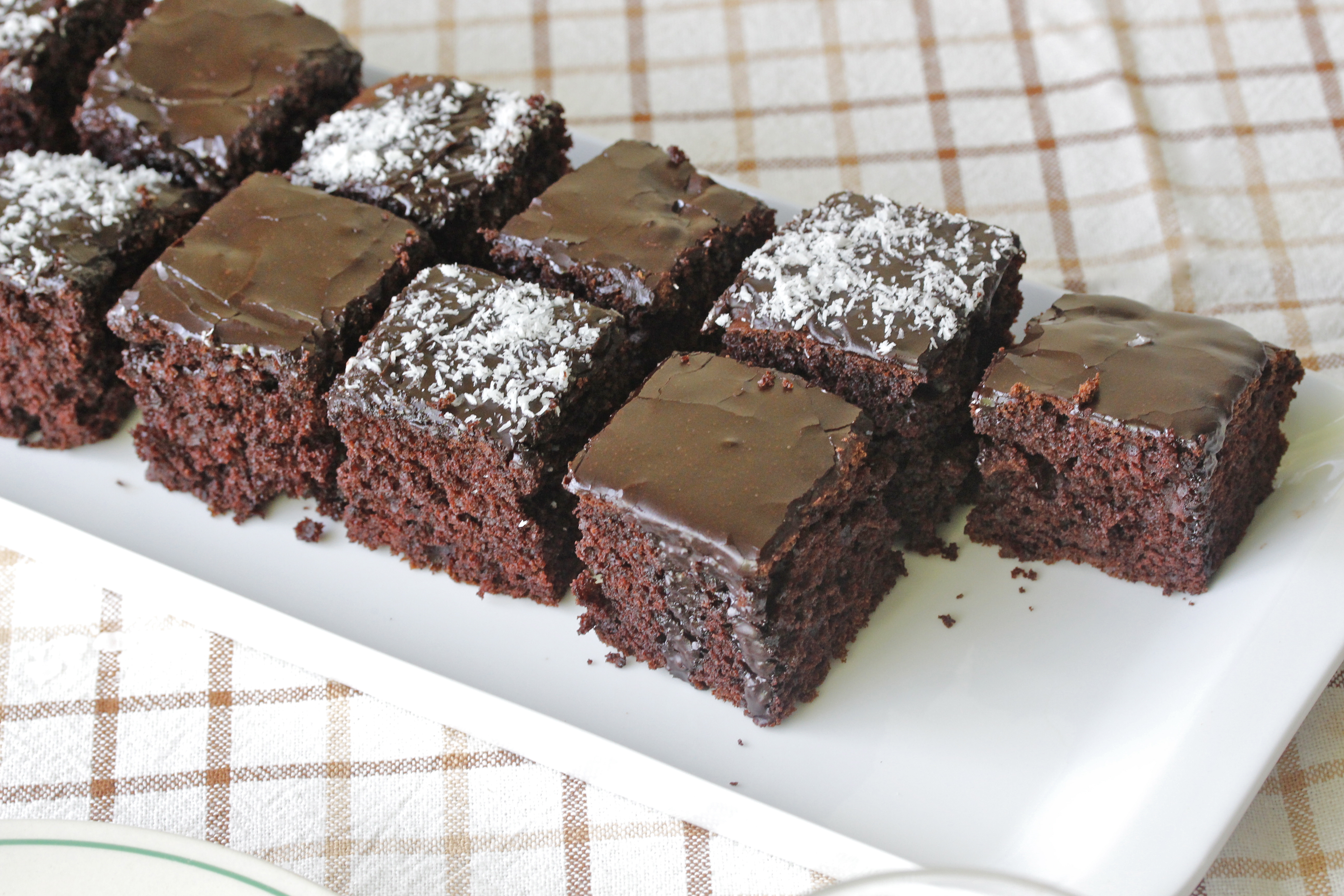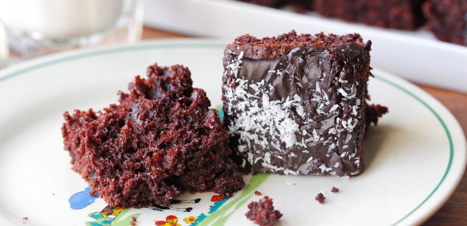 Þegar kakan var orðin köld hrærði ég 150 g af flórsykri með 2-3 msk af kakódufti og svolitlu sjóðandi vatni, nægilegu til að fá þykkfljótandi glassúr. Smurði honum á kökuna og af því að ákveðnir aðilar eru fjarska lítið hrifnir af kókosmjöli skar ég hana svo í tvennt og stráði kókosmjöli bara á annan hlutann. Ég vil hafa kókosmjöl en hvað gerir maður ekki fyrir syni sína, jafnvel þótt þeir gleymi mæðradeginum …