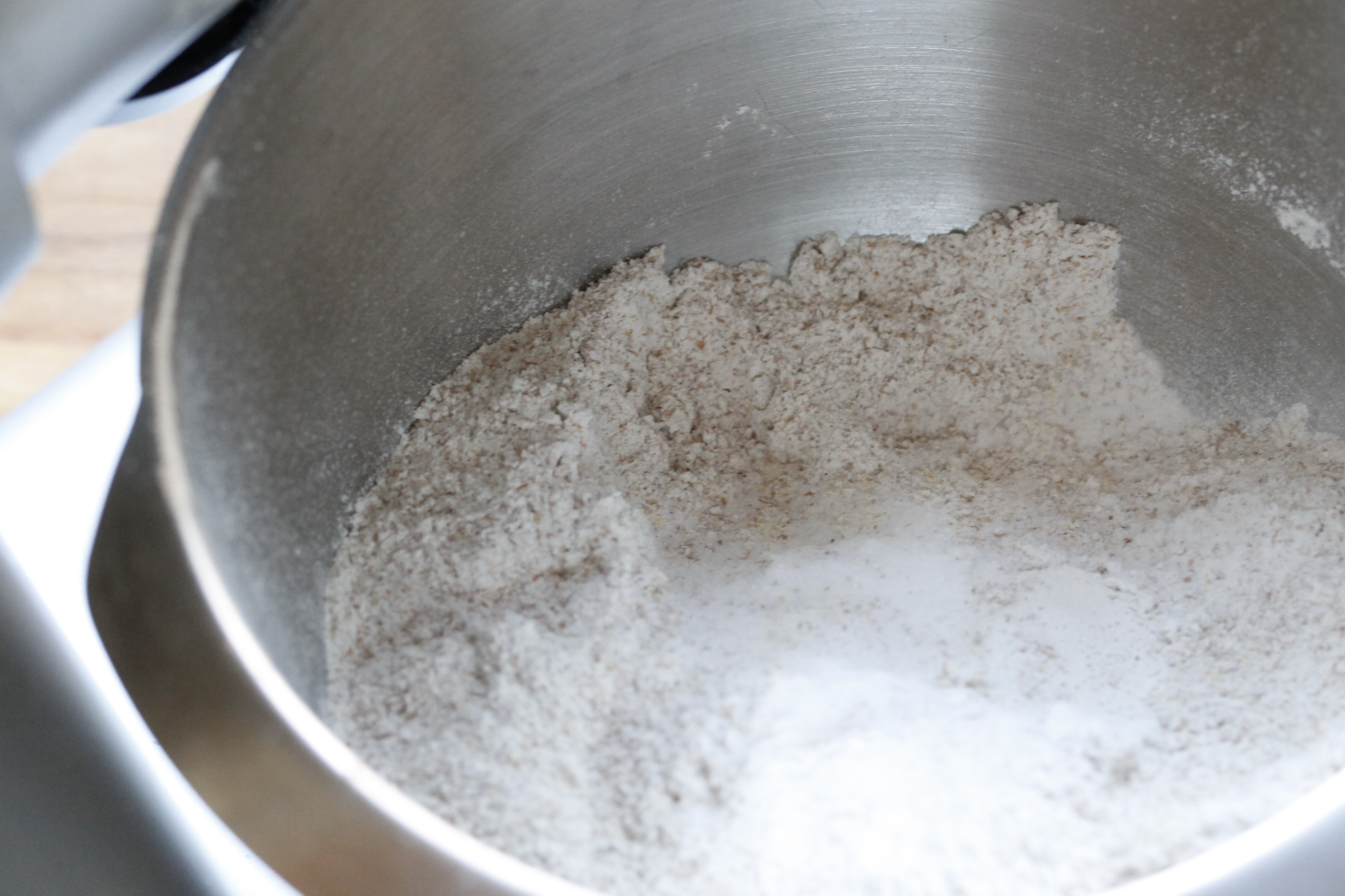 Ég byrjaði á að hita ofninn í 165°C. Blandaði síðan saman 350 g af heilhveiti, 100 g af polentu (grófu maísmjöli), 1 tsk af lyftidufti, 1 tsk af matarsóda og 1/2 tsk af salti í hrærivélarskál.