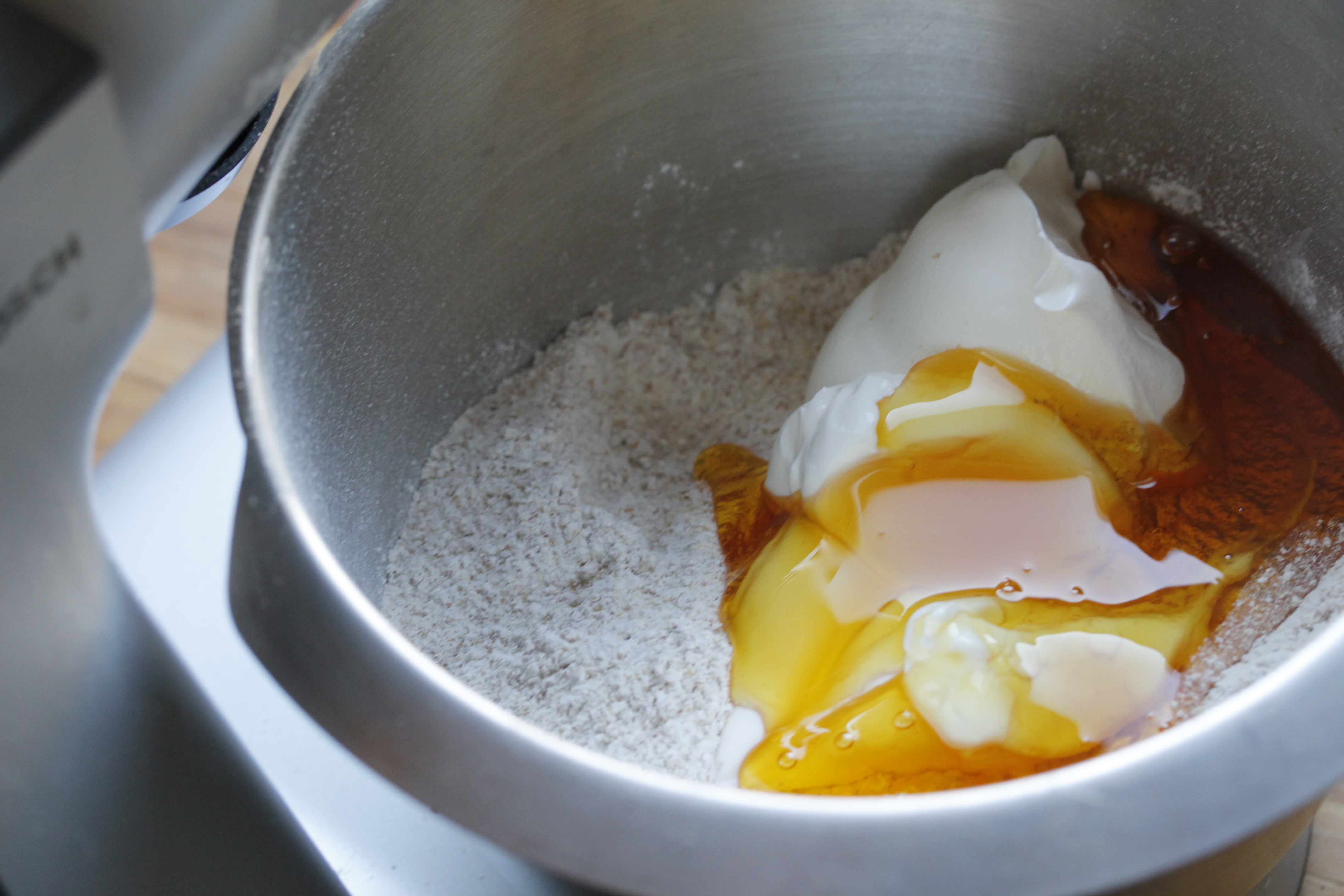 Svo mældi ég 300 ml af grískri jógúrt, 100 ml af mjólk og 100 ml af ljósu sírópi og setti út í. Hrærði þessu saman við en best er þó að hræra sem allra minnst.
