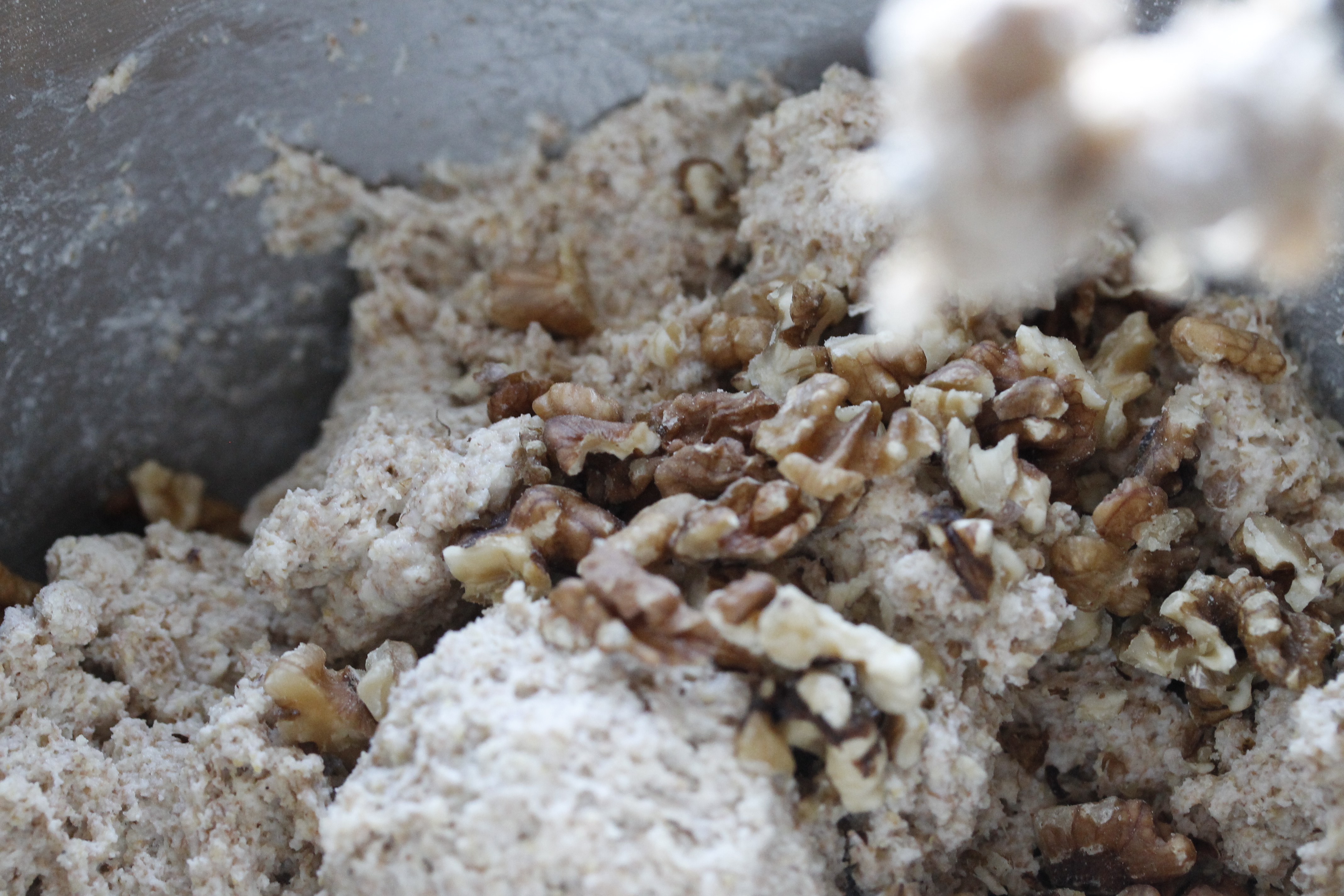 Að lokum gófsaxaði ég 60 g af valhnetum og blandaði þeim saman við. Deigið ætti að vera hæfilega þykkt til að mögulegt sé að hnoða það en þó svo blautt að það klessist aðeins við hendurnar.