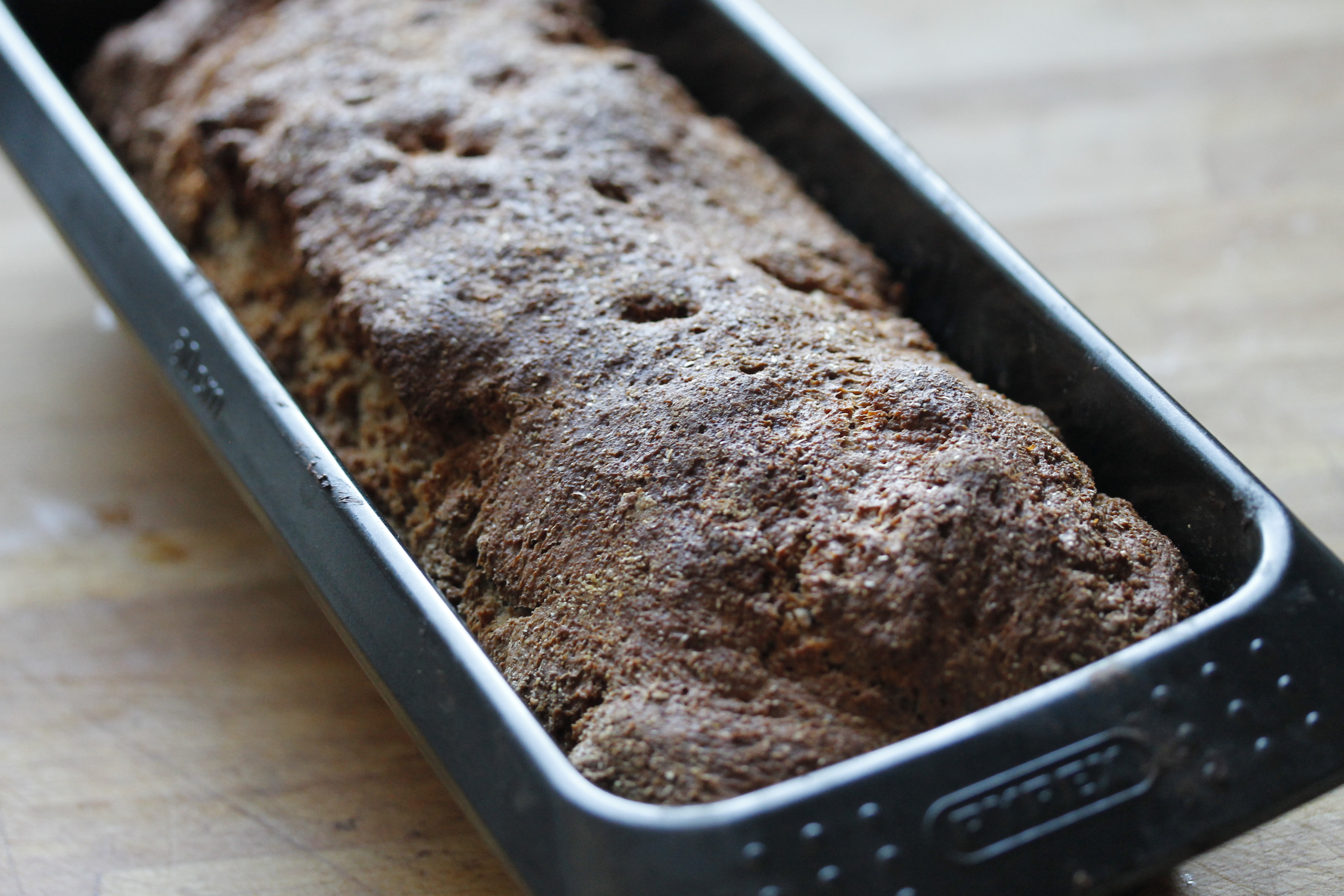 Ég setti svo brauðið í ofninn og bakaði það á neðstu rim í 50-60 mínútur, eða þar til prjónn sem stungið var í það kom hreinn út.