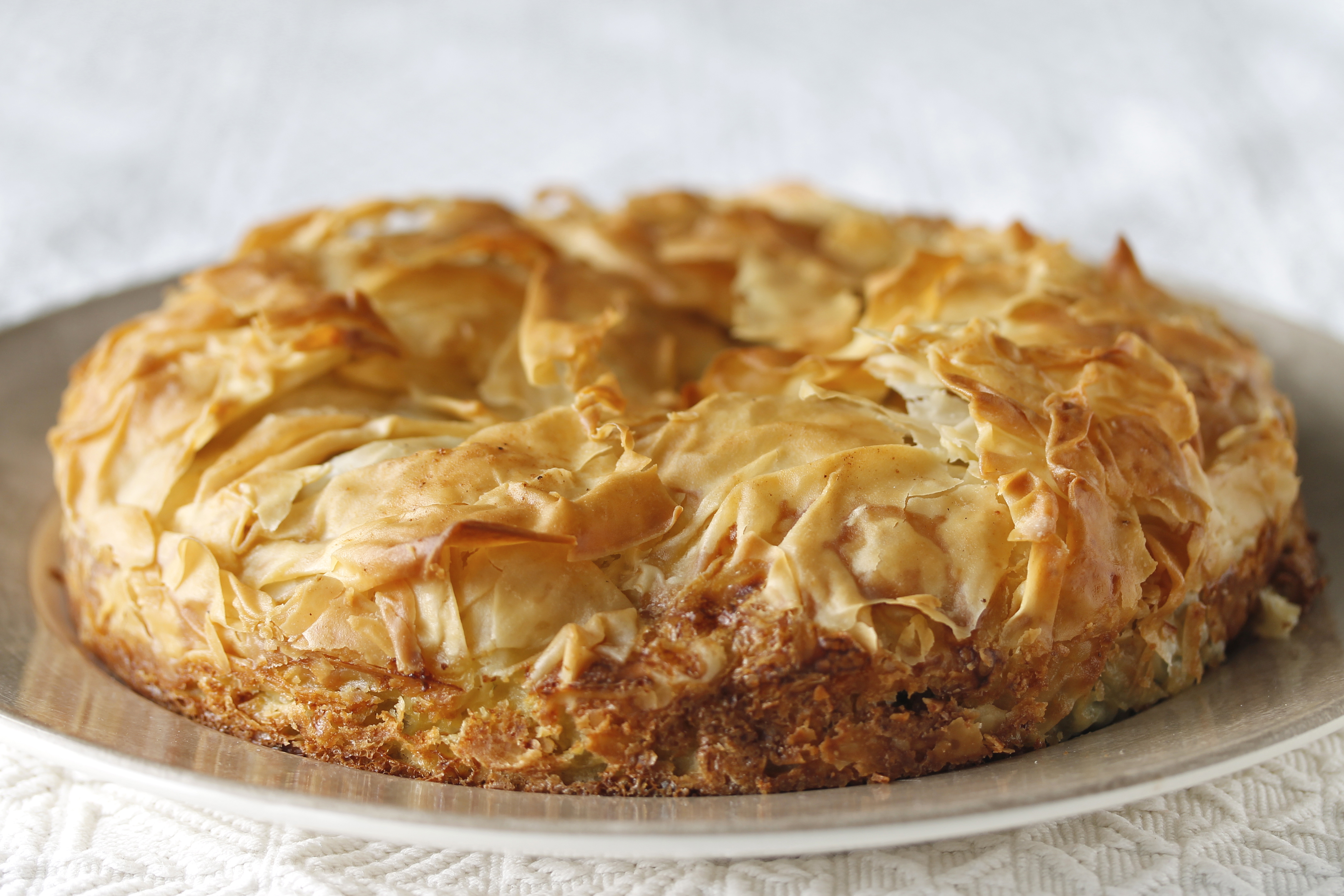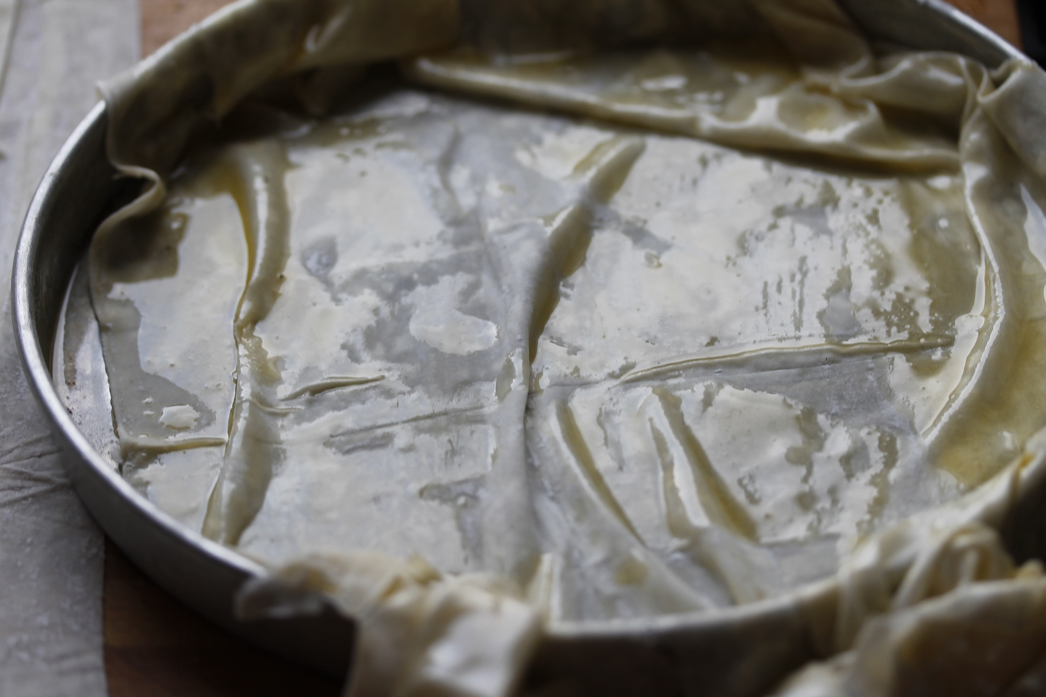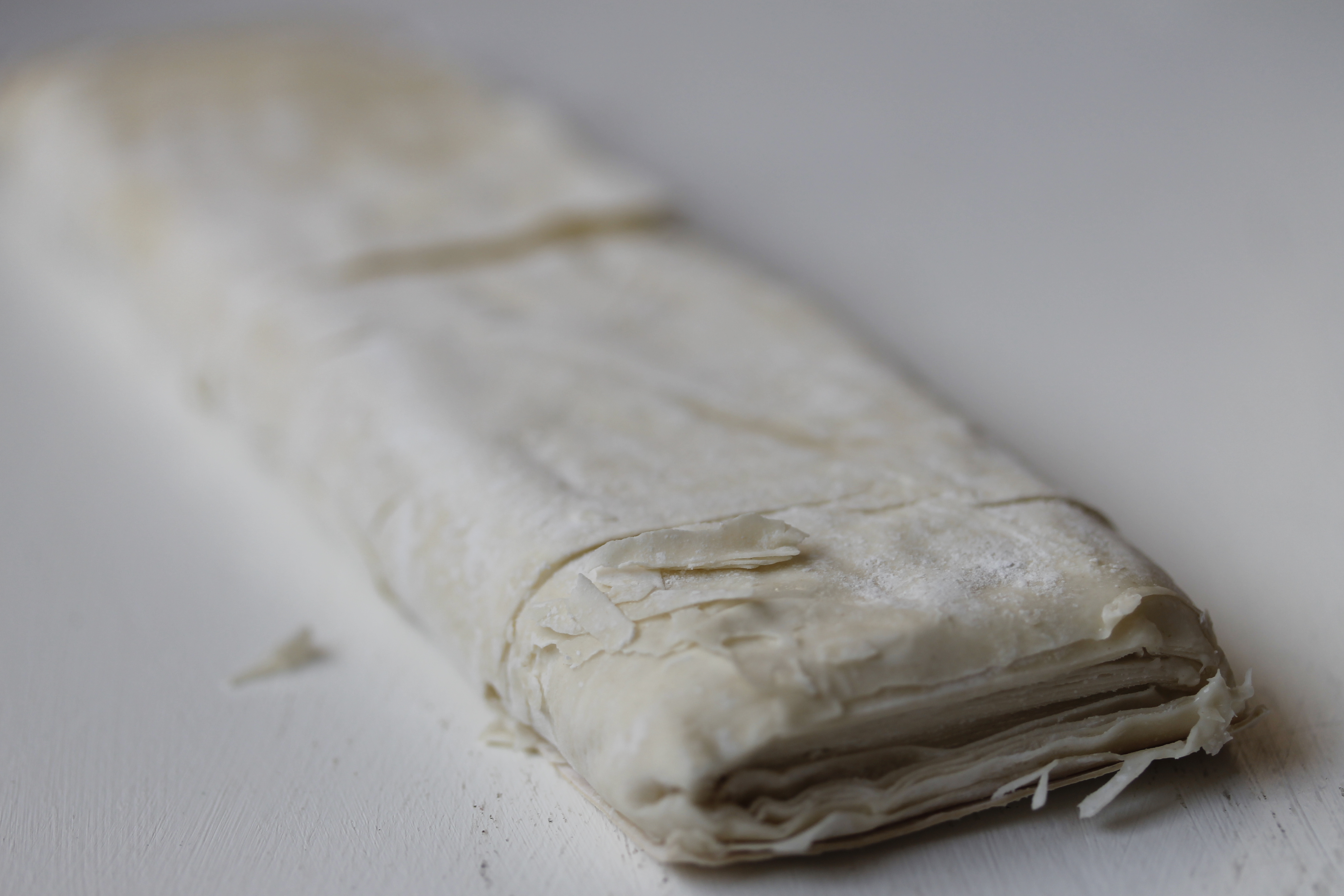 Deigið er mjög þunnt en hafi það ekki þiðnað of hratt eða þornað er það ekki eins viðkvæmt og það lítur út fyrir. En það skiptir máli að vinna frekar hratt og fylling sem sett er í deigið má ekki vera of blaut og best að hún sé köld – það er þó óþarfi í uppskriftinni hér á eftir þar sem bakan er í formi.