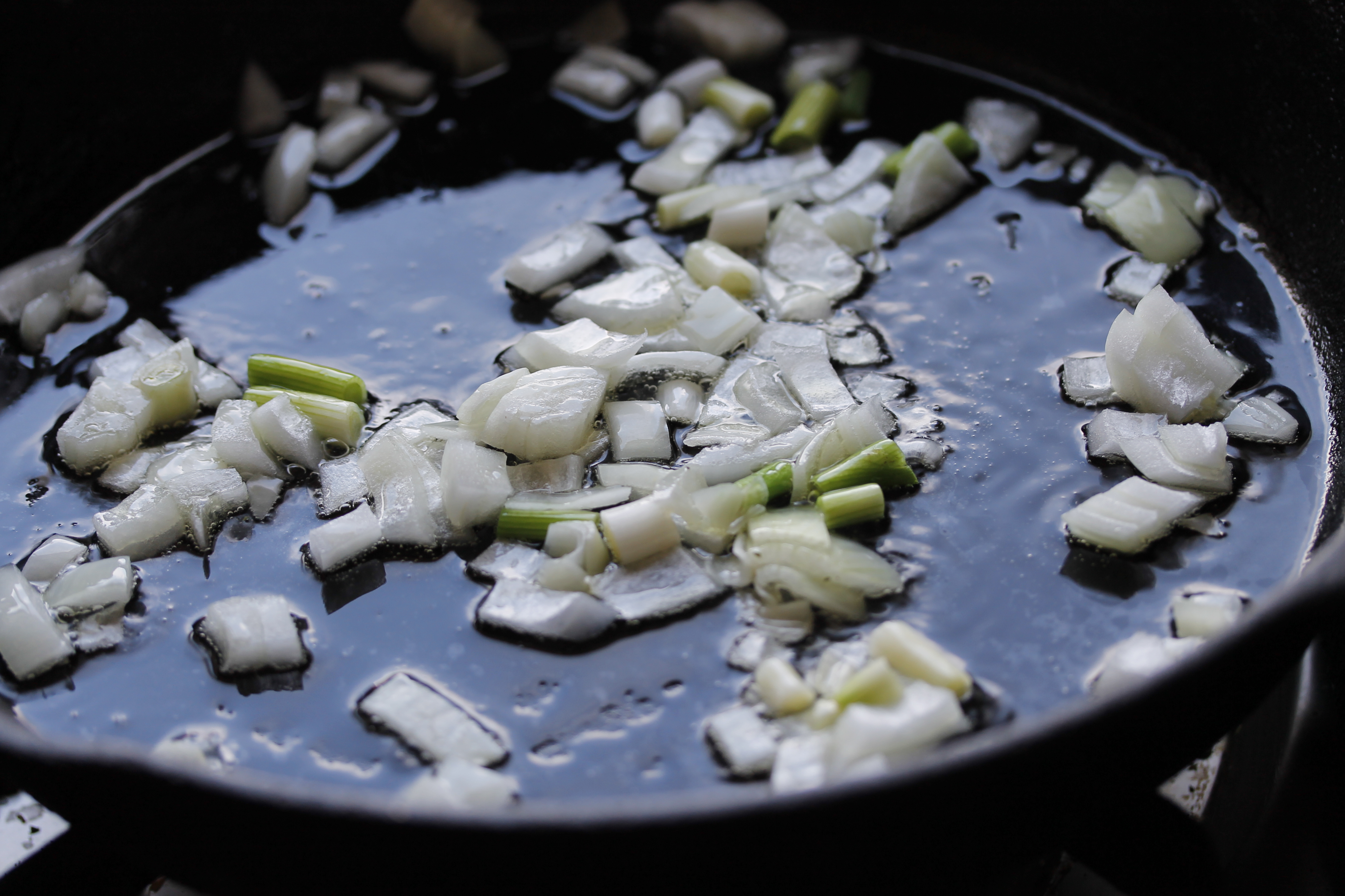Ég hitaði olíuna á pönni, saxaði laukinn og hvíta hlutann af vorlauknum, setti á pönnuna og lét krauma í nokkar mínútur án þess að brúnast.
