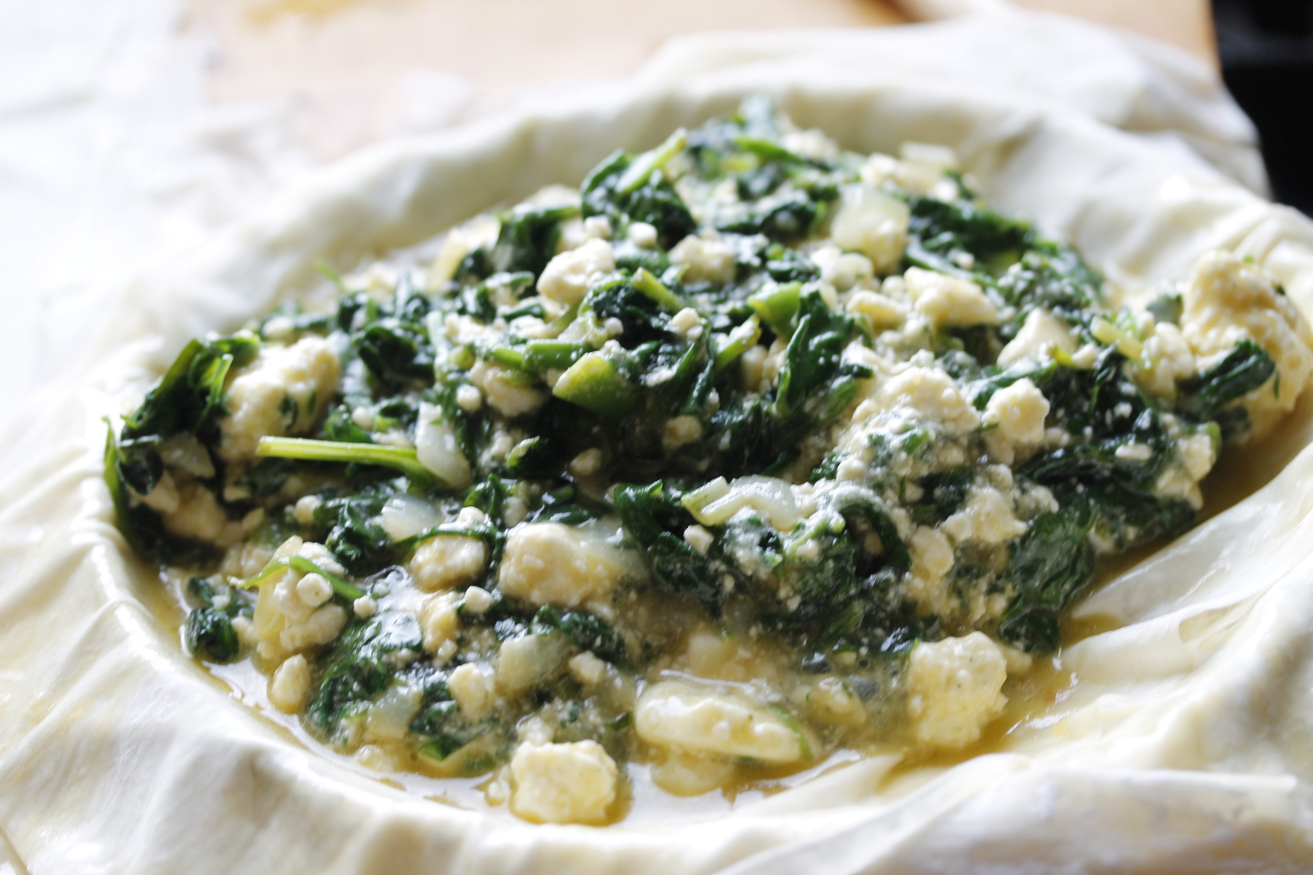 Ég notaði sem sagt 1 pakka af blaðdeigi (6 þynnur), 4 msk af ólífuolíu, 1 lítinn lauk, 4-5 vorlauka, 300 g af spínati, lófafylli af steinselju, svolítið salt, pipar, 250 g af fetaosti (kubb), 3 egg og 100 g af smjöri (eða reyndar þurfti ég aðeins meira).