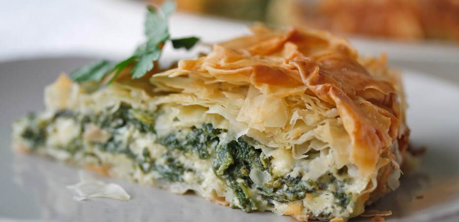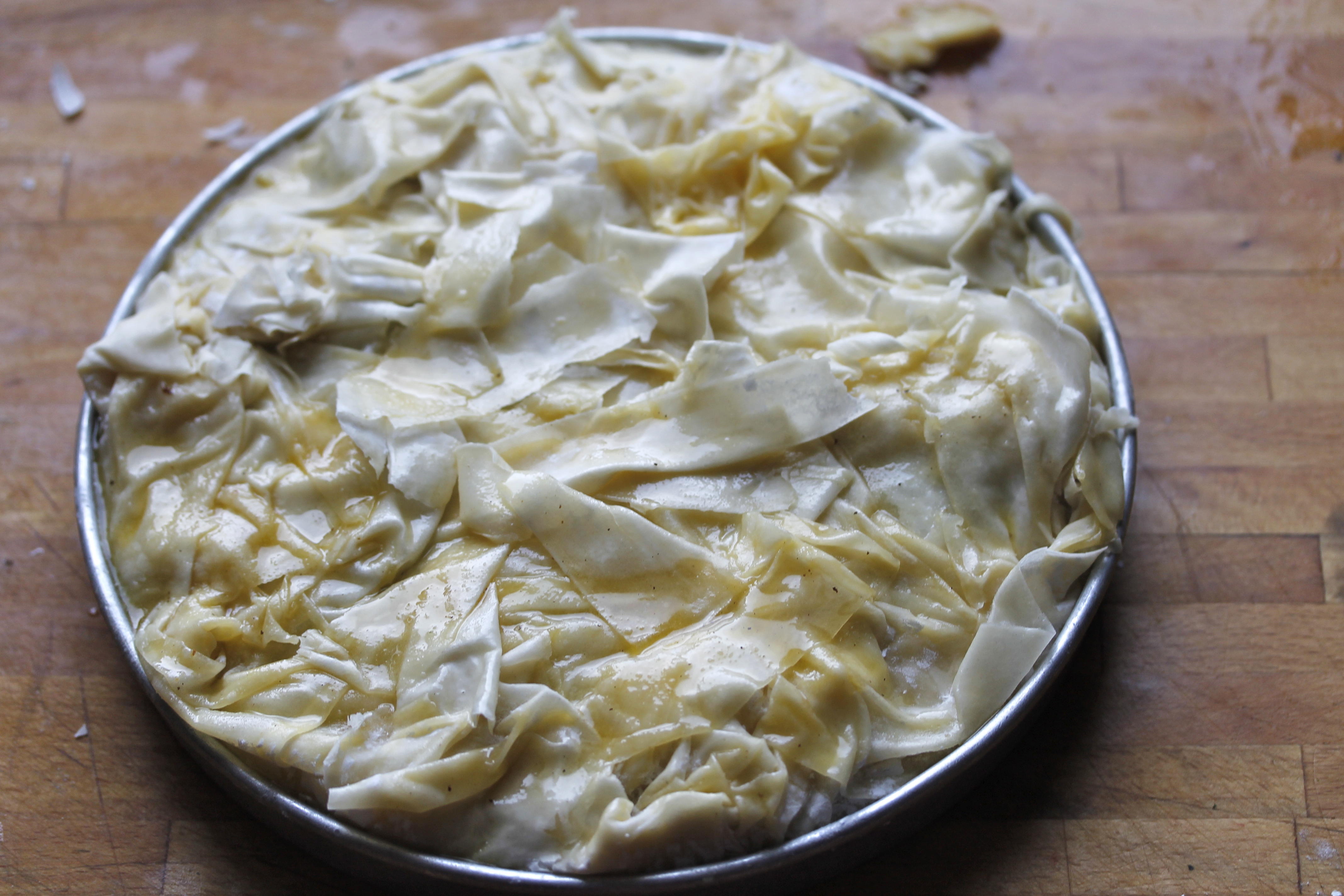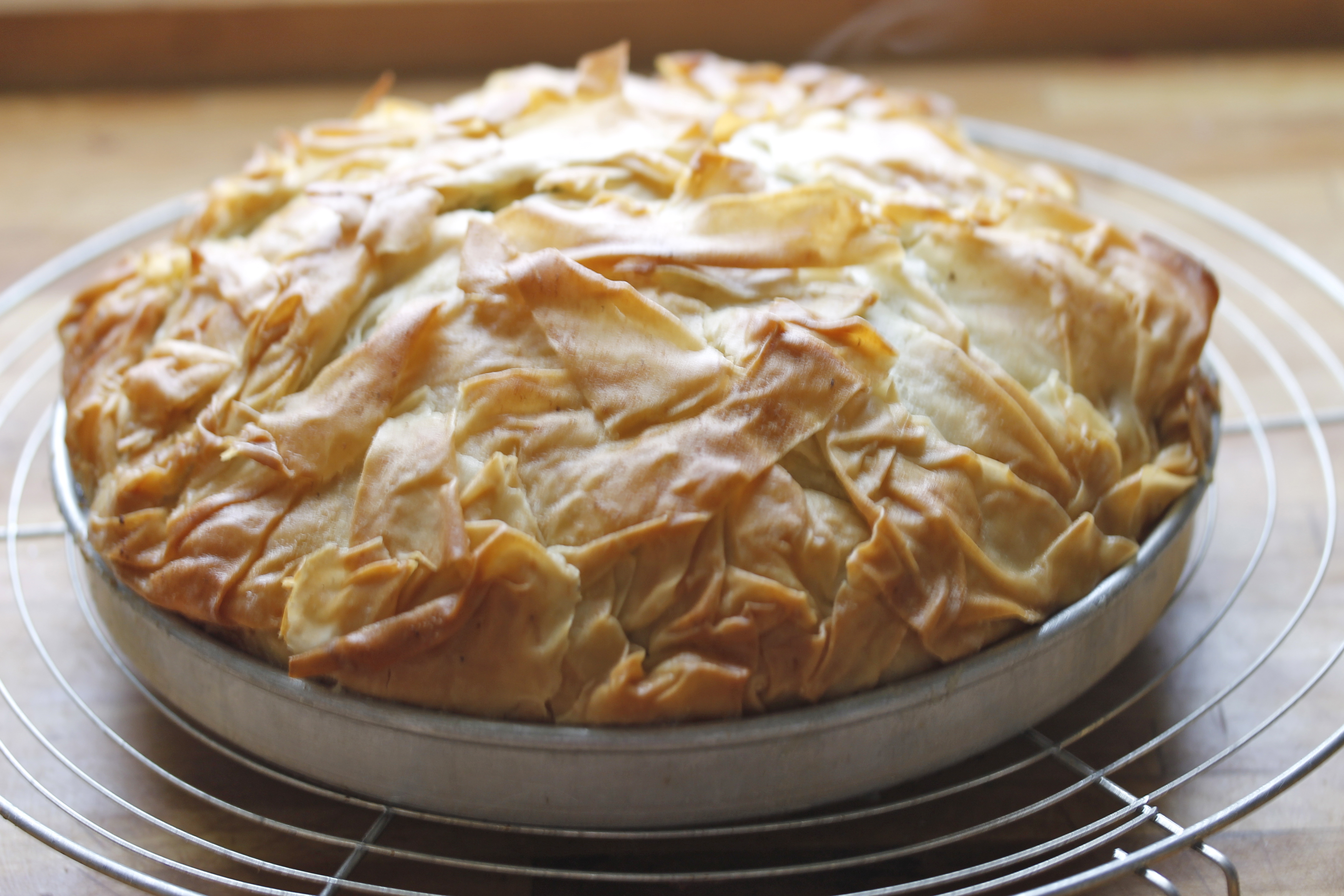Þegar ég var að gera þátt um grískan páskamat fyrir páskablað MAN setti ég saman matseðil í samráði við gríska matreiðslubókahöfundinn Aglaiu Kremezi, sem ég hef kynnst á ráðstefnum í Oxford og rekur matreiðsluskóla á eynni Kos. Ýmislegt kom til greina og upphaflega planið var að nota fillódeig jafnvel í nokkra rétti. En þegar ég var búin að fara á milli nokkurra búða og kaupa upp birgðirnar af fillódeigi í tveimur (það var til einn pakki í annarri, tveir í þeirri næstu), þá rann upp fyrir mér að það væri líklega ekkert gáfulegt að vera með mikið af því. Ég lét því spanakopituna nægja, fannst hún ómissandi. Og það er nú yfirleitt hægt að hafa upp á fillódeigi ef þörf krefur.