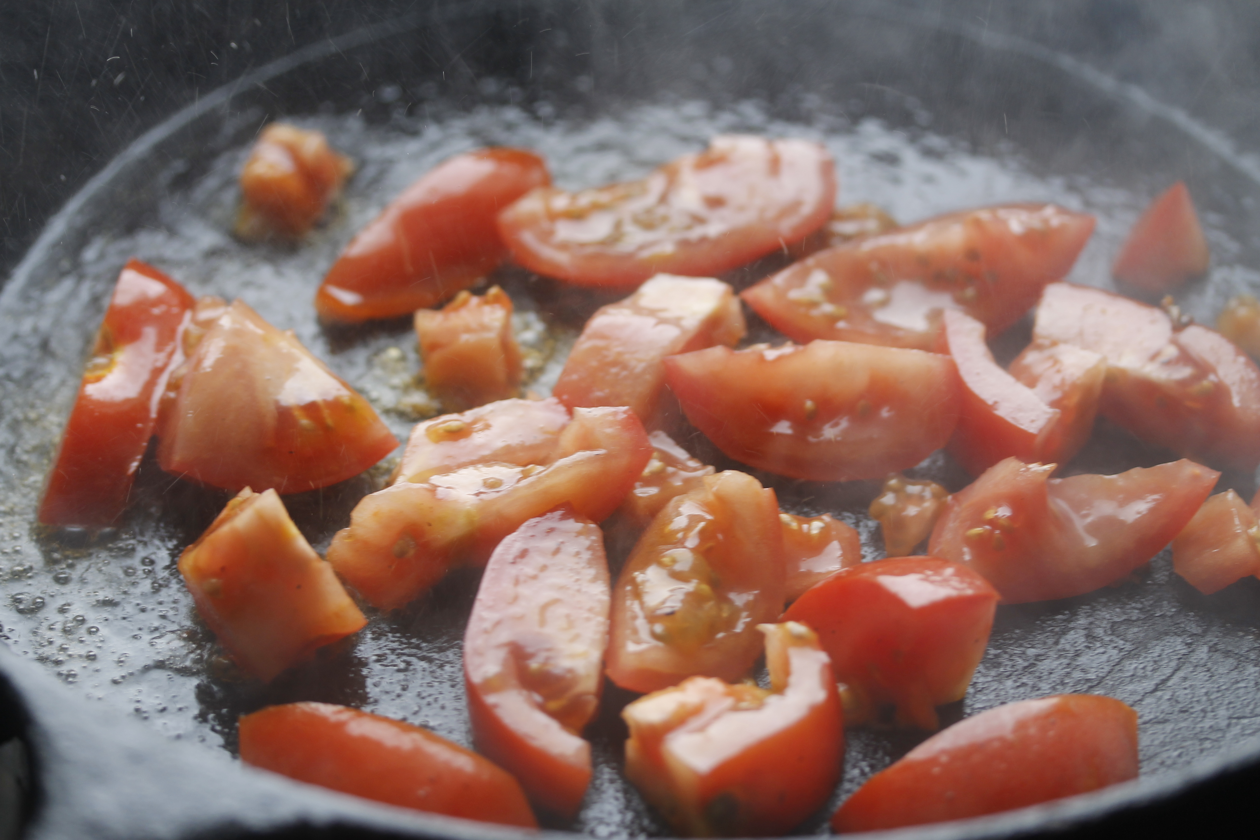 Svo tók ég 3-4 vel þroskaða tómata og saxaði þá gróft. Ég notaði bara sömu pönnuna og ég hafði steikt tómatana á en ef ég hefði grillað þá hefði ég þurft að hita þykkbotna pönnu. Hellti 1-2 msk af ólífuolíu á pönnuna og hitaði, setti svo tómatana á hana og kryddaði með pipar og salti.