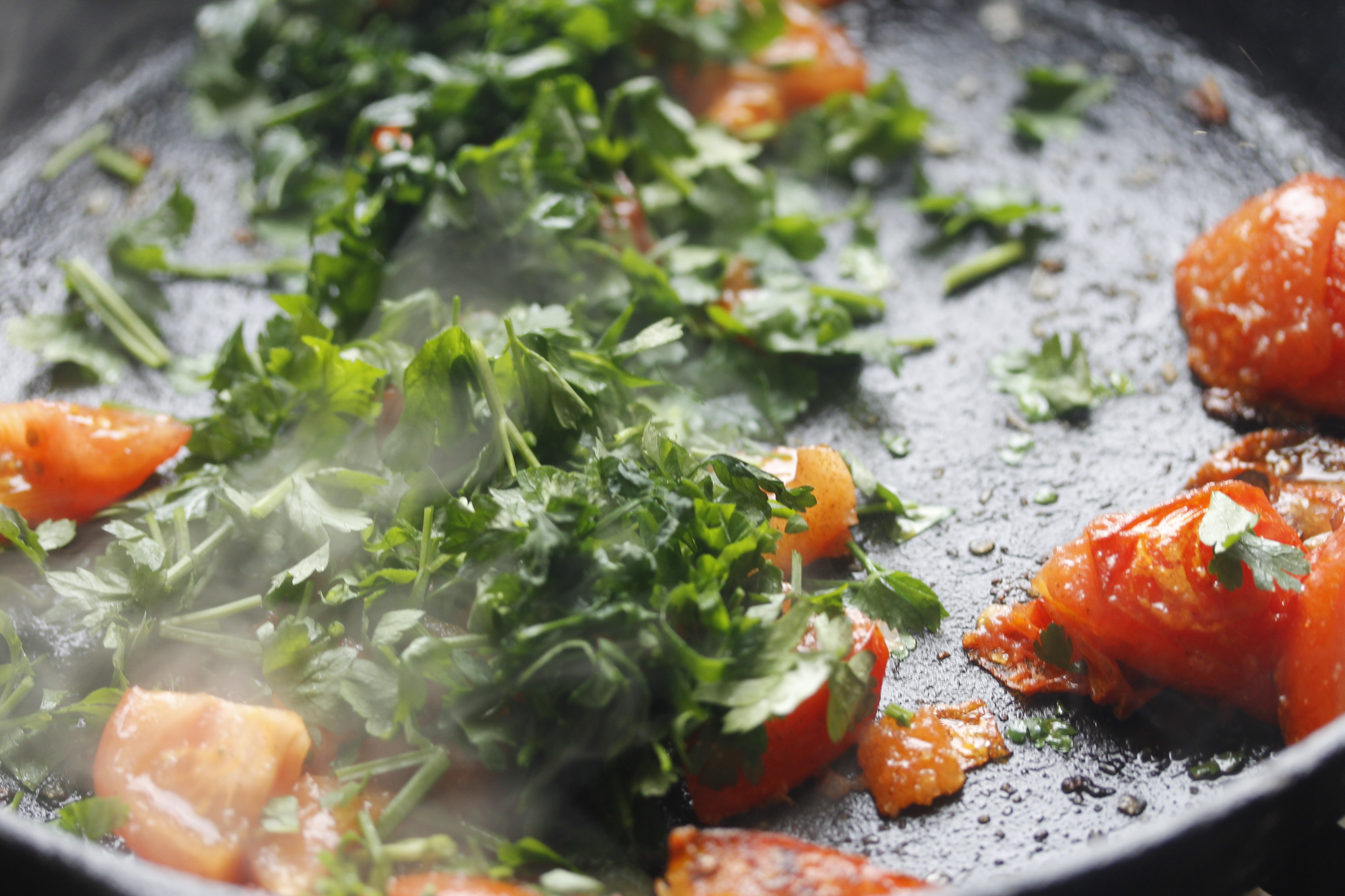 Ég steikti þá í 2-3 mínútur, eða þar til tómatarnir eru farnir að mýkjast, og hrærði oft á meðan. Svo saxaði ég lófafylli af steinselju, hrærði henni saman við og taktu af hitanum.