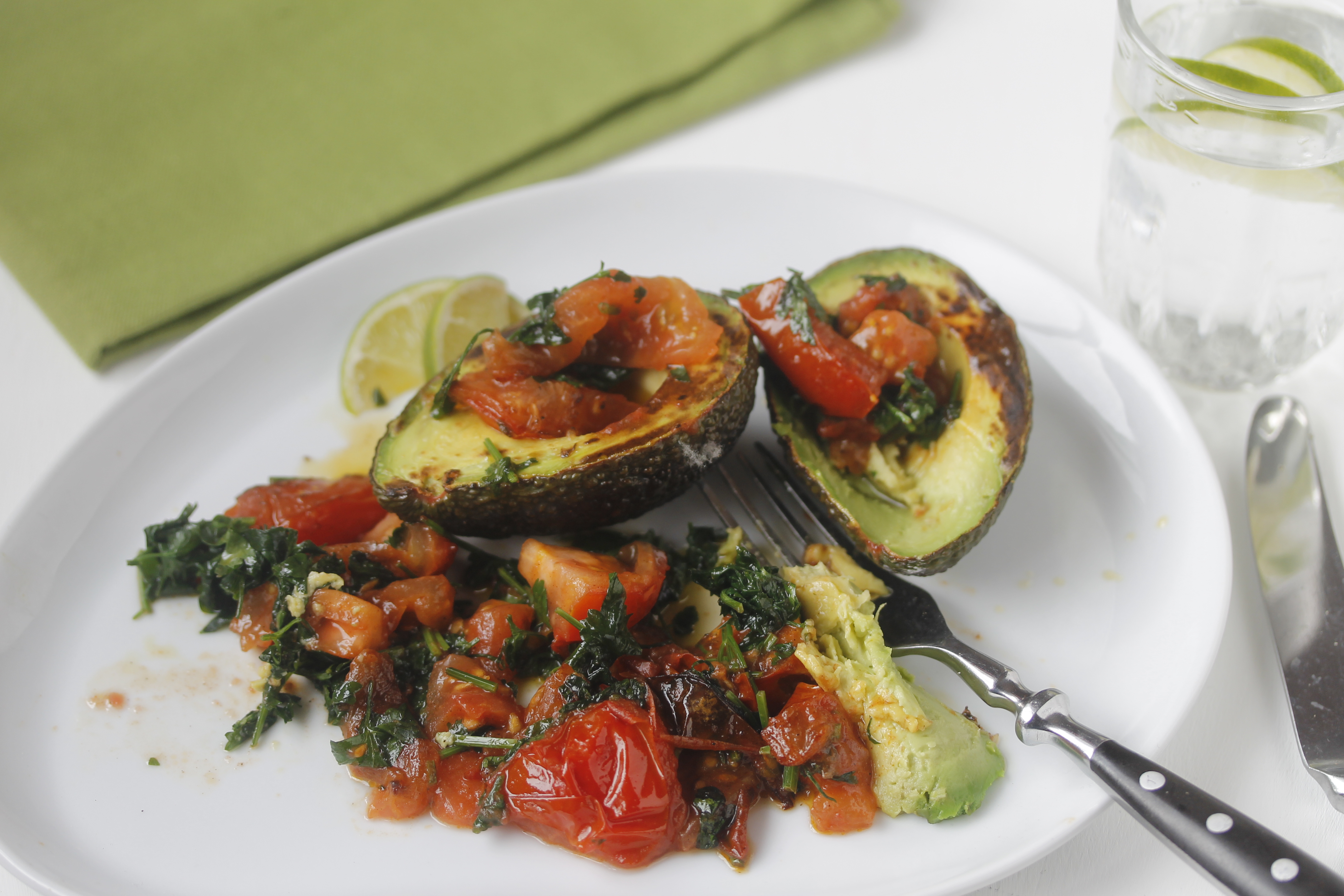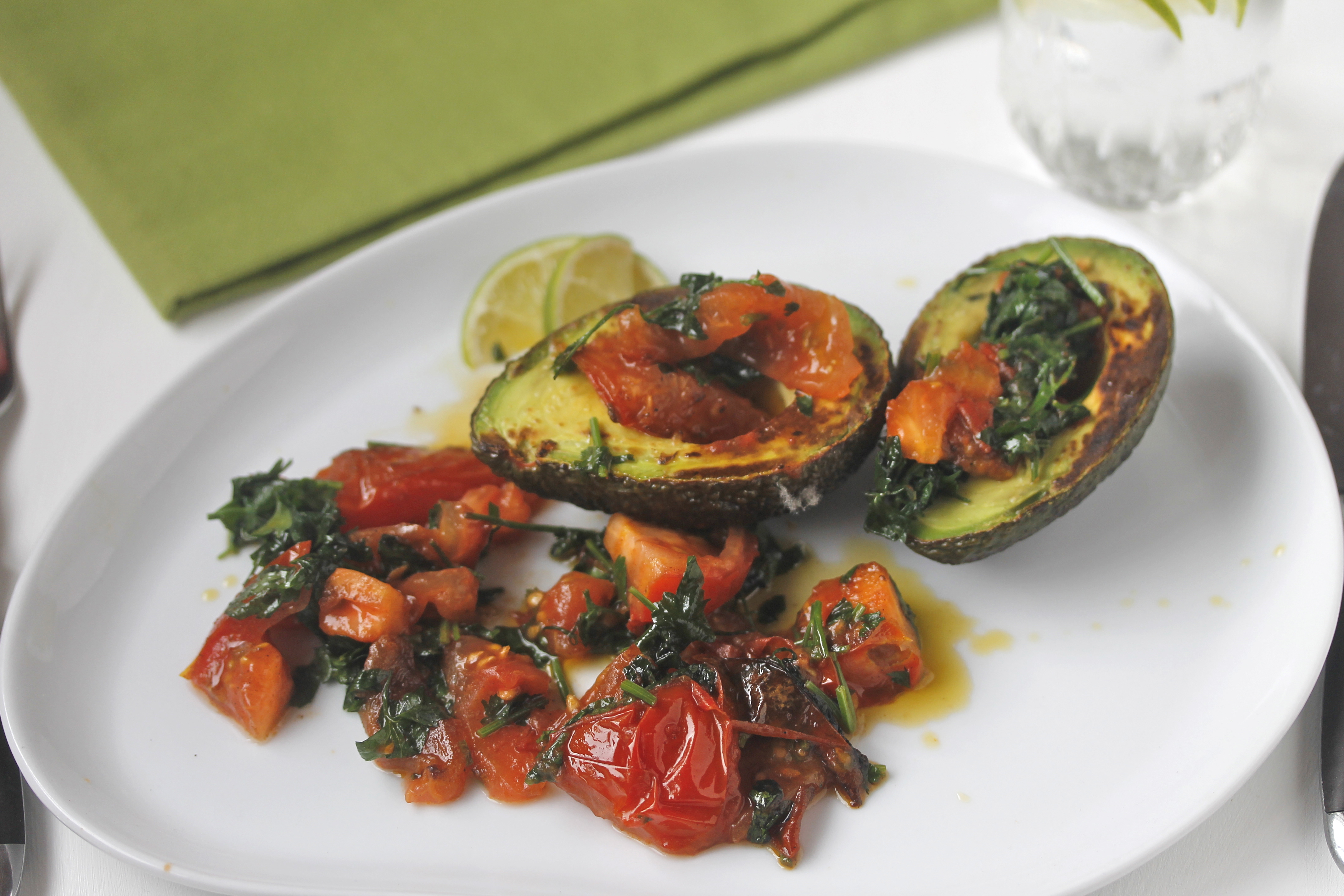 En hér er samt uppskrift að steiktum eða grilluðum lárperum. Þær eru þó ekki bornar fram heitar og hitna raunar ekki í gegn þann stutta tíma sem þær eru á grillinu eða pönnunni, auk þess sem þær bíða svo í nokkrar mínútur á meðan tómatarnir eru steiktir. Þær eru því bara rétt volgar en fá í sig skemmtilegan grillkeim. Þetta gæti verið forréttur eða hádegismatur með góðu brauði og grænu salati. Ég bjó uppskriftina til i fyrir maíblað MAN og þar var hún fyrir fjóra en þessi er fyrir tvo (eða fjóra sem forréttur) því að það var sá skammtur sem ég útbjó fyrir myndatökuna, annars er ekkert mál að stækka hana eða minnka.