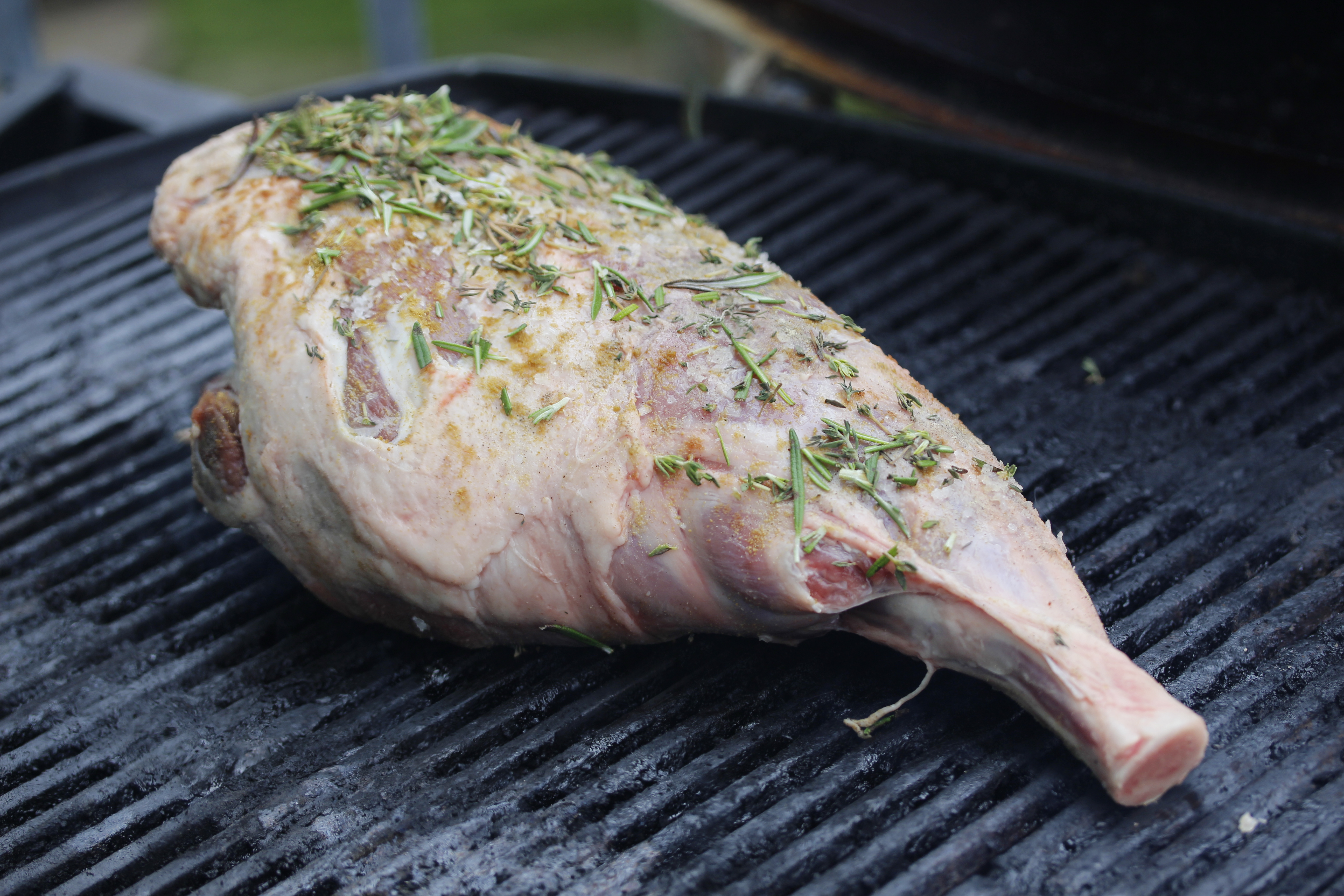 Ég kveiksi svo á á grillinu, hafði það lokað og hitaði það vel. Á meðan kryddaði ég lærið á öllum hliðum með söxuðum nálum af 2-3 rósmaríngreinum, 1 tsk af kummini, pipar og salti (flögusalti, en það er svosem ekki nauðsynlegt). Enginn hvítlaukur, ekki í þetta skipti.
