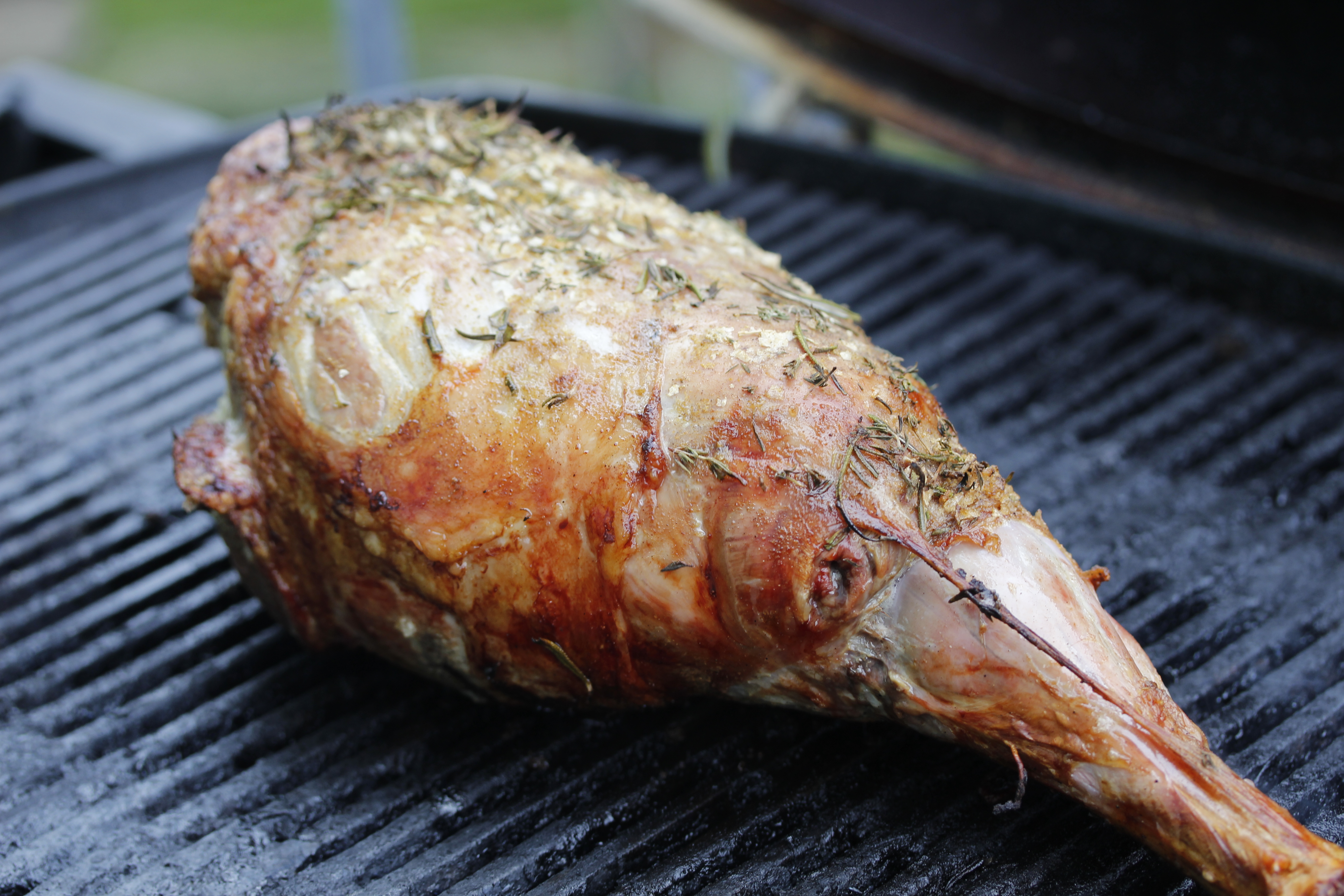 Ég leit aðeins á lærið eftir hálftíma en annars er best að hafa grillið sem allra mest lokað og vera ekkert að hreyfa við lærinu. Í hvert skipti sem grillið er opnað tapast hiti og grilltíminn lengist aðeins. Tíminn fer annars eftir ýmsu, gerð grillsins og ekki síst loksins á þvi (lokið endurkastar hita niður á lærið svo það steikist ekki síður að ofan og maður þarf ekkert að snúa því), lofthita, vindi og fleiru. Ég fylgdist með hitamælinum á lokinu og passaði að hitinn væri yfir 200°C allan tímann, hann var oftast í kringum 215
