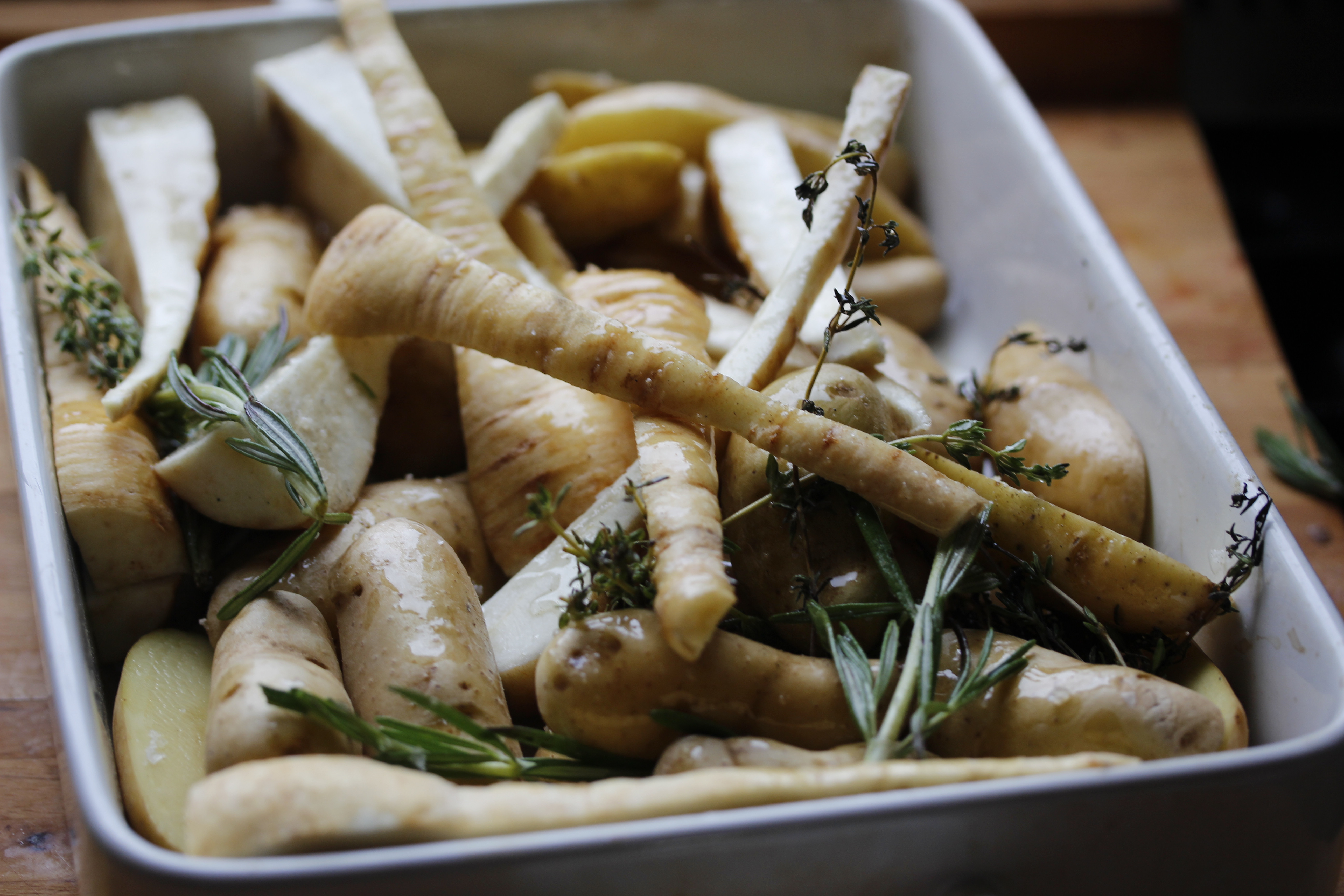En á meðan lærið var á grillinu hitaði ég ofninn í 200°C, skar svona 800 g af kartöflum (frönskum ratte-kartöflum en það má auðvitað nota aðrar tegundir, gjarna aflangar) í tvennt eftir endilöngu, skar 3-4 nípur í fjórðunga og setti þetta í eldfast mót ásamt ólífuolíu, 2-3 rósmaríngreinum, 2-3 timjangreinum, pipar og salti. Og mig minnir endilega að ég hafi stungið nokkrum hvítlauksflísum með en er ekki alveg viss og sé það ekki á myndinni – en það sakar allavega ekki.