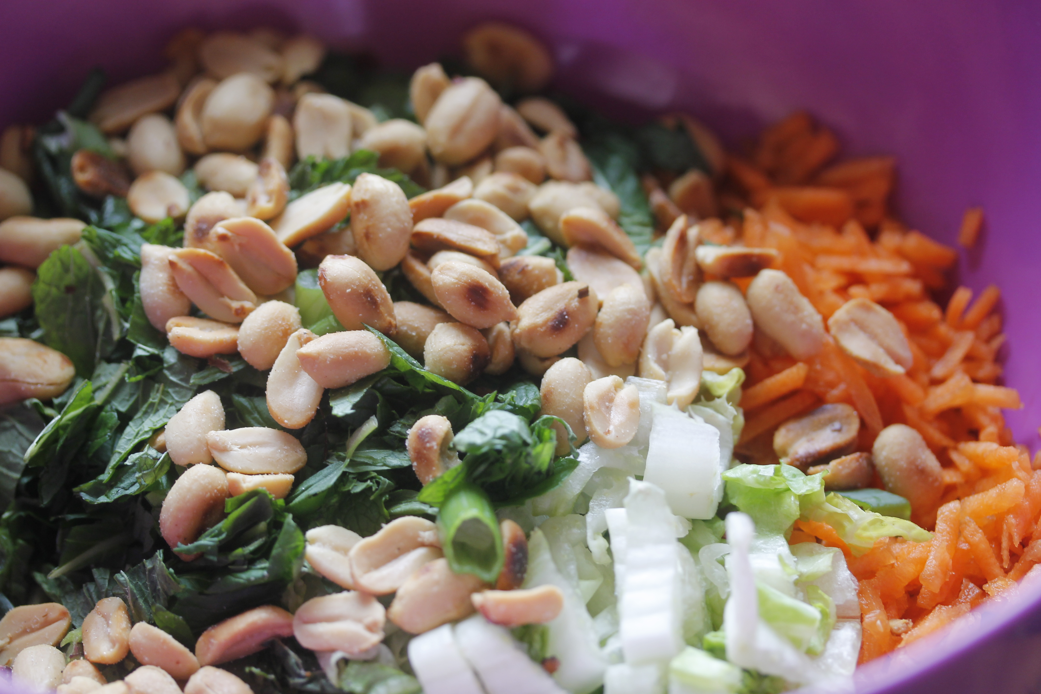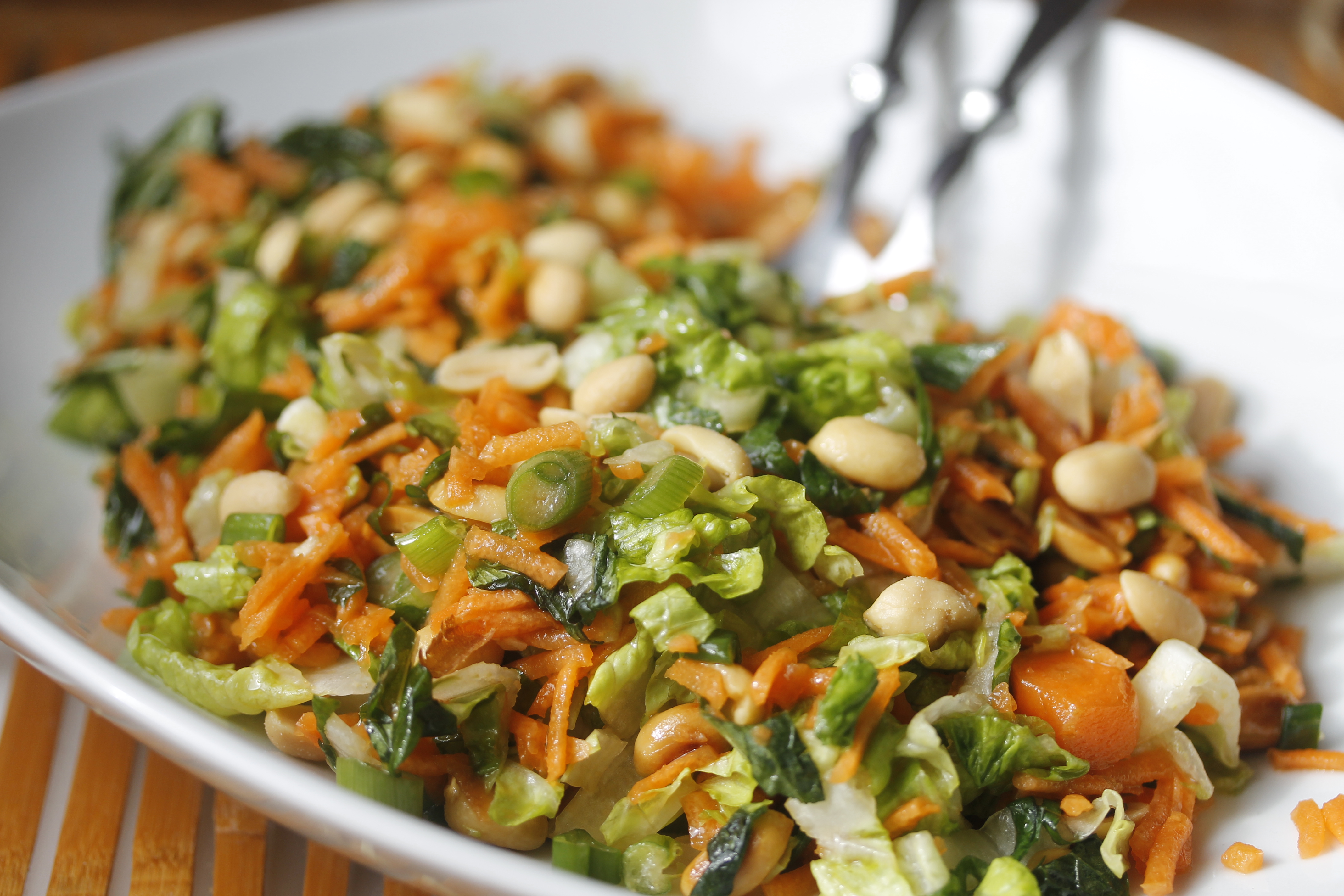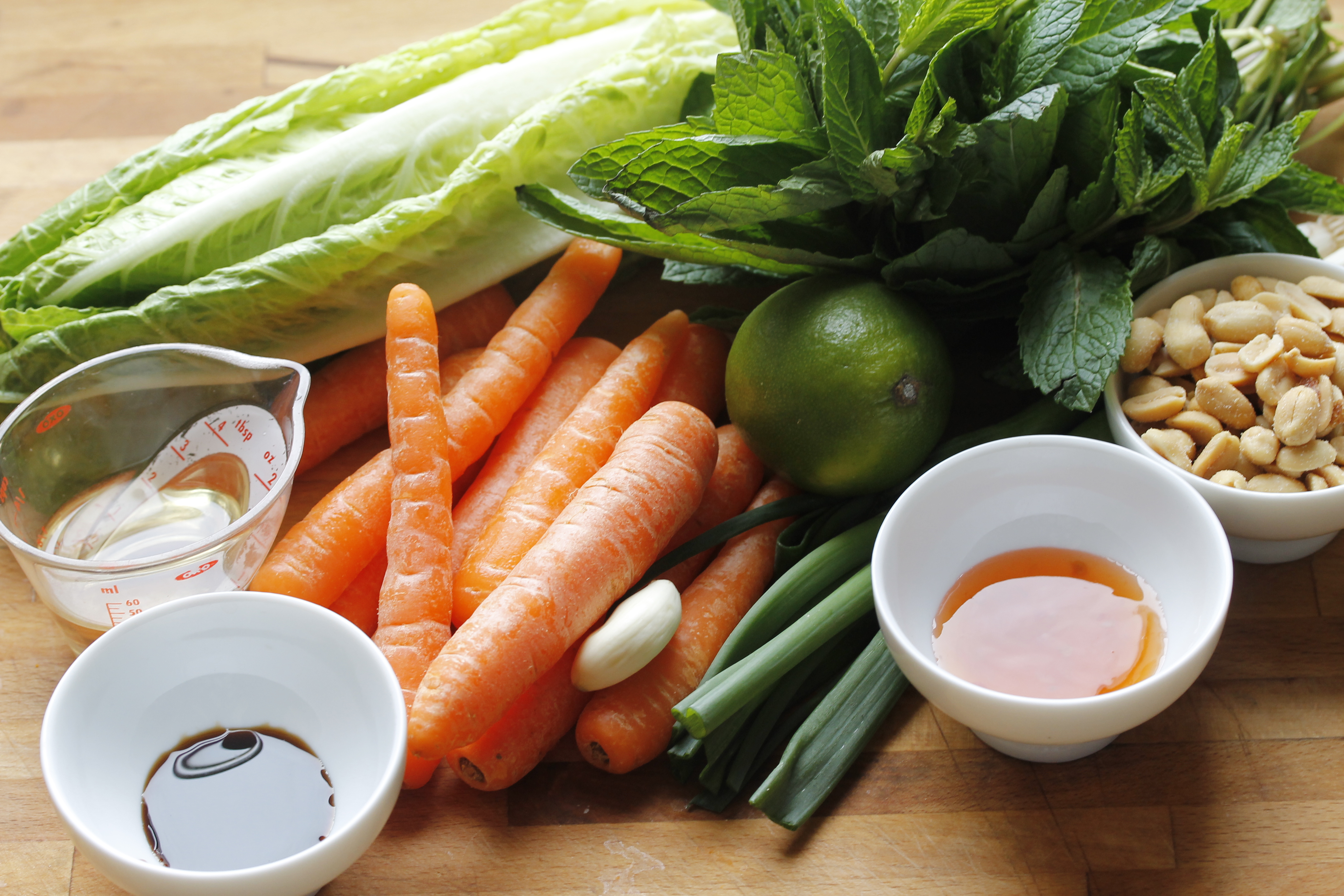 Aðalhráefnið í salatinu er gulrætur og ég notaði 400 g af þeim. Svo var ég með romaine-salat (en það má semsagt vera eitthvað annað), 80 g af salthentum, lófafylli af mintu, 3-4 vorlauka, 1 msk af sætri austurlenskri chilisósu, 1 msk af teriyakisósu (það mætti nota sojasósu), 1 msk af hvítvínsediki, 1 límónu, 2 msk af olíu og 1 hvítlauksgeira.