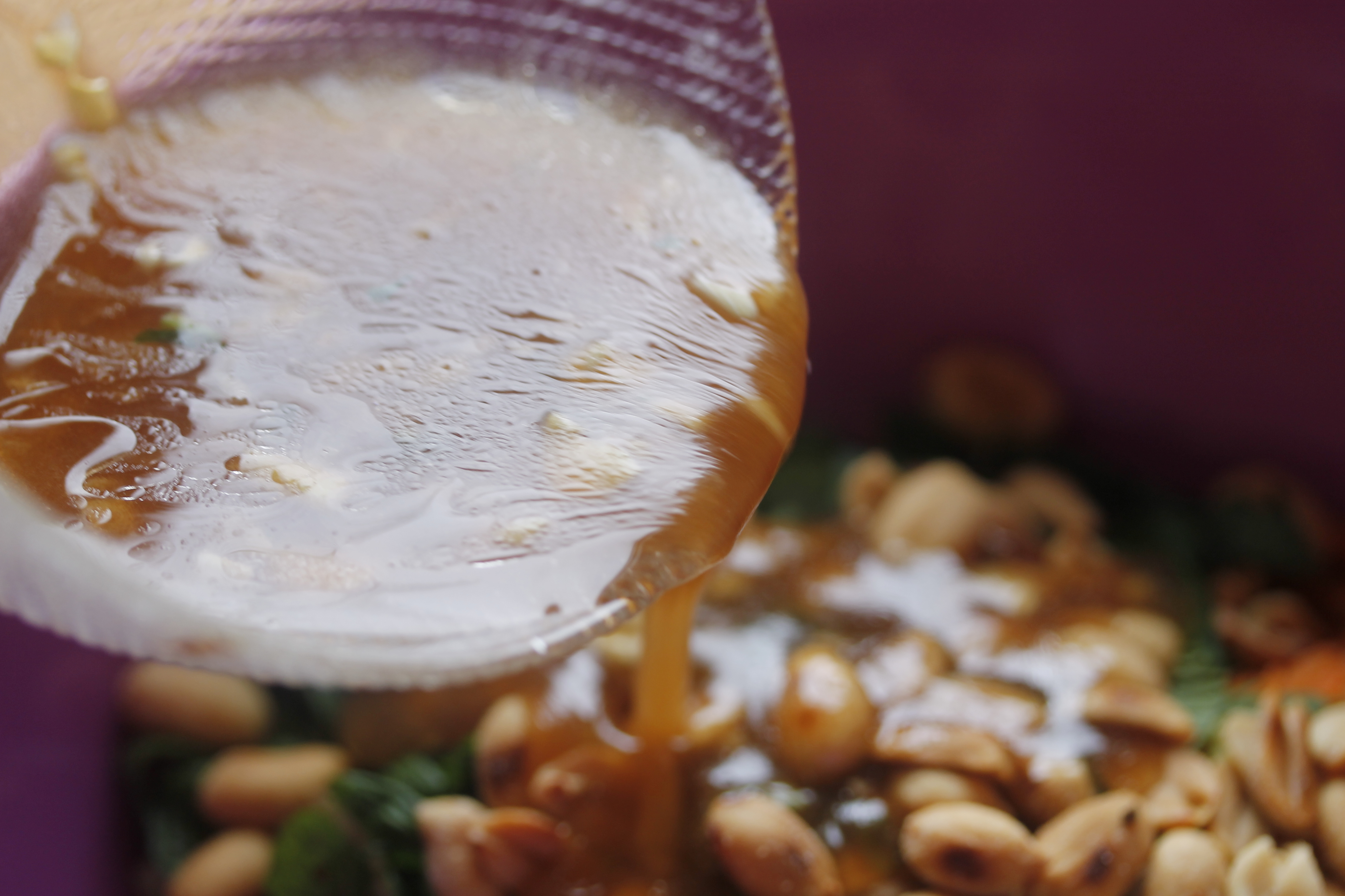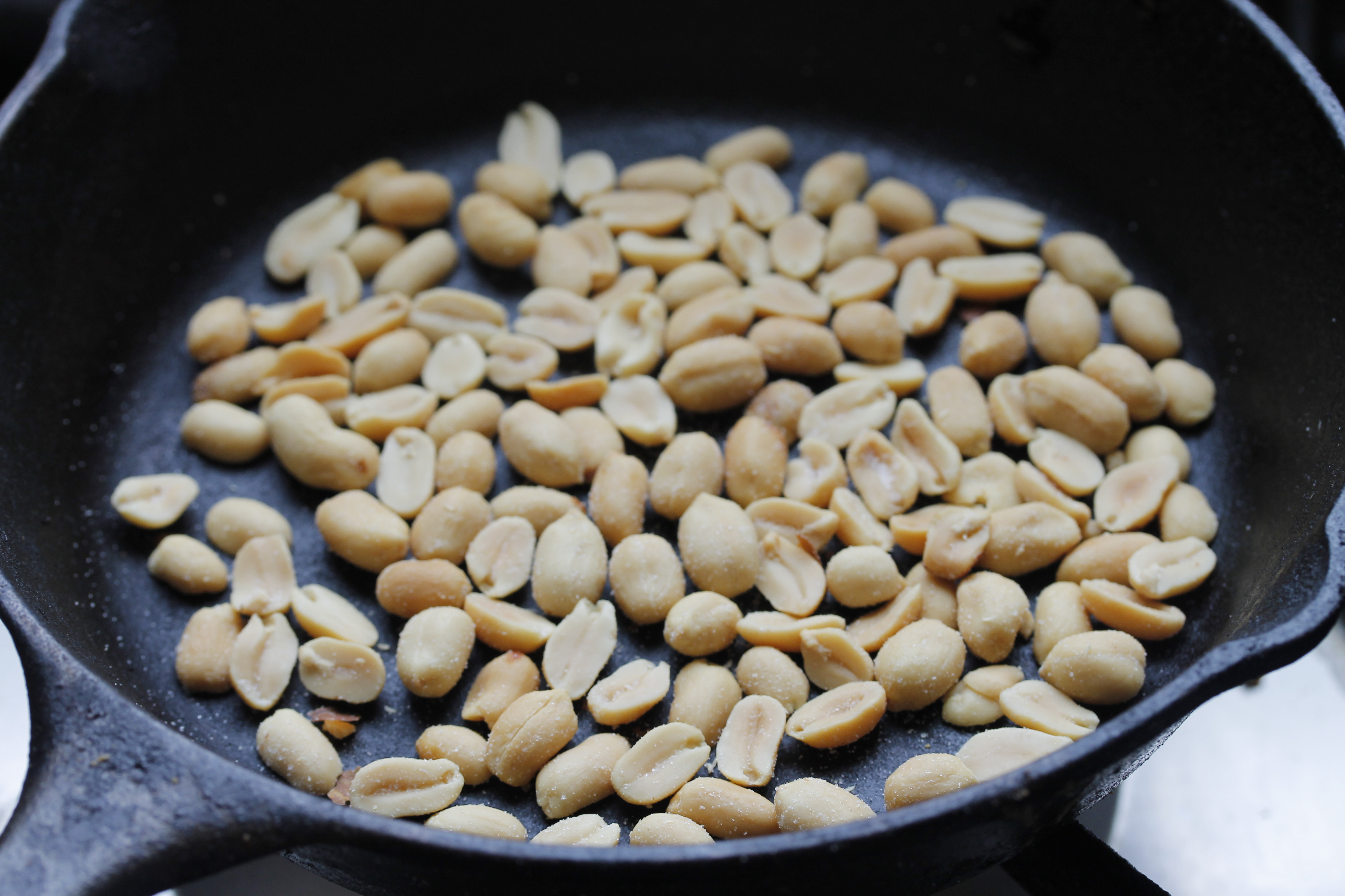 Ég byrjaði á að léttrista jarðhneturnar á þurri pönnu. Hrærði oft í á meðan og gætti þess að þær brynnu ekki. Hellti þeim svo á disk og lét kólna. Ekki sleppa því að rista hneturnar, þær verða betri.