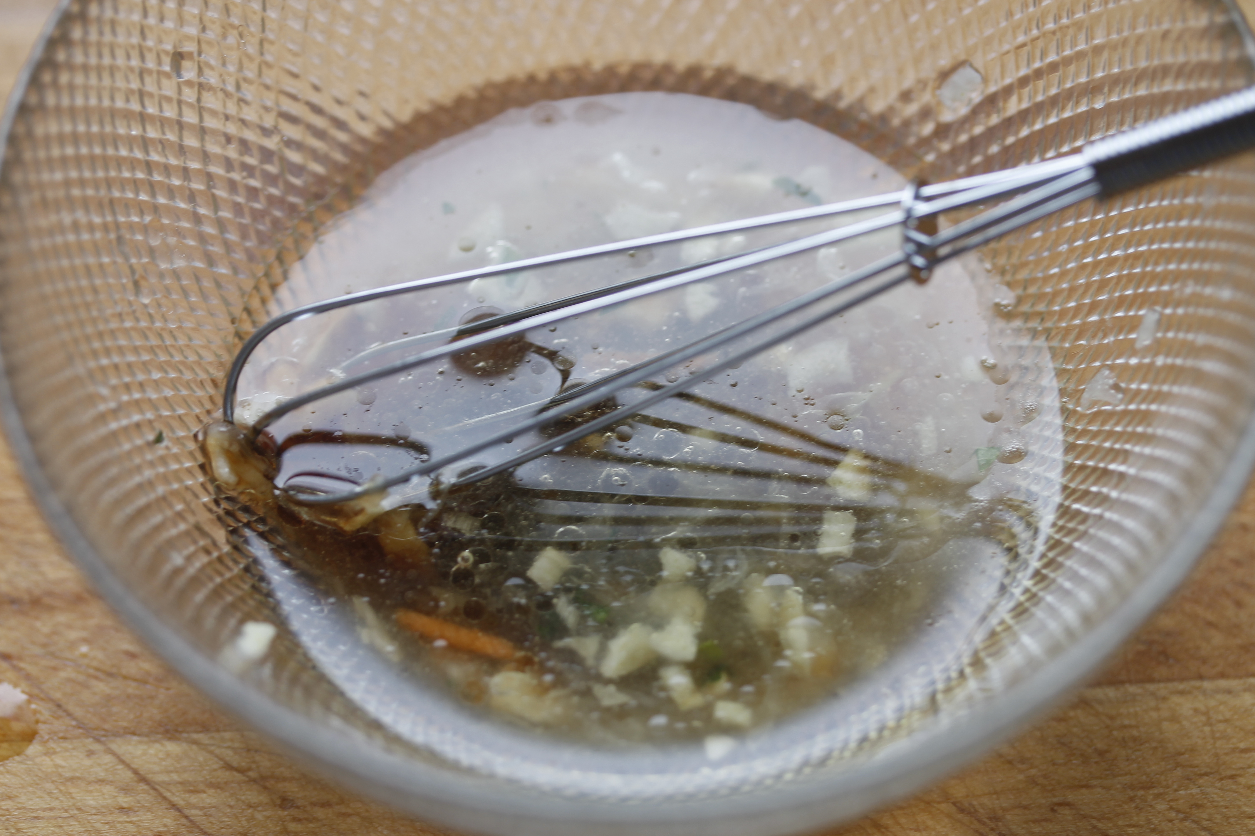 Svo setti ég chilisósu, teriyakisósu, edik, límónusafa, olíu og smátt saxaðan hvítlauk í litla skál og þeytti saman (má líka setja þetta í hristiglas).