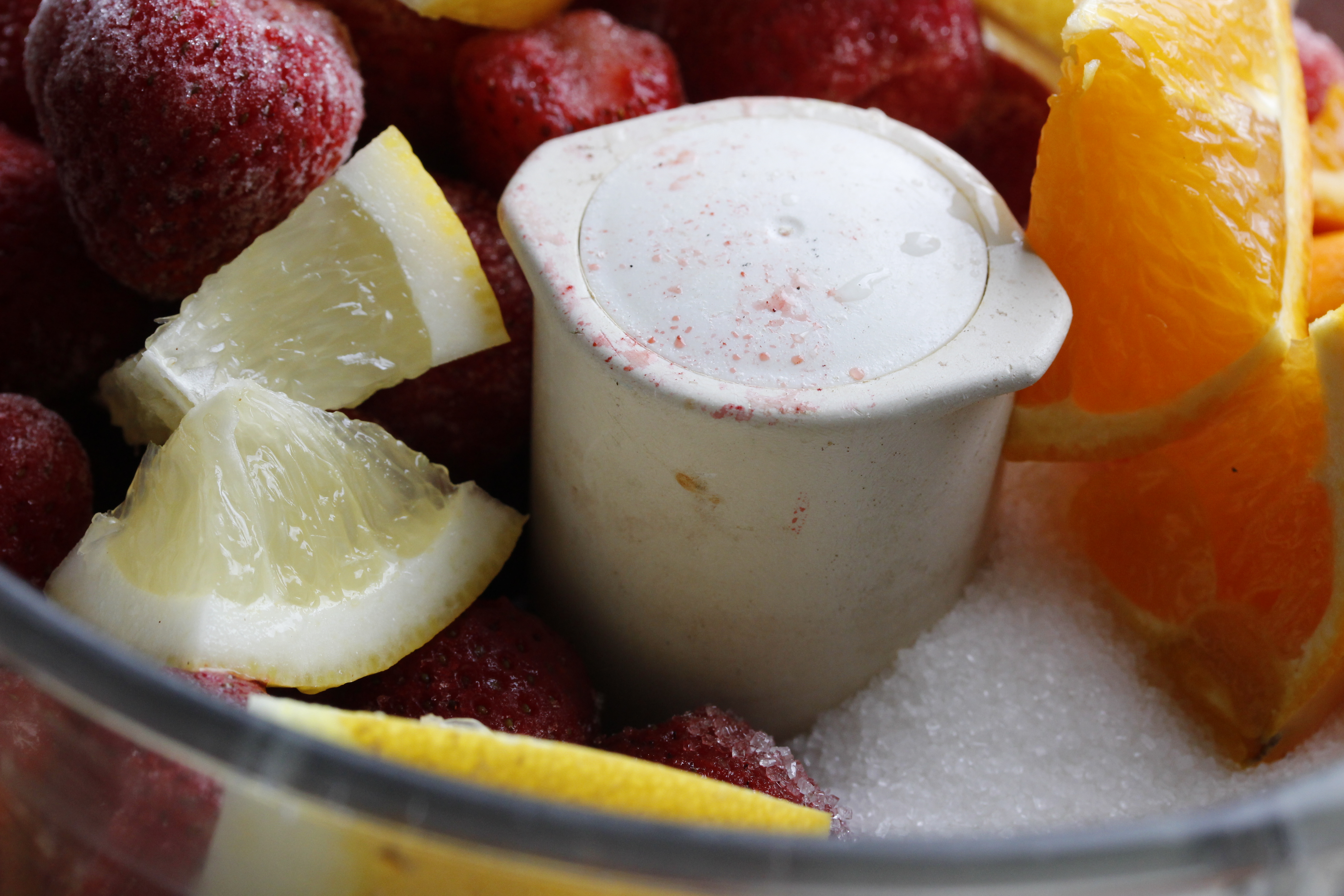 Ég byrjaði á að taka 500 g af frosnum jarðarberjum og lét þau hálfþiðna – en bara til hálfs, ekki meira. Þvoði svo eina sítrónu og eina appelsínu og skar hálfa sítrónu og fjórðung af appelsínu í bita (með berki og öllu) …