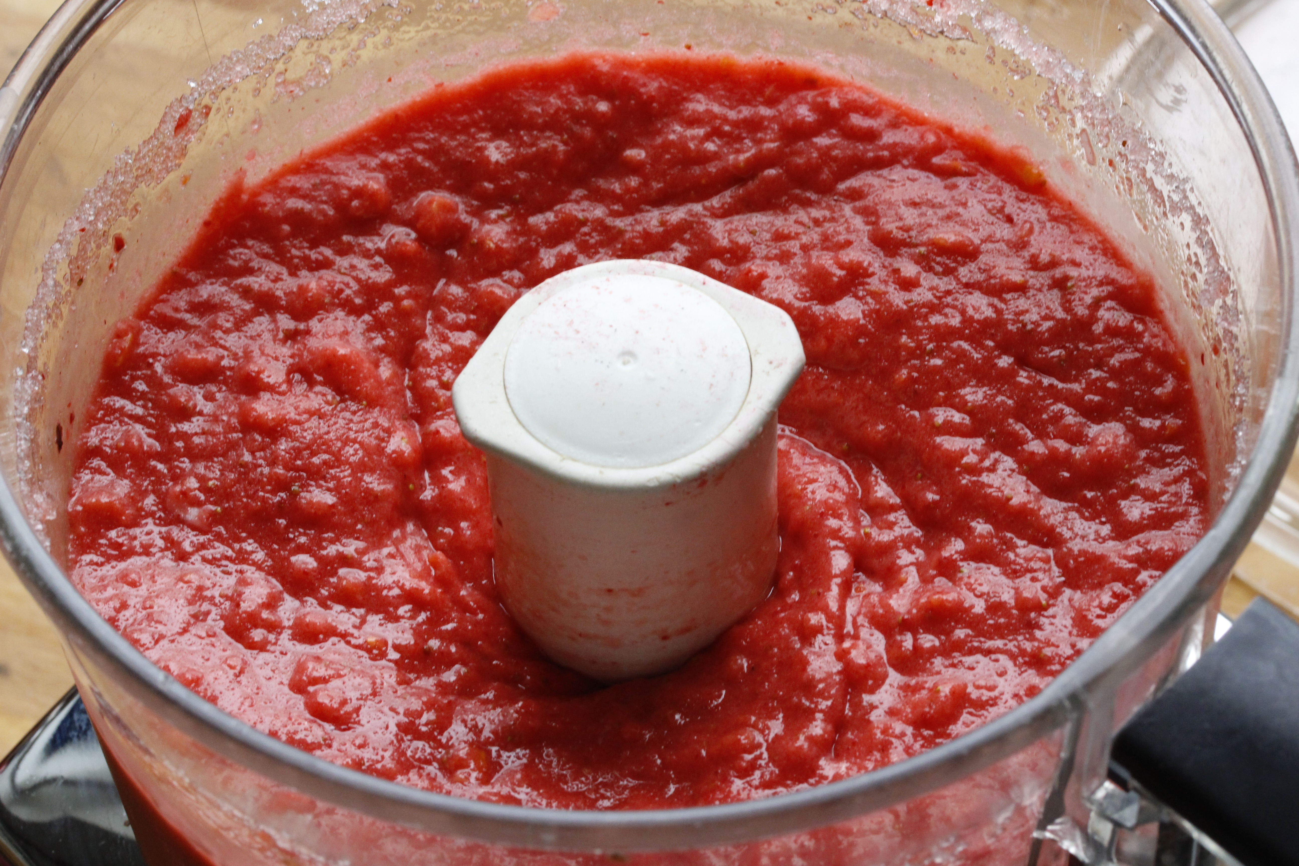 … og setti í matvinnsluvél ásamt sykrinum og hálffrosnum berjunum.