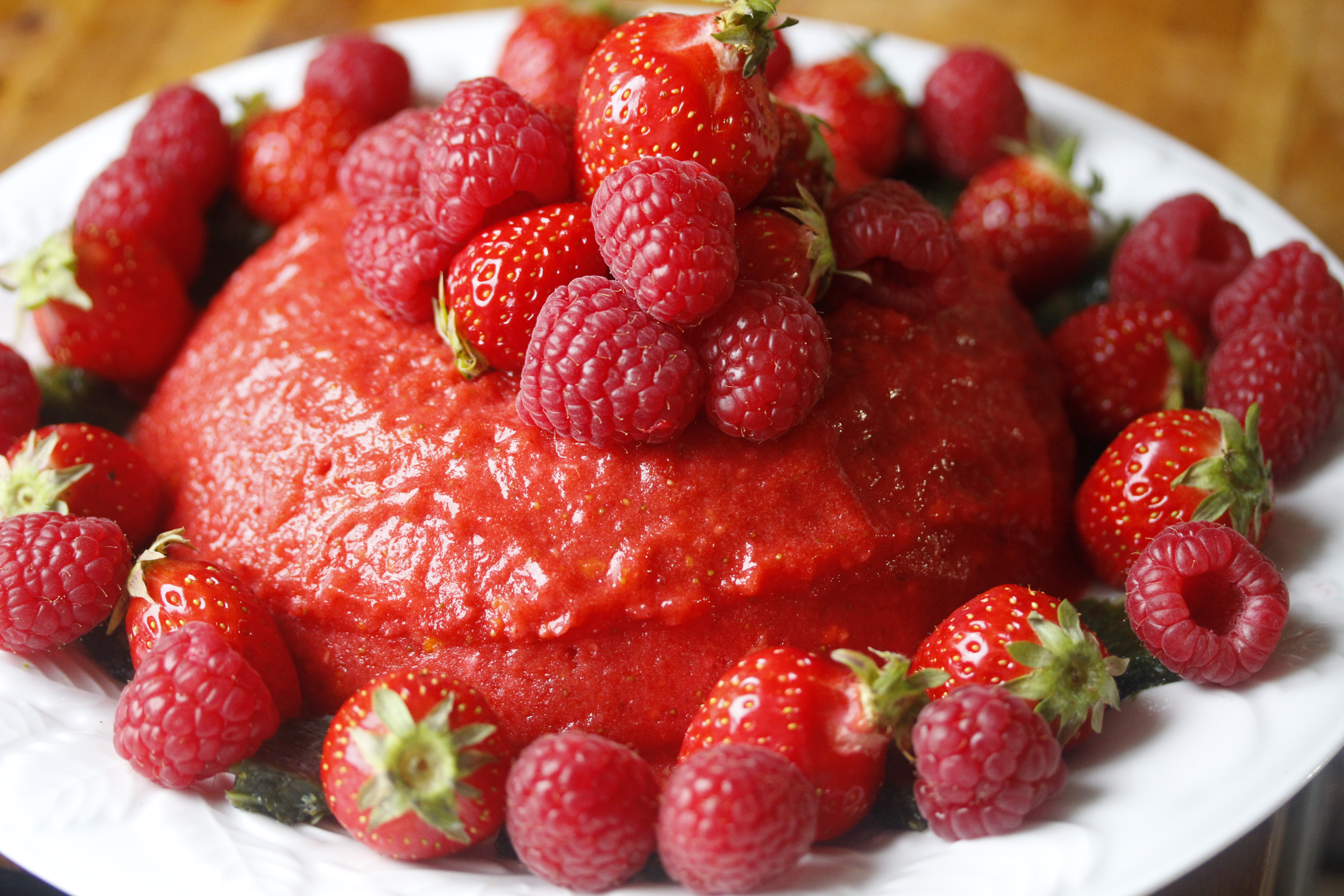 En svo hafði ég gert það áður og þá átti ég bæði fersk jarðarber og hindber til að bera fram með.