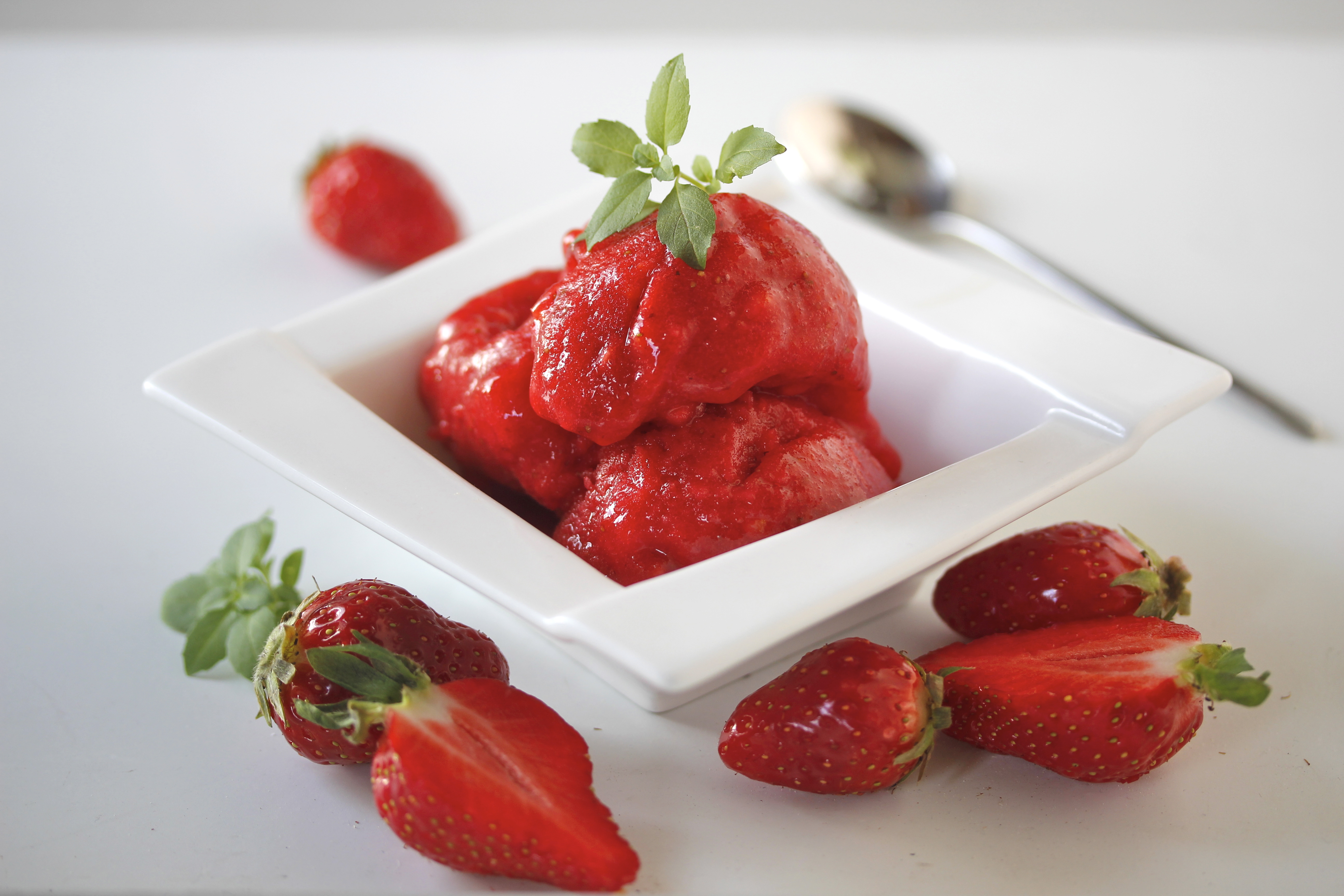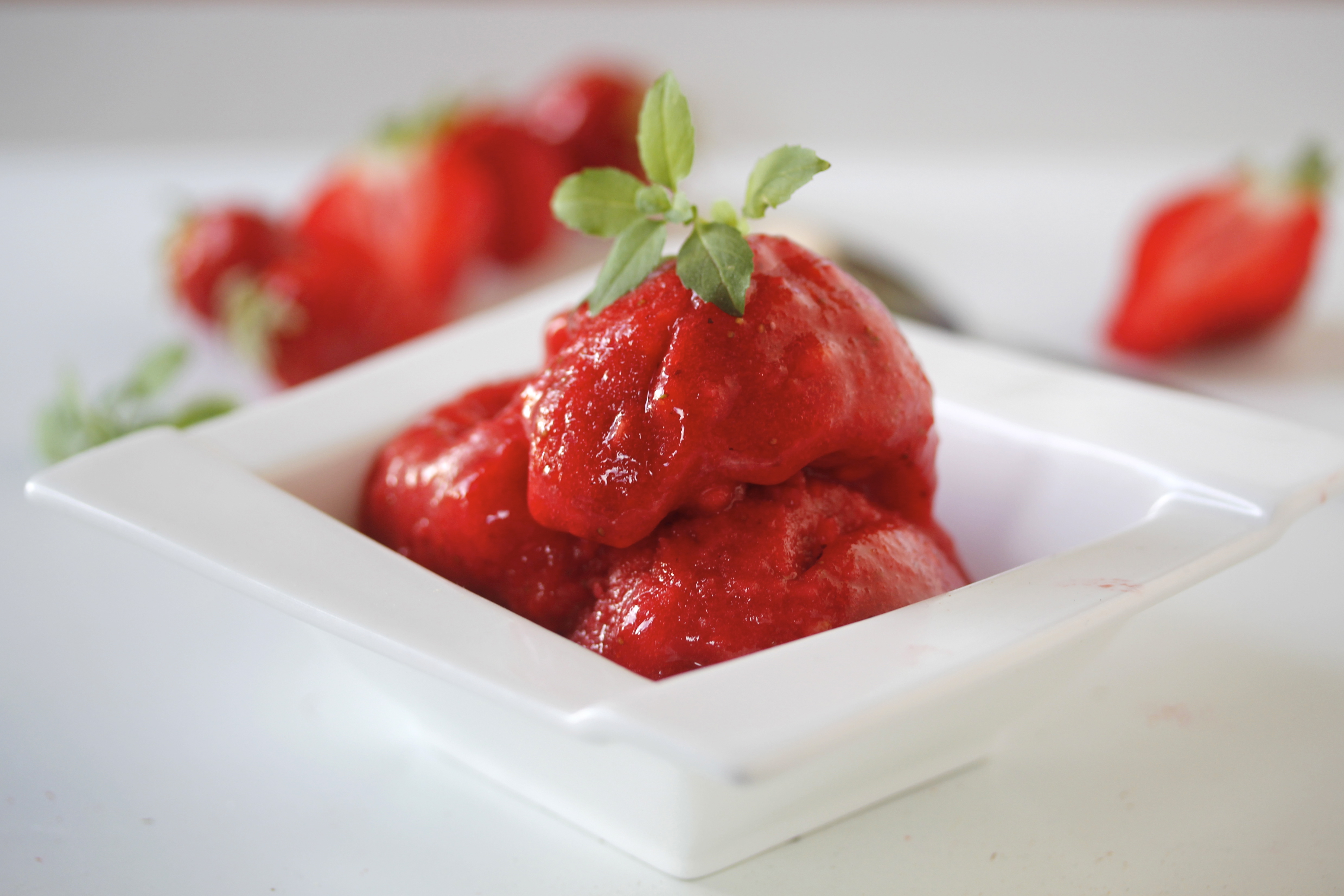 Mér finnst engin ástæða til að nota fersk jarðarber í sorbetið sjálft, þau frystu duga alveg og þá býr sorbetið sig næstum því til sjálft – en reyndar er mjög gott að bera fersk, vel þroskuð jarðarber fram með.