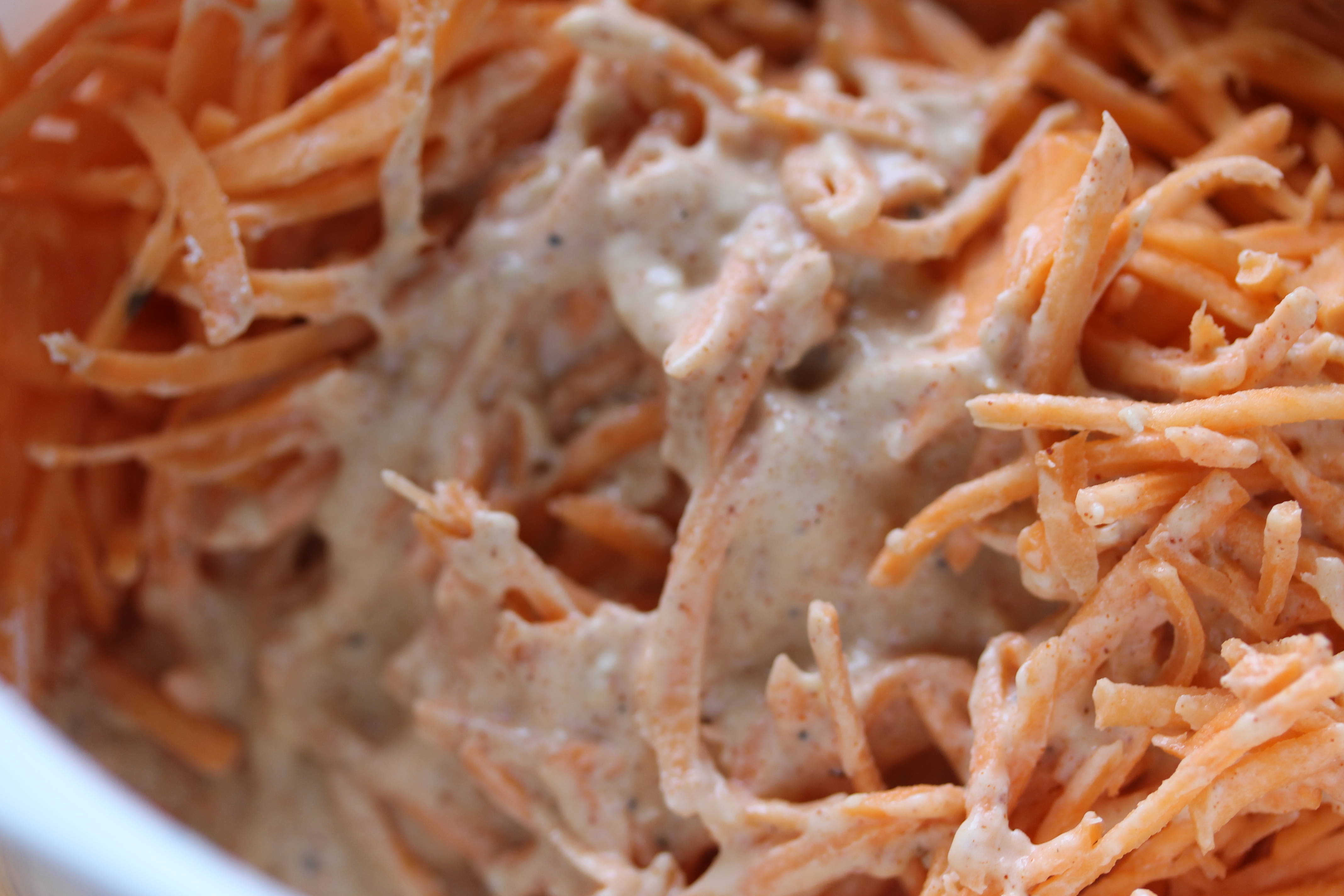 Ég byrjaði á að flysja sætu kartöfluna og rífa hana gróft. Mér finnst best að nota rifjárnið í matvinnsluvélinni því þá fæ ég nokkuð langar ræmur.