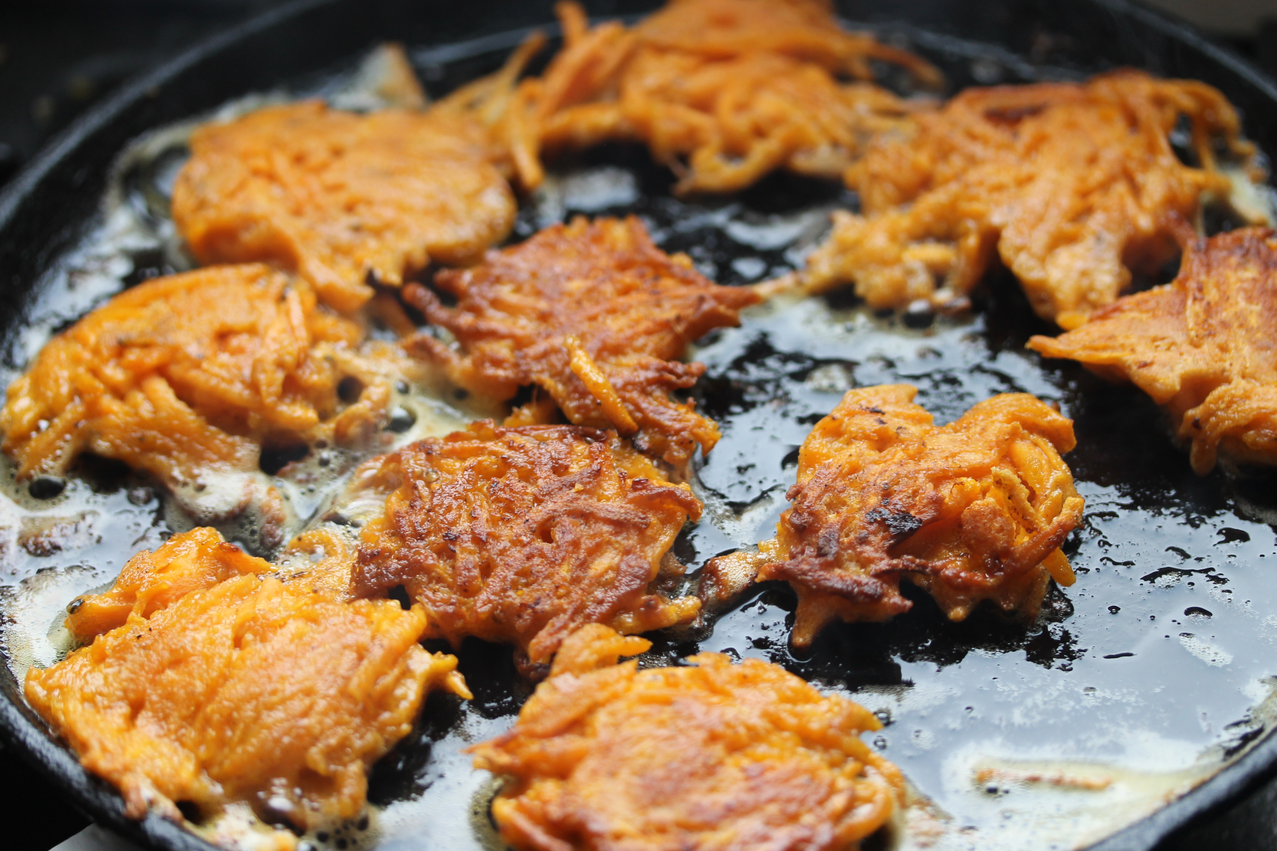 Svo hitaði ég 3-4 msk af ólífuolíu á pönnu. Setti kartöflublönduna á hana með skeið (ég notaði kúfaða teskeið) og bjó til litla klatta. Steikti þá við meðalhita í um 3 mínútur á hvorri hlið, eða þar til þeir voru orðnir meyrir og fallega gullinbrúnir.