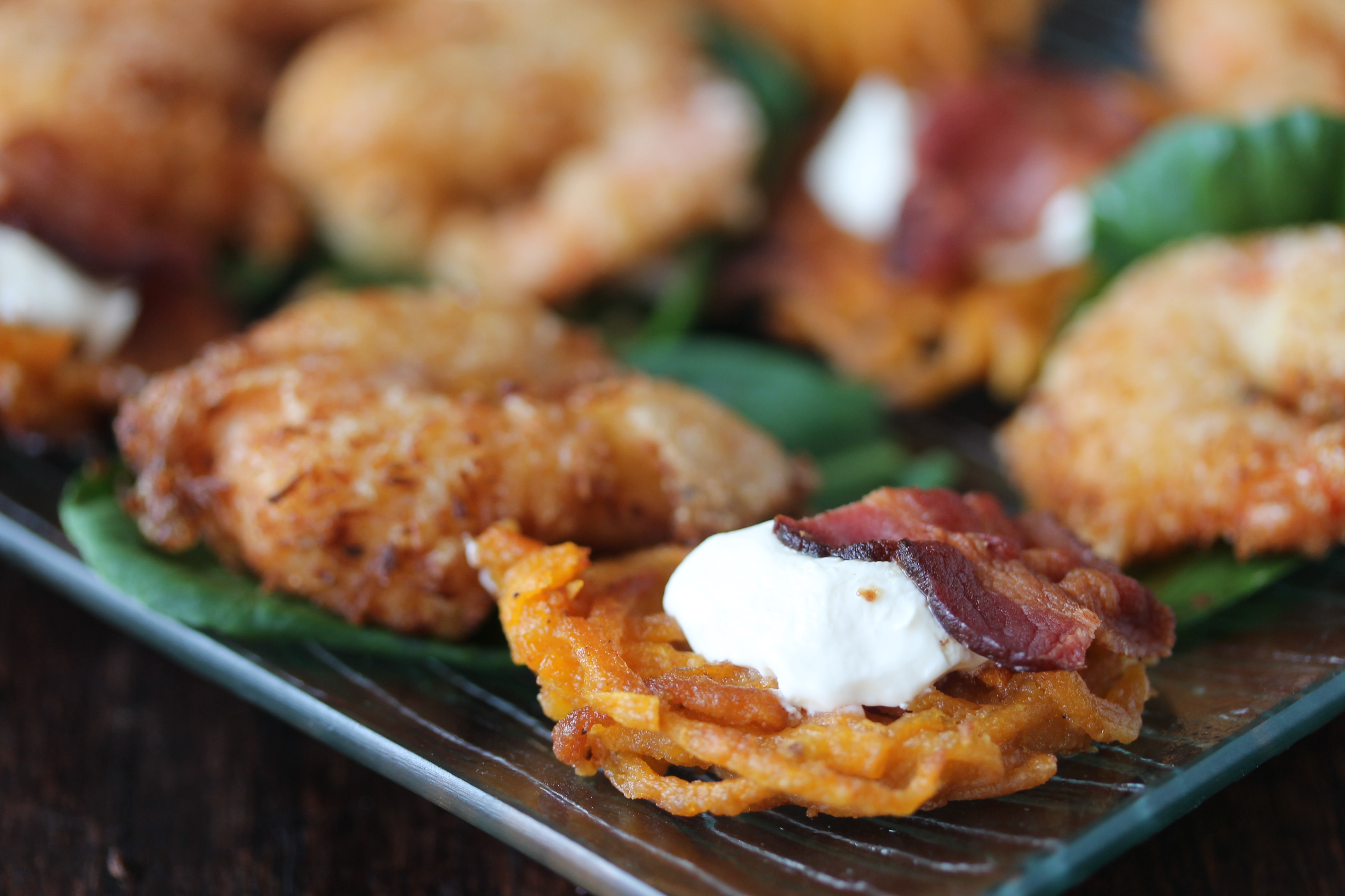 Ég notaði 400 g af sætri kartöflu, 1 egg, 5 msk af rjóma (má vera mjólk), 80 g af hveiti, 1 tsk af paprikudufti, 1/2 tsk af salti. 1/4 tsk af nýmöluðum pipar og ólífuolíu til að steikja upp úr. Og sýrðan rjóma og beikon, en meira um það seinna.