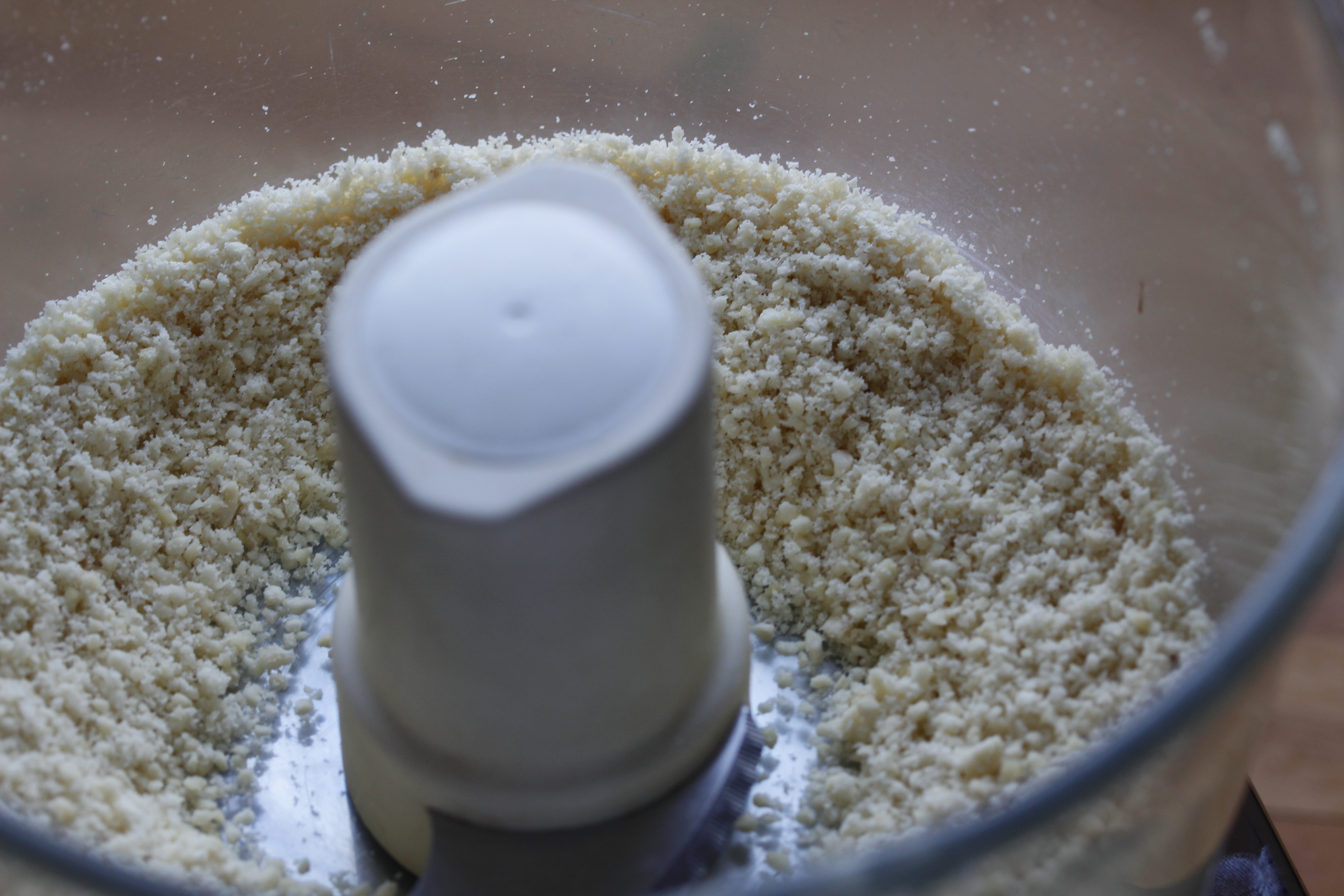 … og lét hana ganga þar til möndlurnar voru fínmalaðar. Ekki alveg í duft kannski, en býsna fínmalaðar samt. Hellti svo möndlumjölinu í skál.